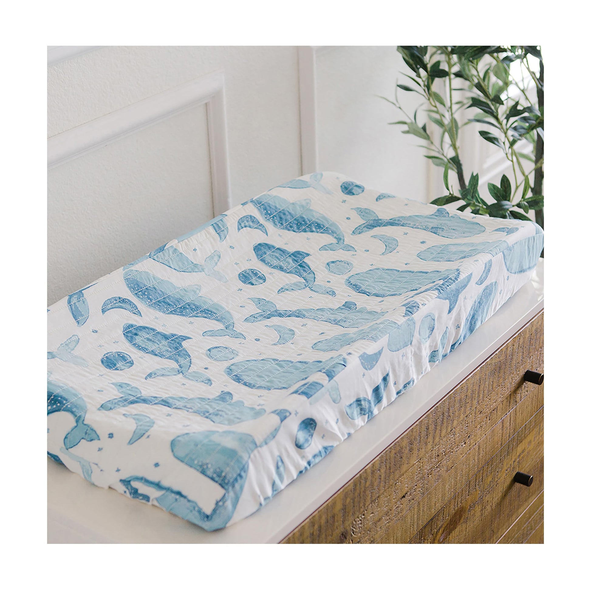 Crane Baby Quilted Changing Pad Cover with Animal Print, Breathable Cotton Sateen, Fits Standard 16”X32” Pads, Ocean Whale Blue
