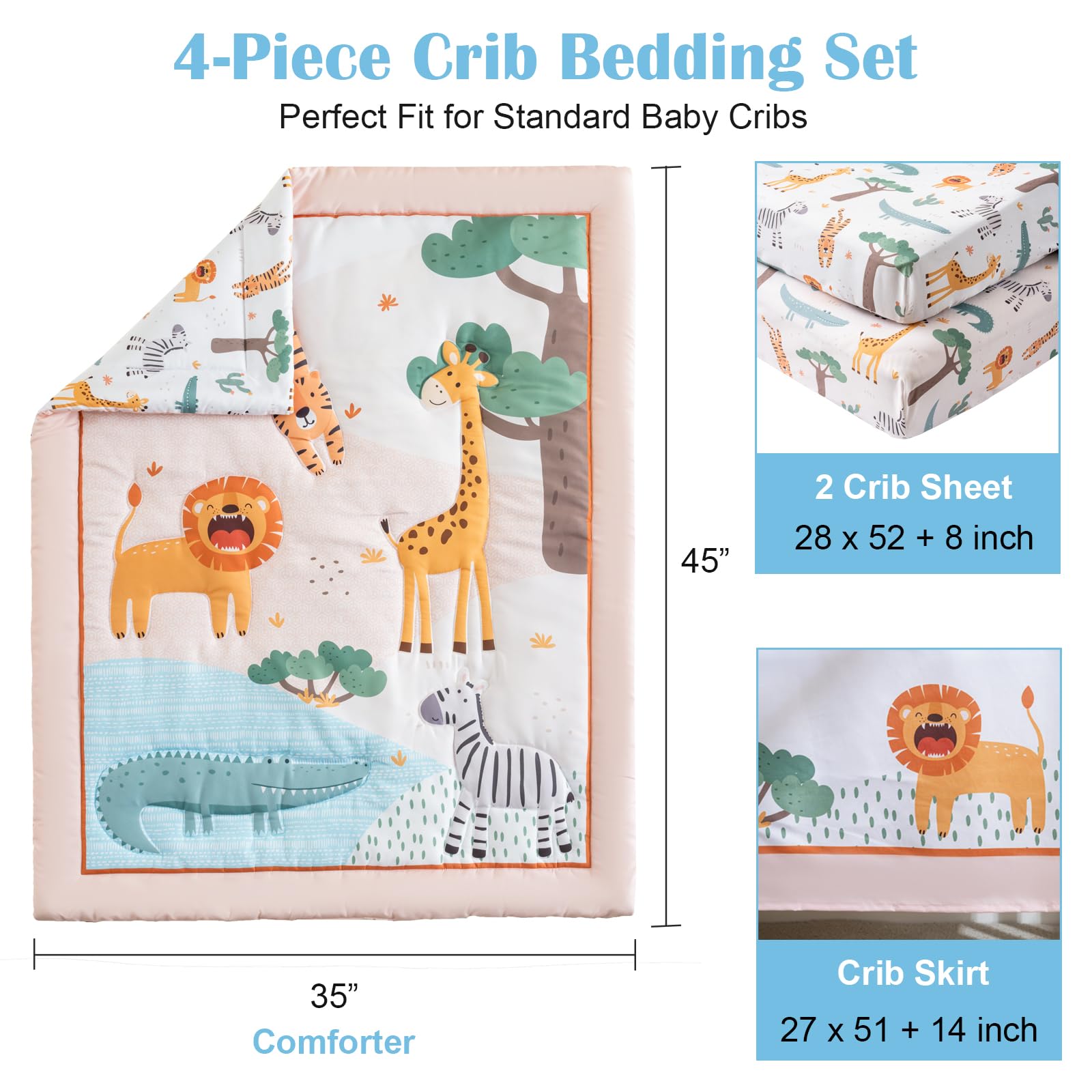 Crib Bedding Set 4 Pieces – Includes Comforter, 2 Fitted Sheets for Easy Changing, Crib Skirt – Soft, Breathable, Machine Washable – Fits Standard Crib Mattress – Baby Nursery Set for Boys & Girls