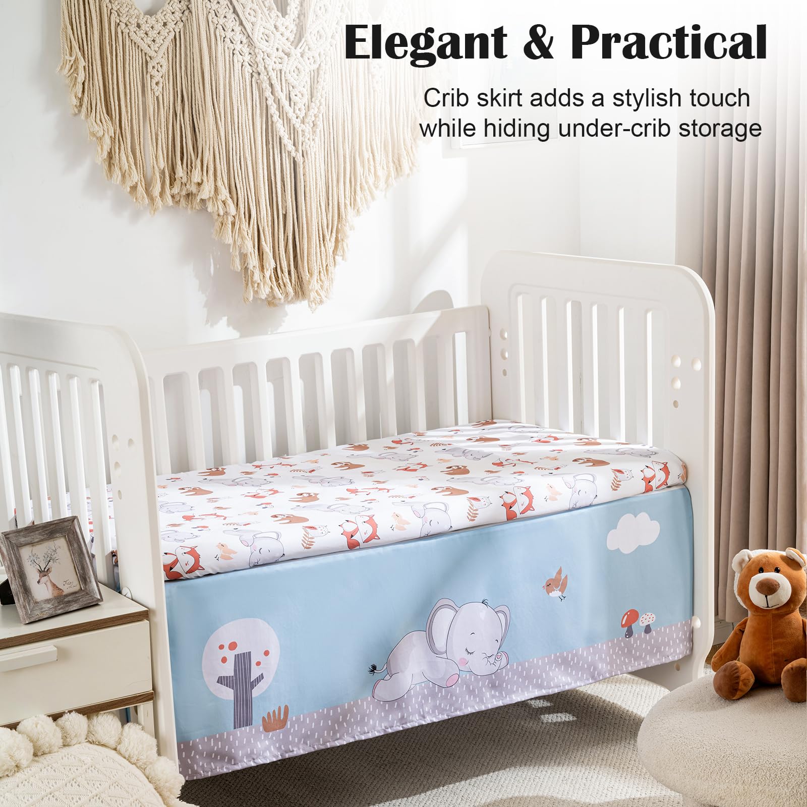 - Streamlined Bed Skirt Design – The 14” drop bed skirt discreetly covers under-crib storage with a tailored look, complementing any nursery decor style effortlessly.