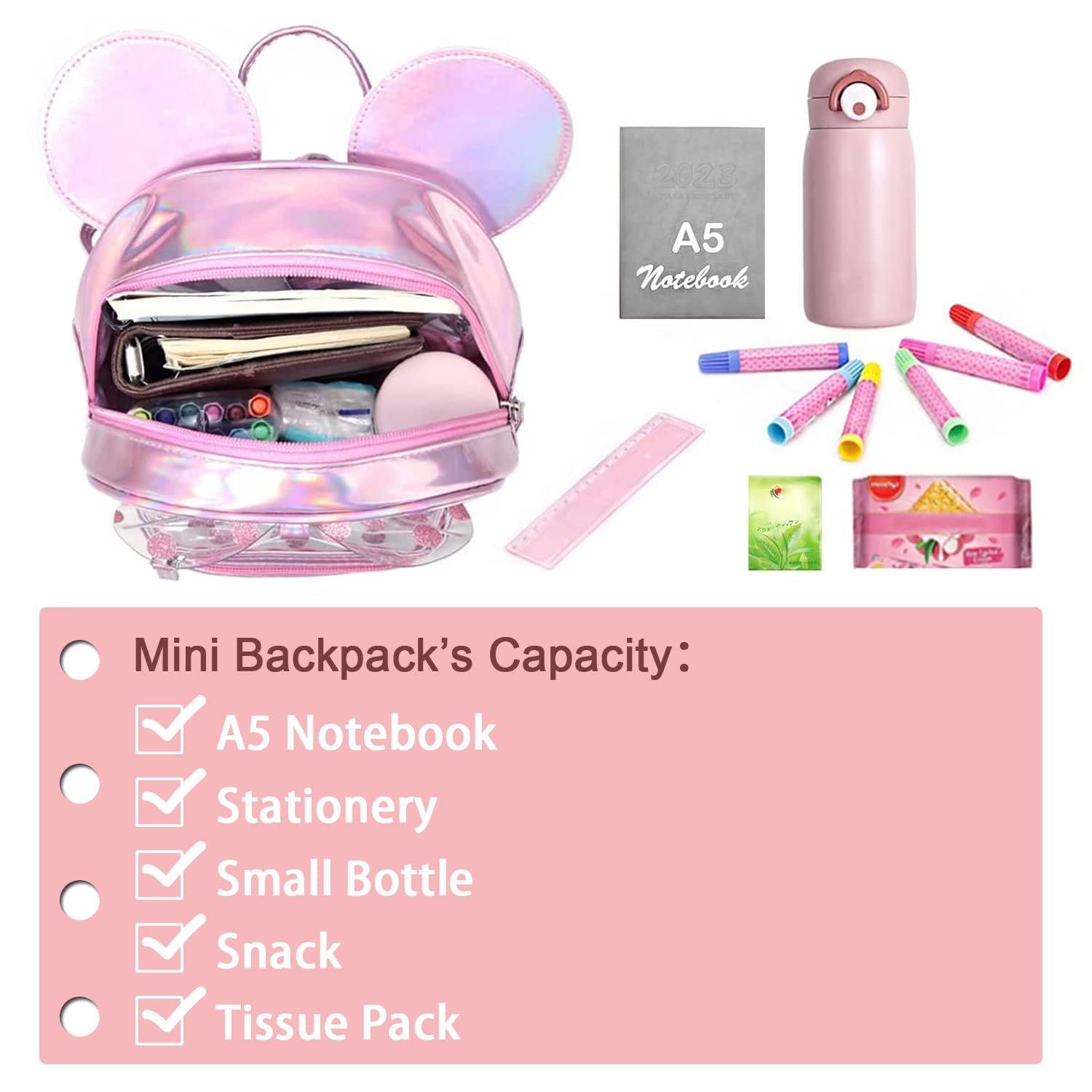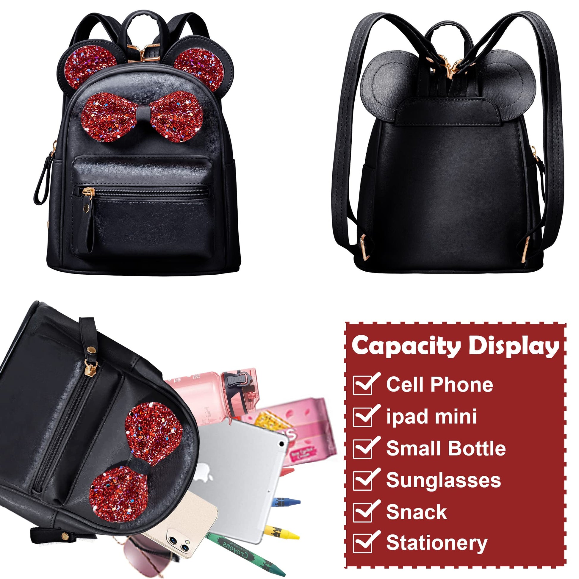 - This kids backpack is made of good PU Leather in contrast color bowk and mouse ears, light weight and durable.