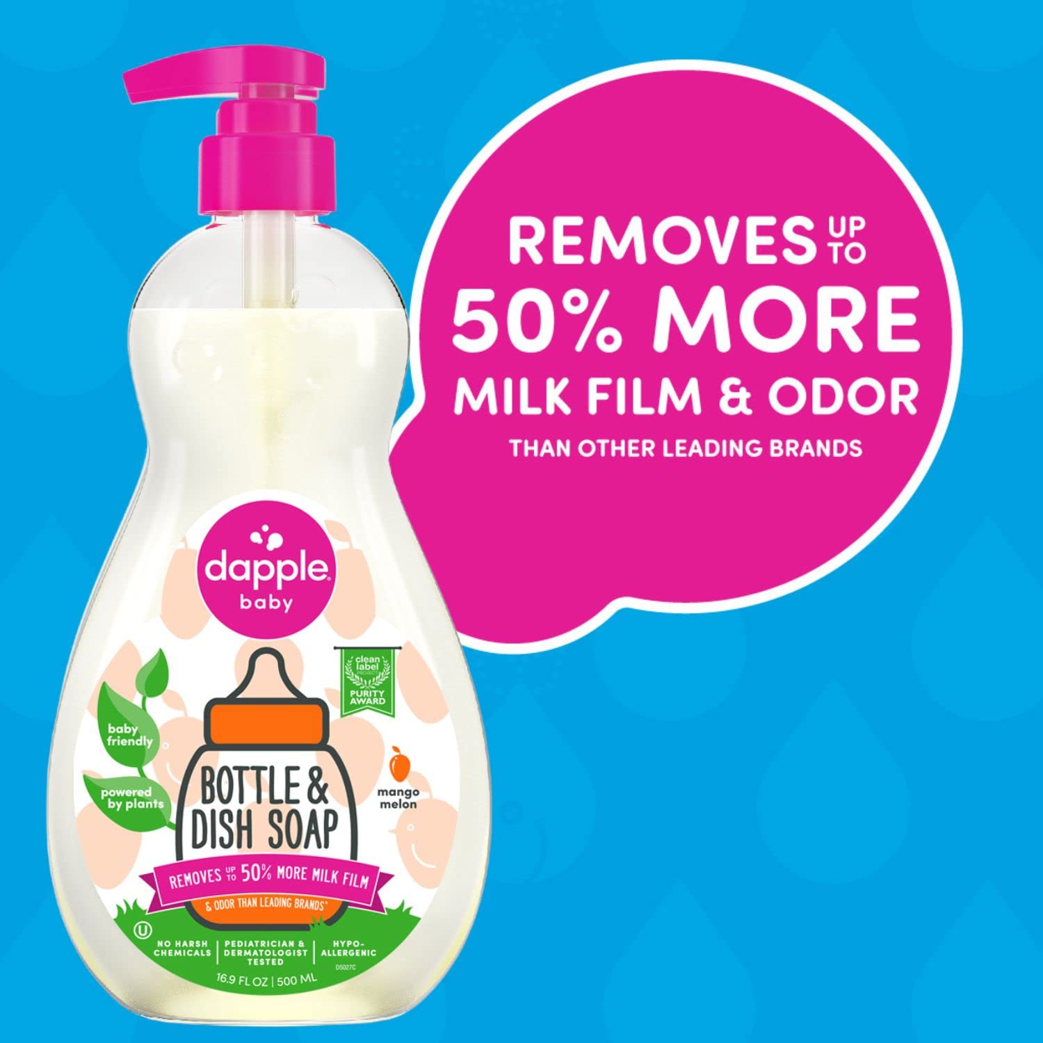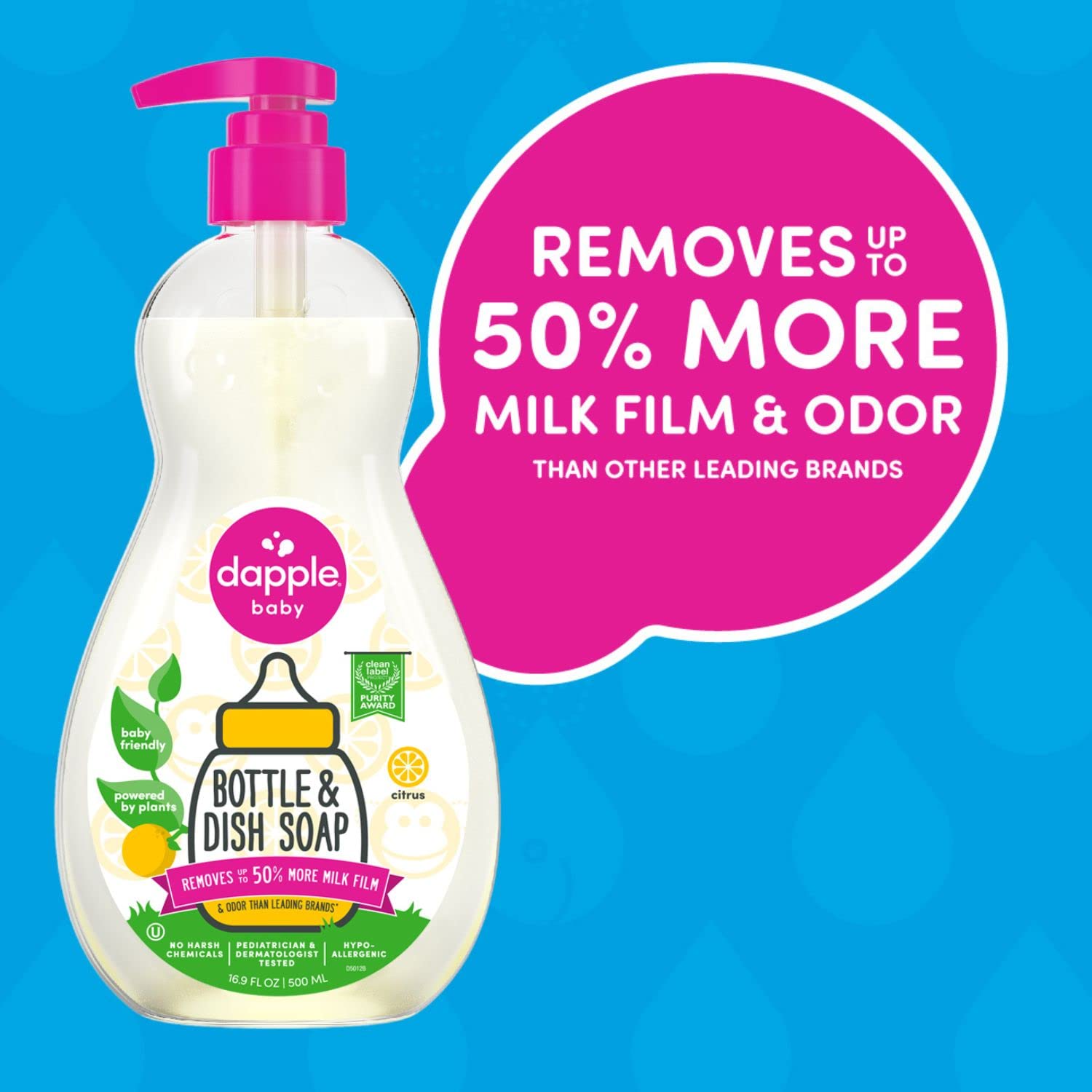 - MULTI-USE AND SPECIALLY FORMULATED TO CLEAN RESIDUE FROM MILK AND FORMULA: Dapple Baby Bottle & Dish Soap is specifically formulated to clean fat, protein and carbohydrate residue, which is commonly found in baby bottles with milk and formula film, and more broadly when cleaning the full family’s dishes.