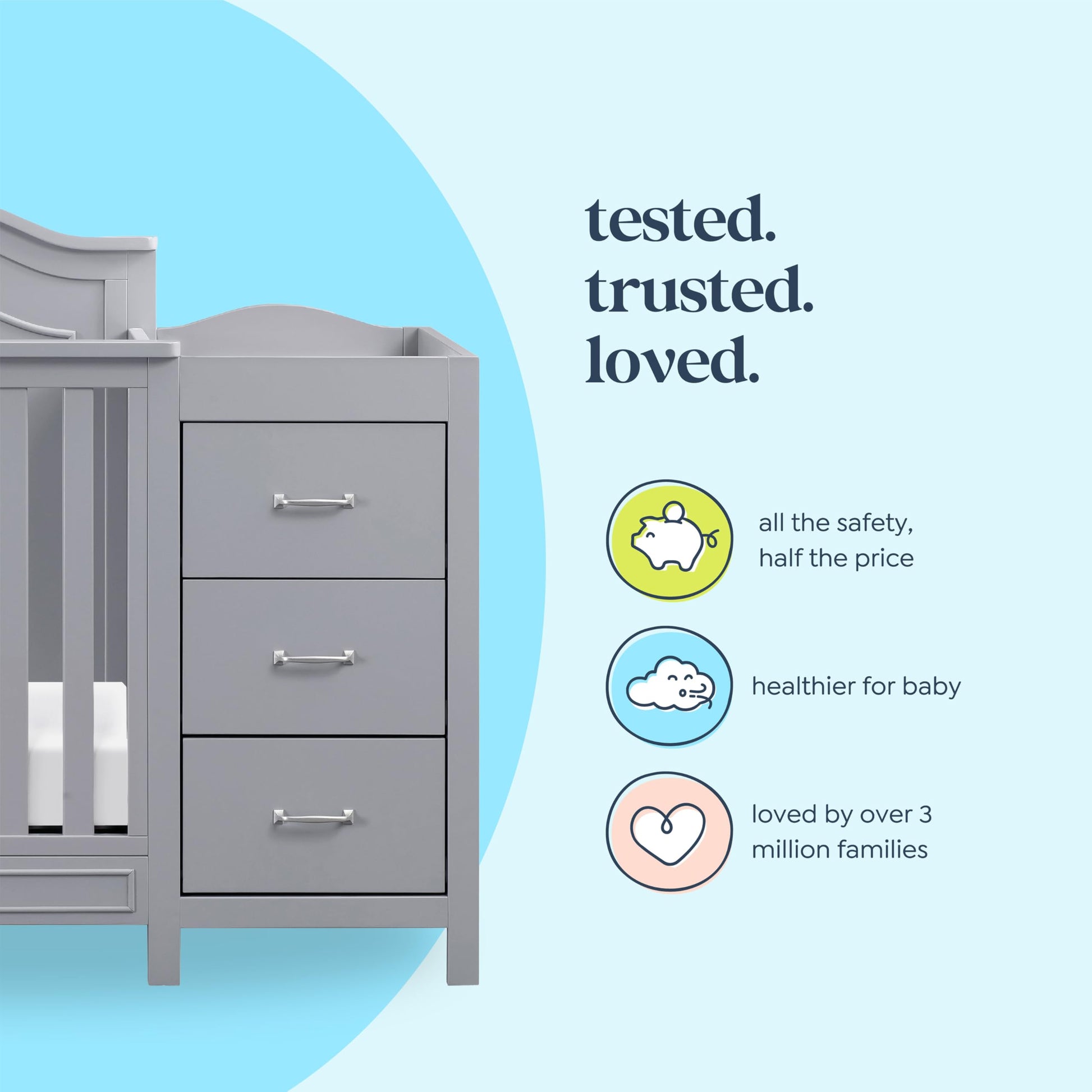 - GREENGUARD Gold Certified: Our mini crib and changing table combo is tested for over 10,000 chemical emissions & VOCs for healthier air. Built with sturdy New Zealand pine & a baby-safe finish paint, it creates a clean environment for your little one.