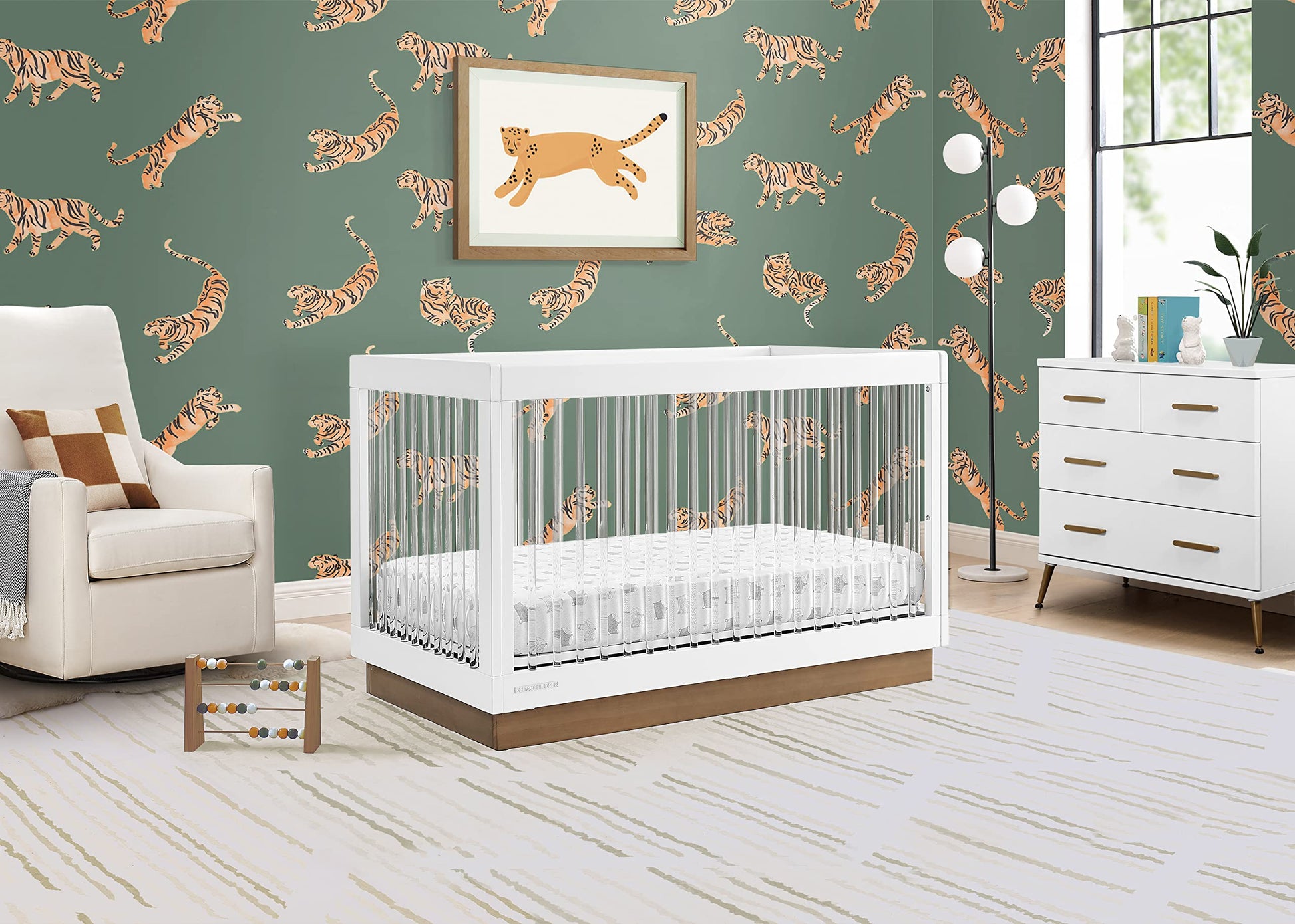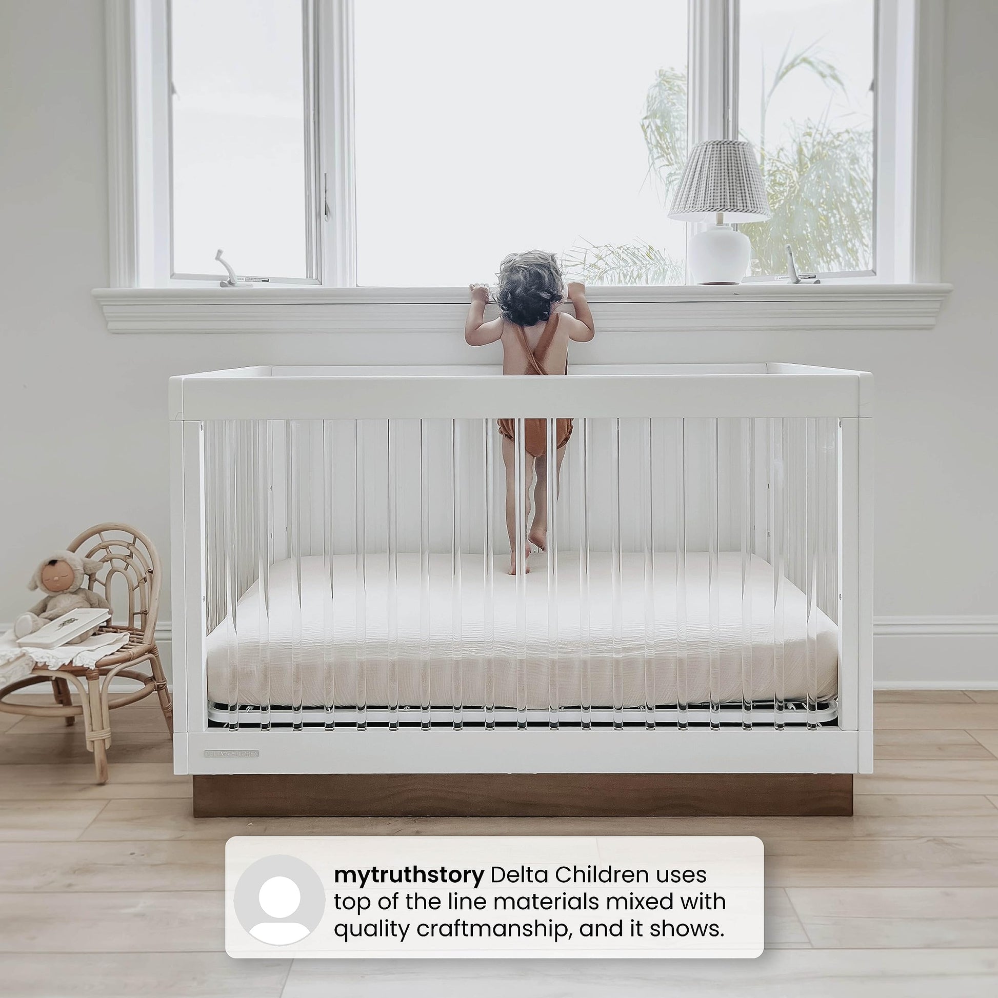 Clearly, you can see why the James Acrylic 4-in-1 Convertible Crib by Delta Children is the only choice for your baby’s nursery. Recyclable and non-toxic clear acrylic spindles around all four sides create an open and airy look while also providing the best view of your baby. To finish the look, the Acorn-colored stained base and painted frame, made from sustainable New Zealand pine wood, provide the perfect contrast. A one-of-a-kind design for your baby’s stylish bedroom, the crib’s adjustable mattress support allows you to lower the mattress height as your baby grows. Modern and functional, this crib includes all needed conversion rails which allows you to seamlessly convert from crib to toddler bed, daybed or sofa. Plus, it’s GREENGUARD Gold Certified, which means it’s built to contribute to cleaner air for a healthy home. Available in Bianca White with Acorn and Midnight Grey with Acorn. Easily mix, match, and layer with other items from Delta Children.