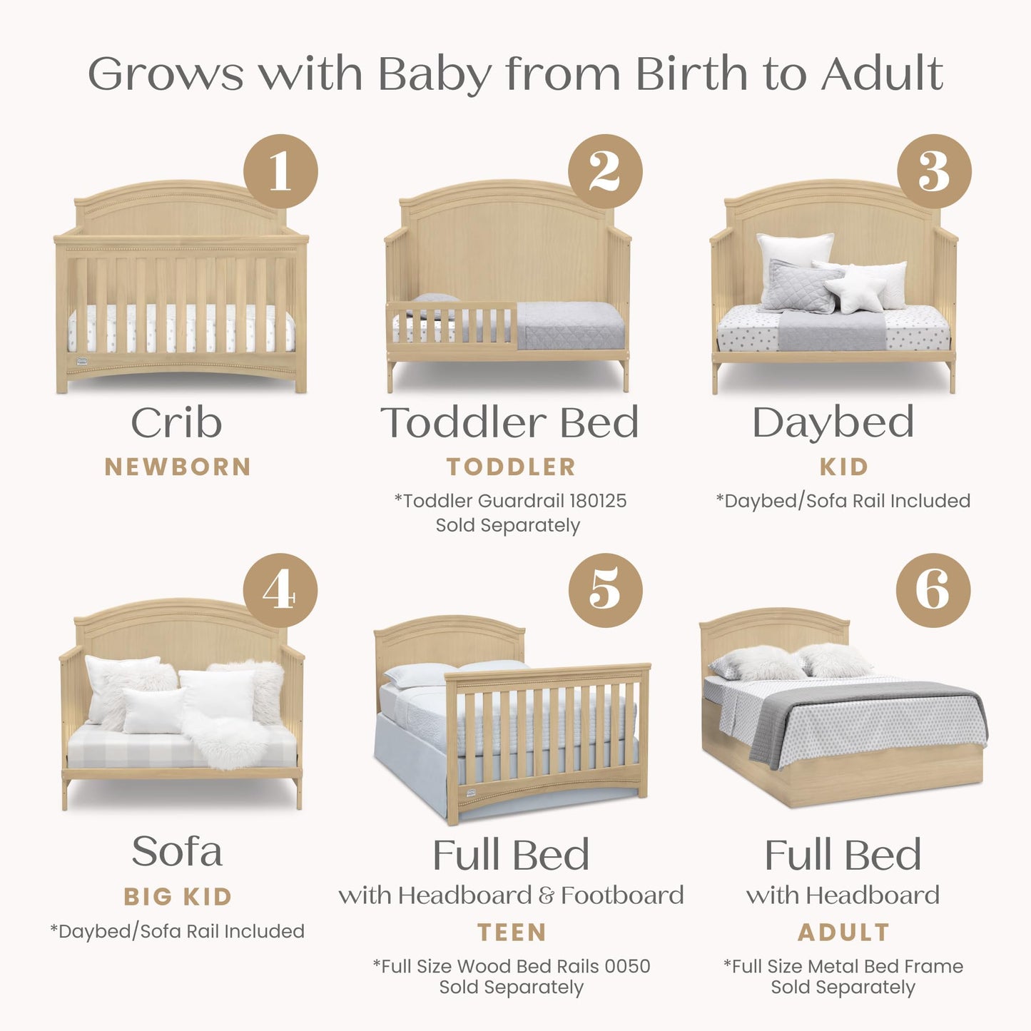 - CONVERTIBLE CRIB: Converts from a crib to a toddler bed, daybed and full size bed with headboard & footboard (Daybed Rail included; Toddler Guardrail #180125 and Full Size Bed Rails #0050 sold separately)