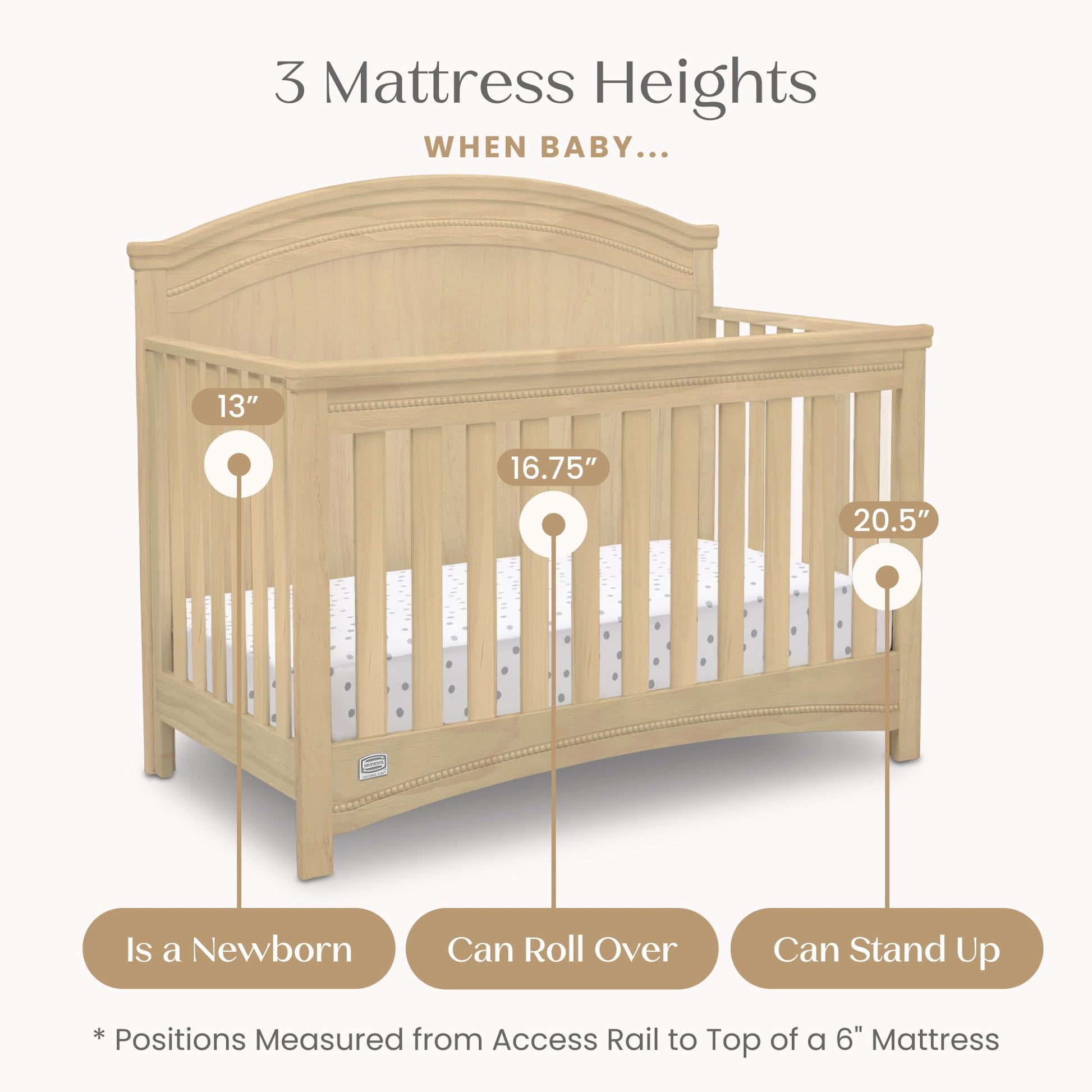 - GROWS WITH BABY: The 3 position mattress height adjustment on this crib allows you to lower the mattress as your baby begins to sit or stand