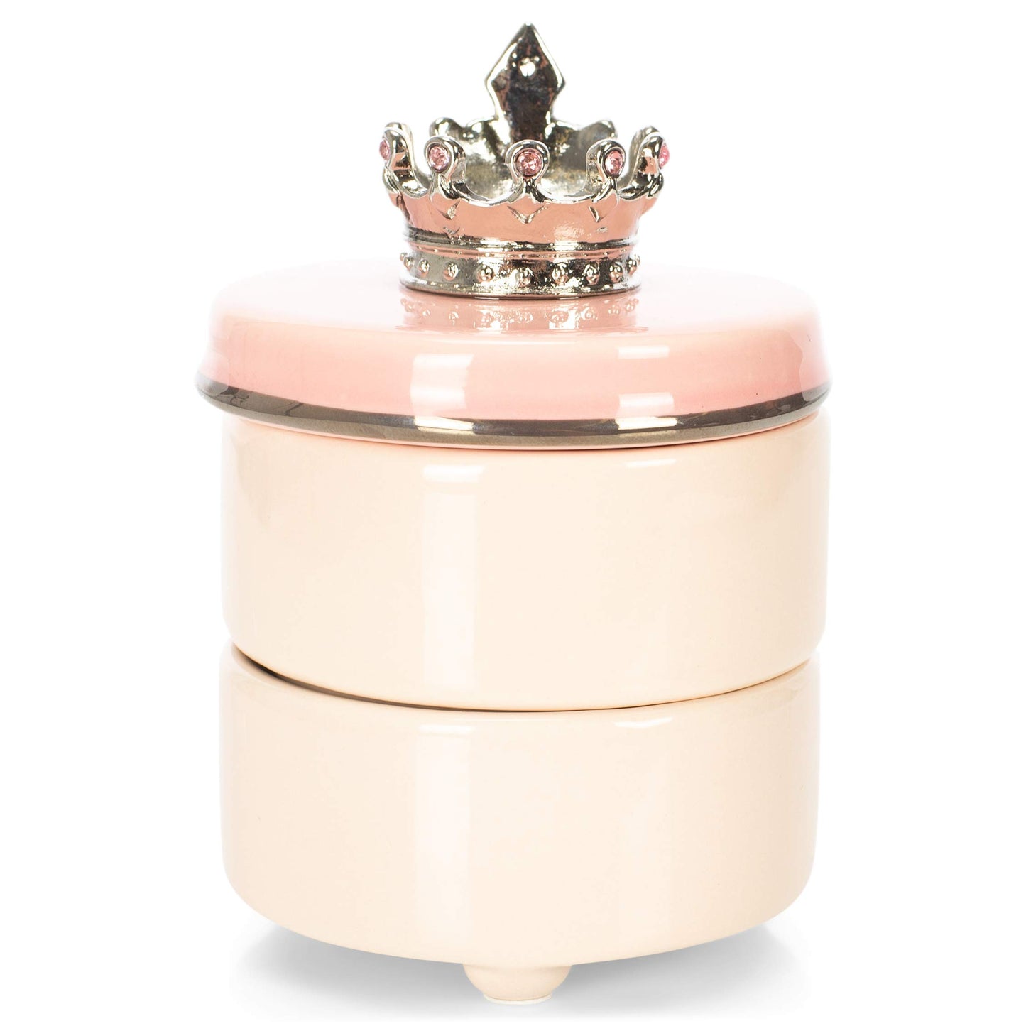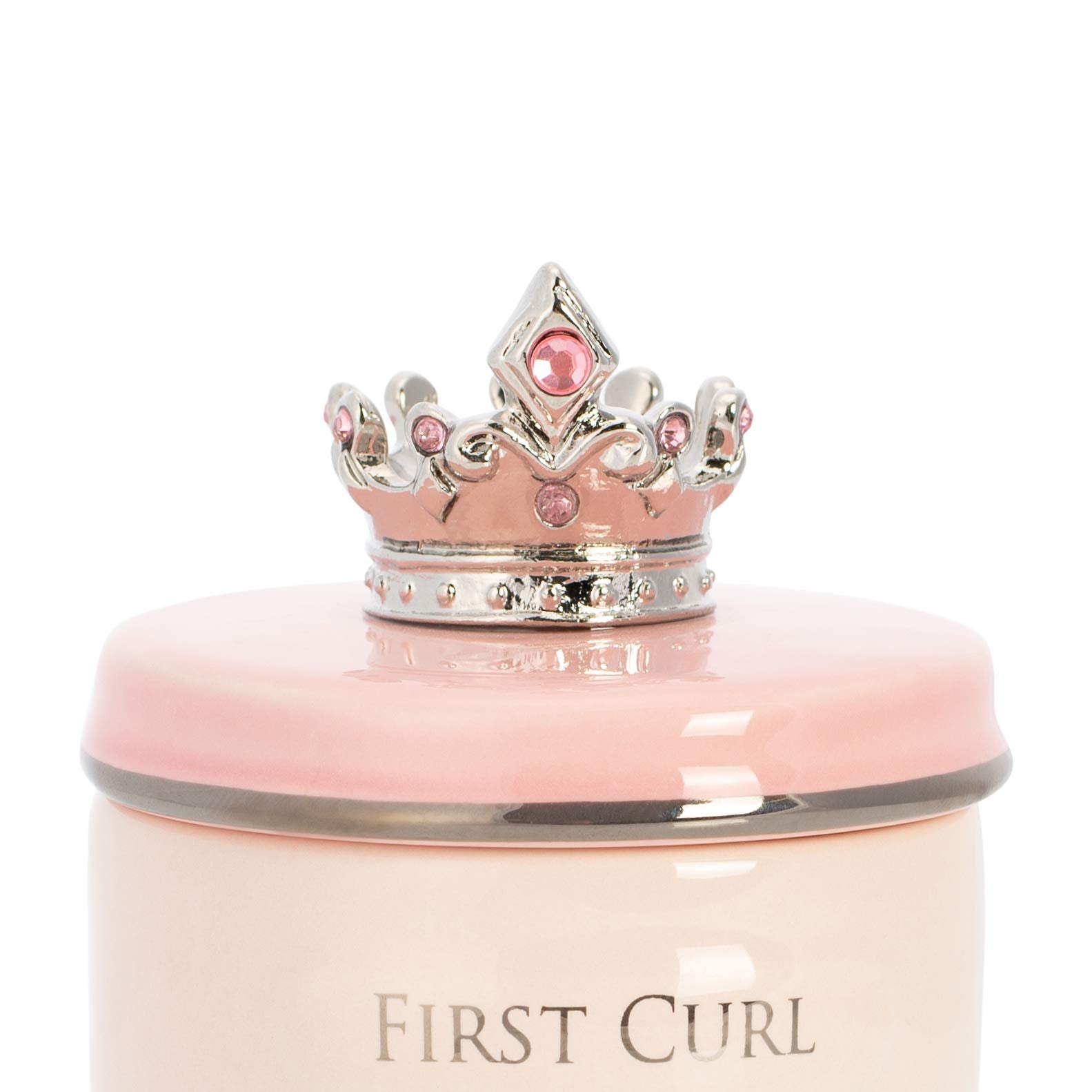 • Keepsake box with stackable compartments offers a safe place to keep your childs first tooth and first curl. Lid is adorned with a silver toned crown encrusted with pink jeweled beads.
