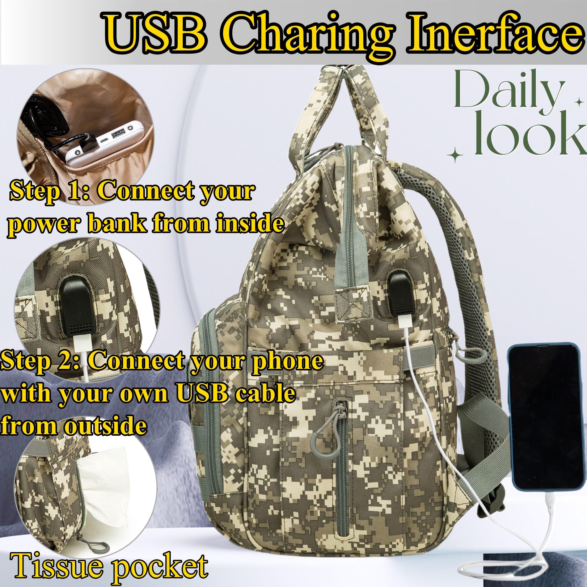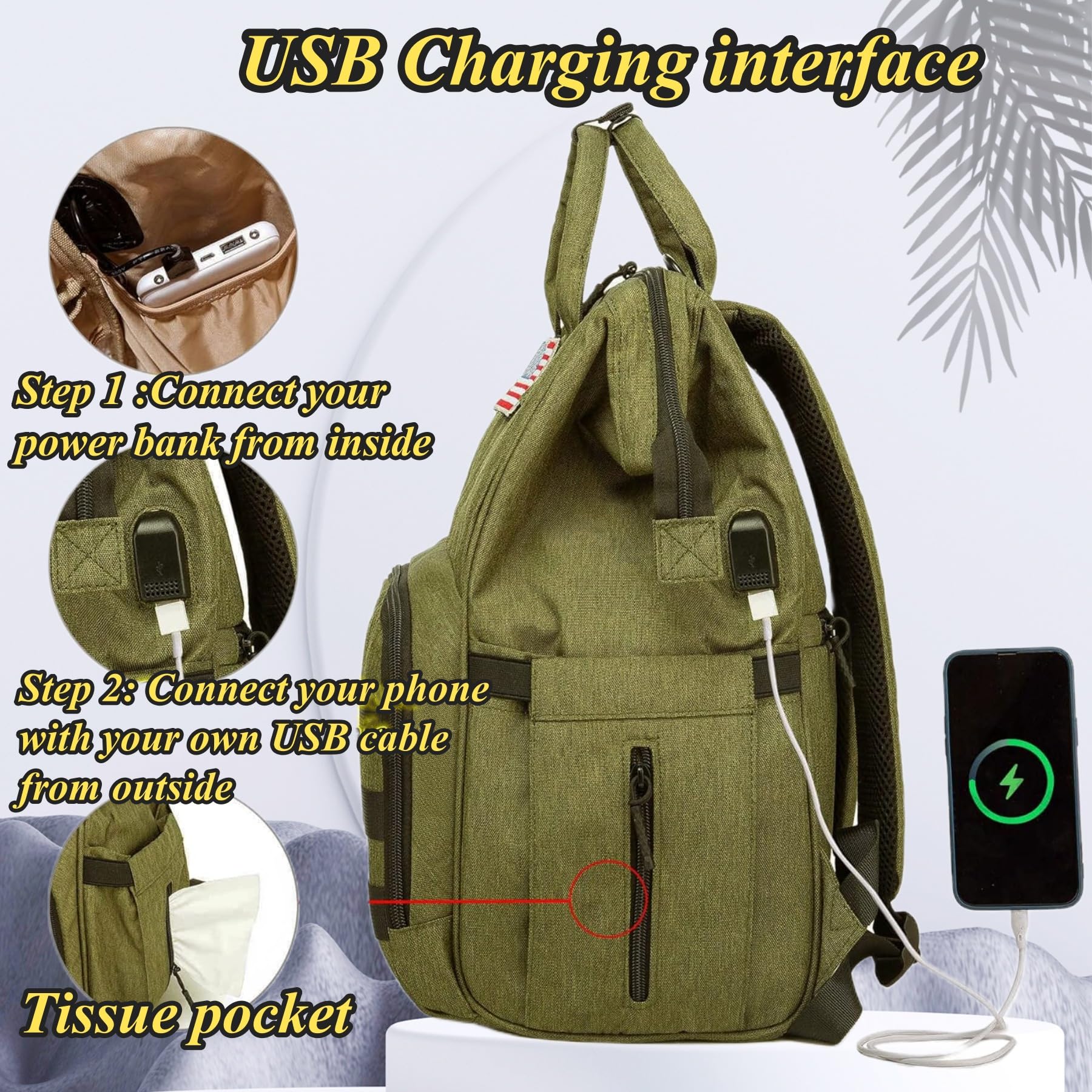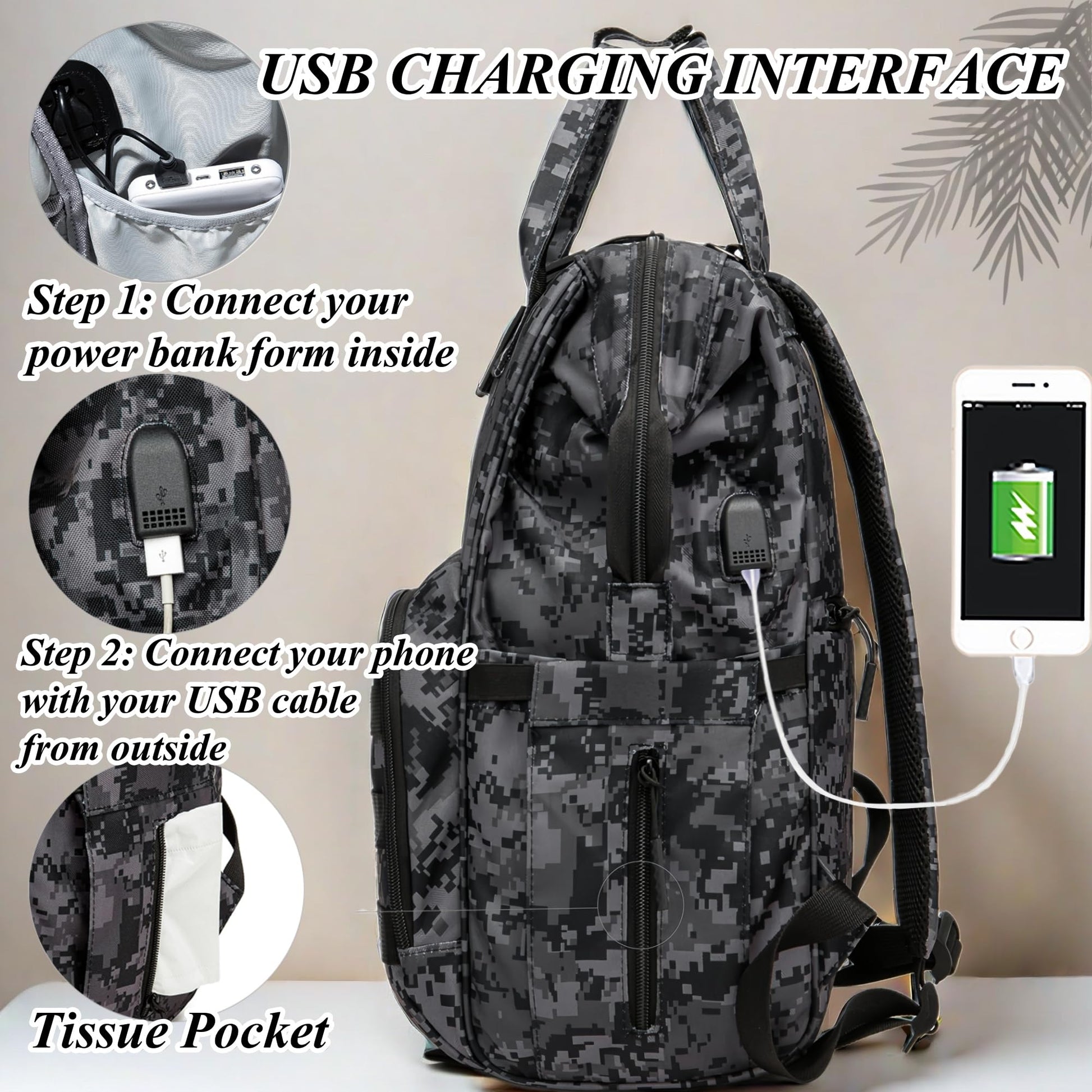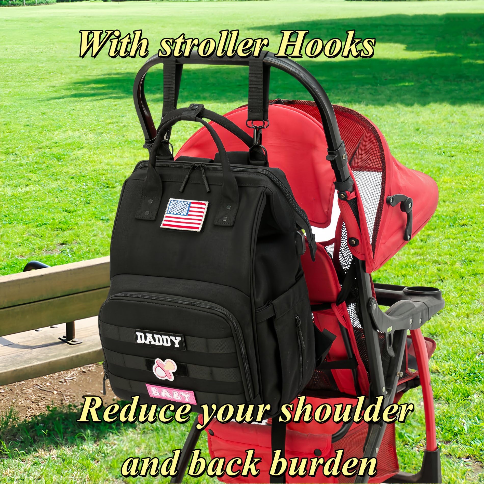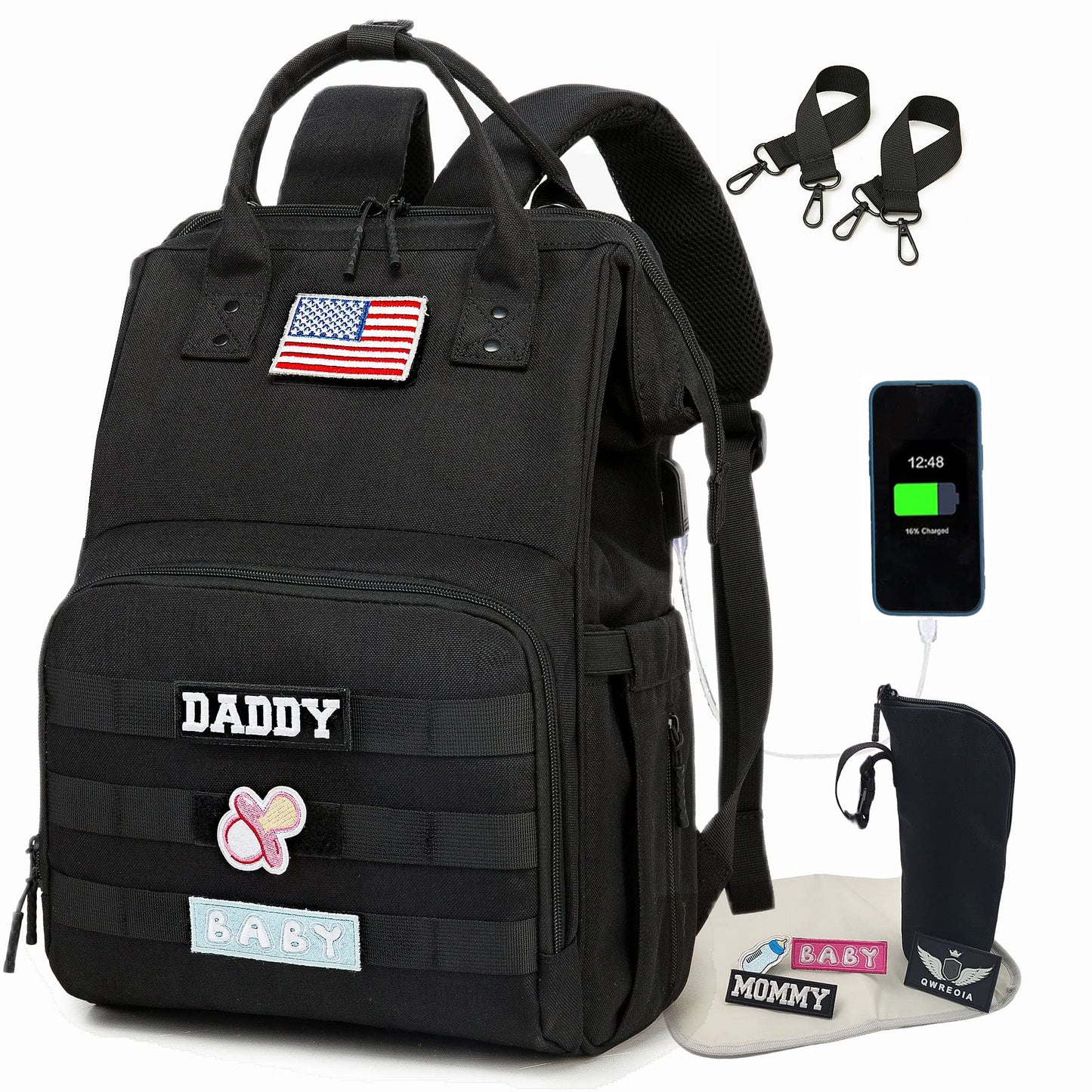 Diaper Bag Backpack for Dad and Mom with USB Charging Port Stroller Straps and Insulated Pocket,army military Travel Nappy Backpack for Daddy/Mommy (Black)