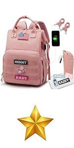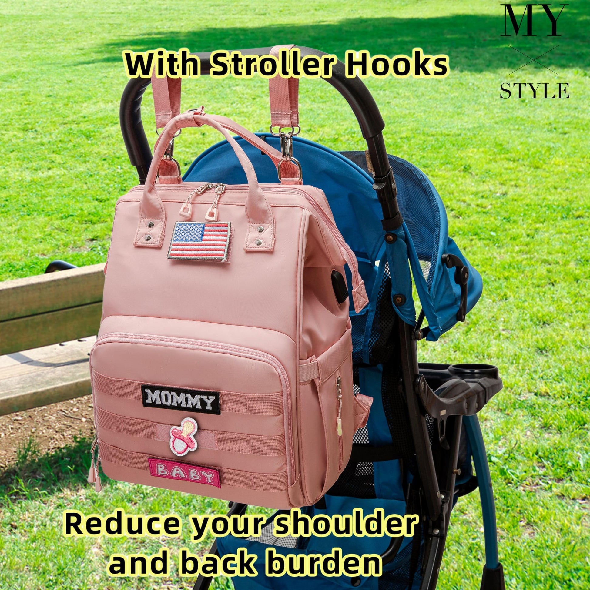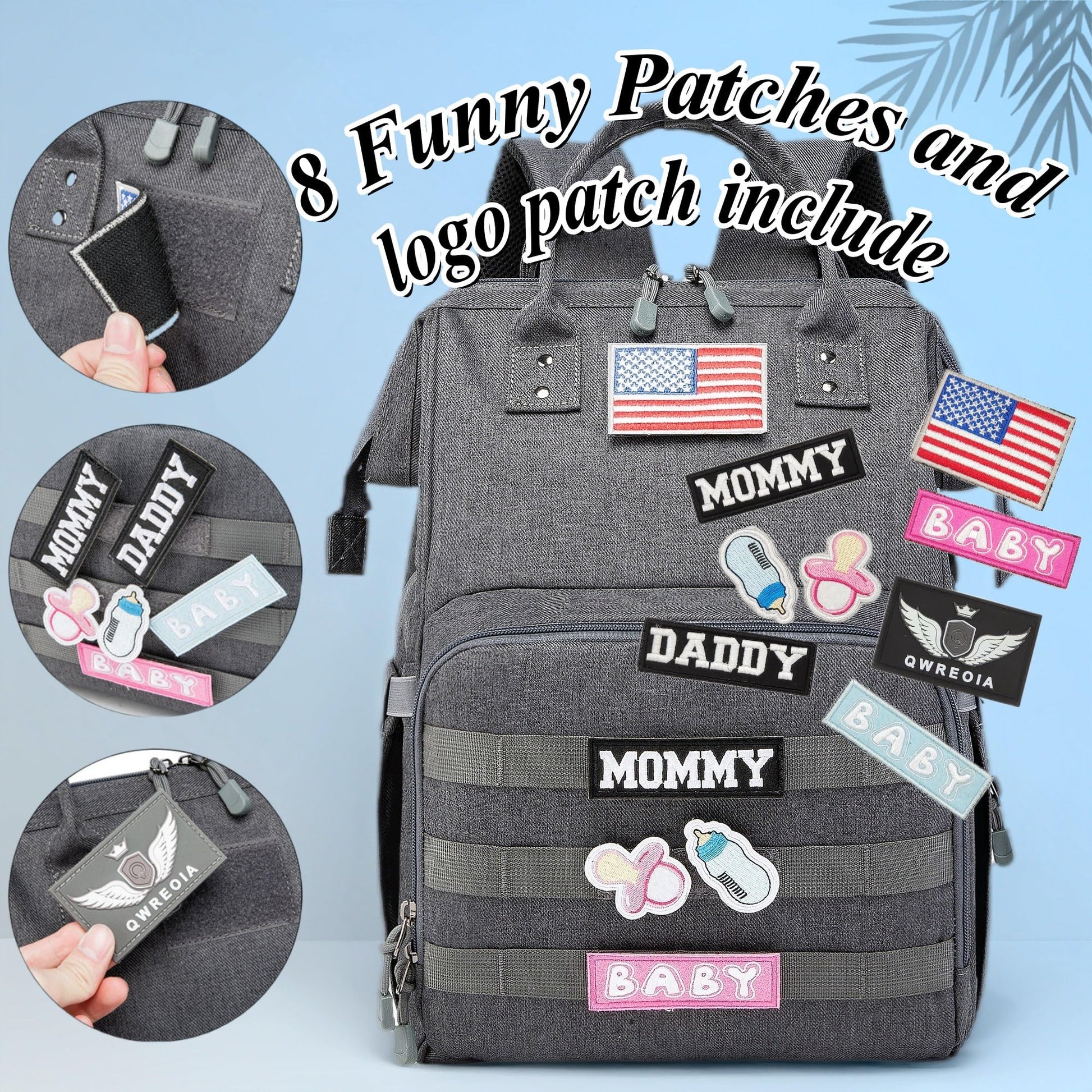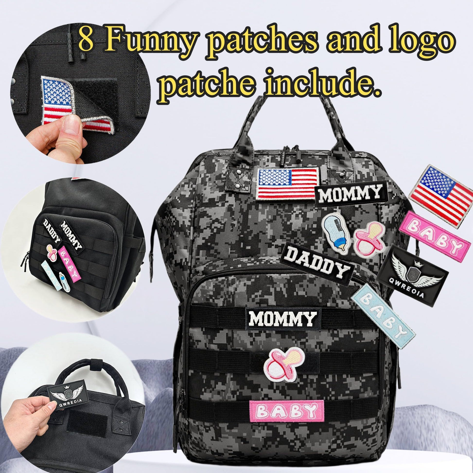 Creative funny Patches Design: a unique and fun-designed diaper bag. It features three horizontal bars on the front, each equipped with magic patches that can be personalized with "daddy," "mommy," and "baby." This innovative design allows parents to unleash their creativity by attaching stickers, or other fun patterns, bringing a sense of relaxation and joy to the family.