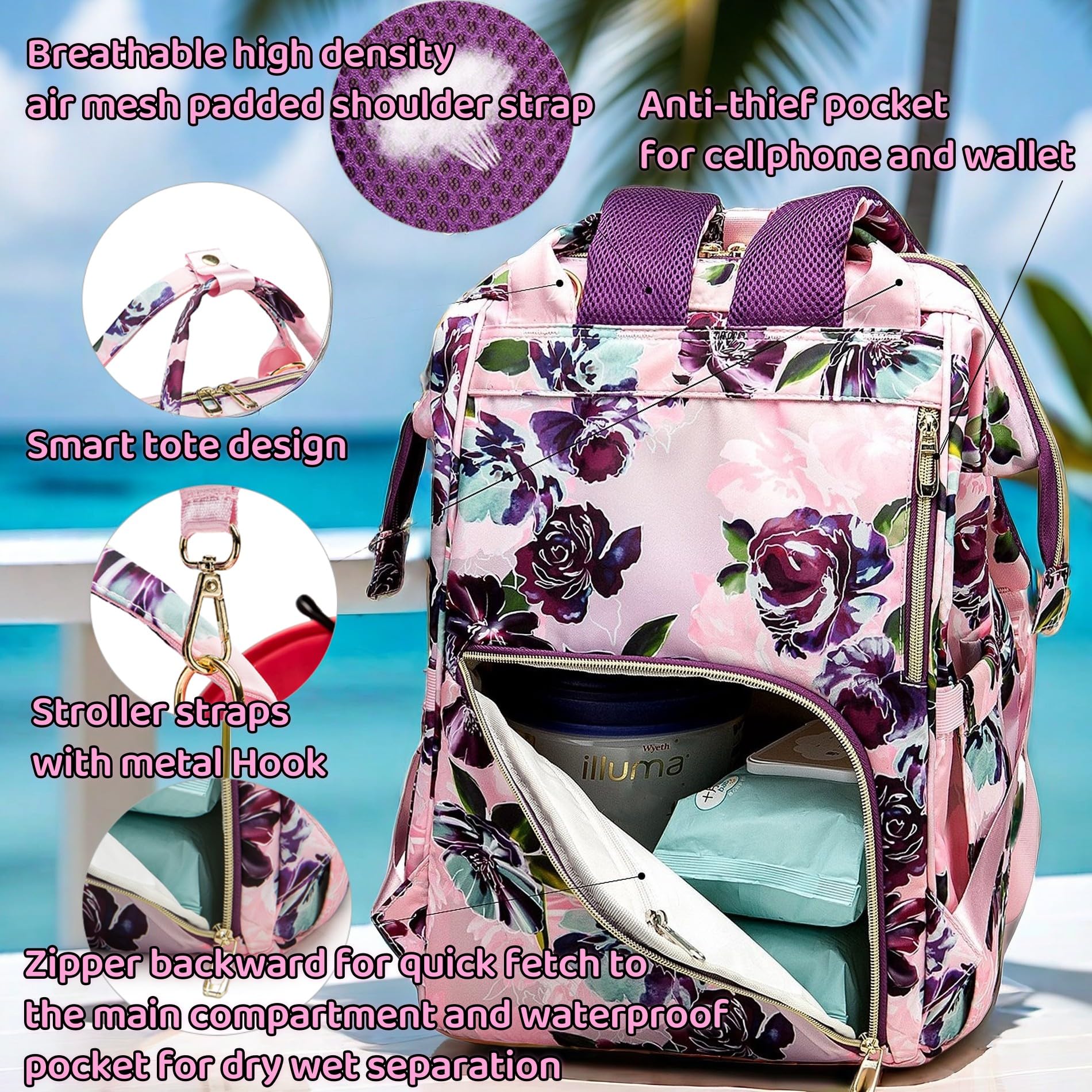 Diaper Backpack Size:17.80*12.80*6.5 inches,Durable Light Weight Waterproof Design Large Capacity:25L Total 14 Multifunction Pockets Include 3 Insulated Pockets for Milk and Water Bottles,2 Water Resistant Pockets for Wet Clothes and Diapers,1 Back Anti-theft pocket for Phone and Other Valuables,2 side Elastic Pockets etc.,,keep perfectly organized and compact.