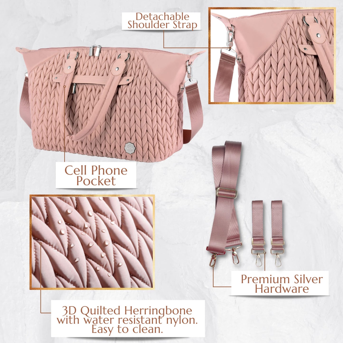 - Made with water resistant nylon. Forget the unisex bag, our diaper bag designed just for mom,the 3D quilting herringbone adds a lightway and fashionable touch to your wardrobe. The dusty rose, ash blue, ash green is decent not bright, this mommy bag brings a stylish and mordern flair to all your looks.