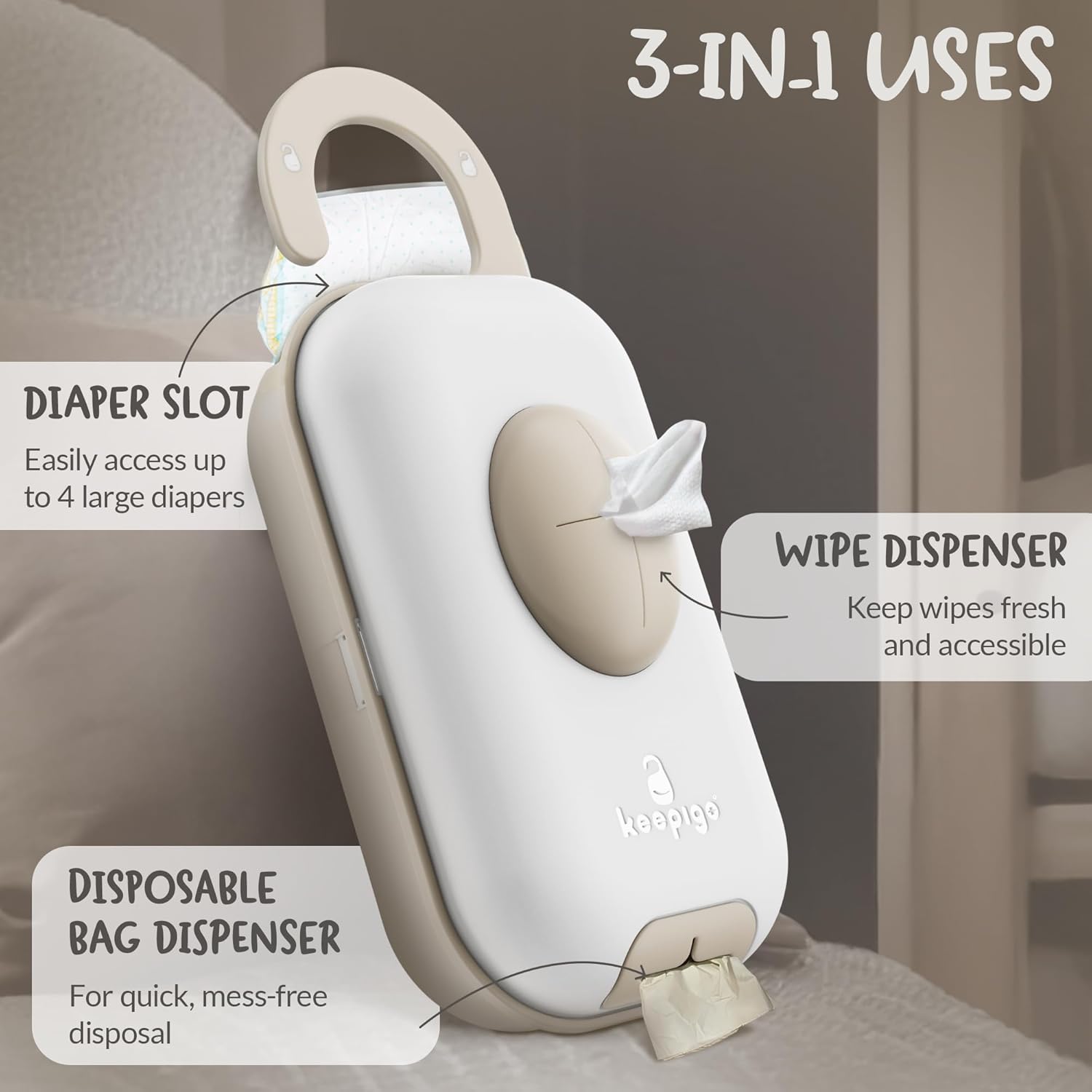 - 3-in-1 DIAPER BAG ESSENTIALS: Meet the Keepigo Diaper Bag Wipe Dispenser, the ultimate baby travel essential. This compact, toddler break-proof diaper caddy organizer combines a baby wipe holder, diaper dispenser, and disposable diaper bag dispenser. Perfect for newborns and toddlers, it's ideal for toddler travel essentials or a baby changing station at home.