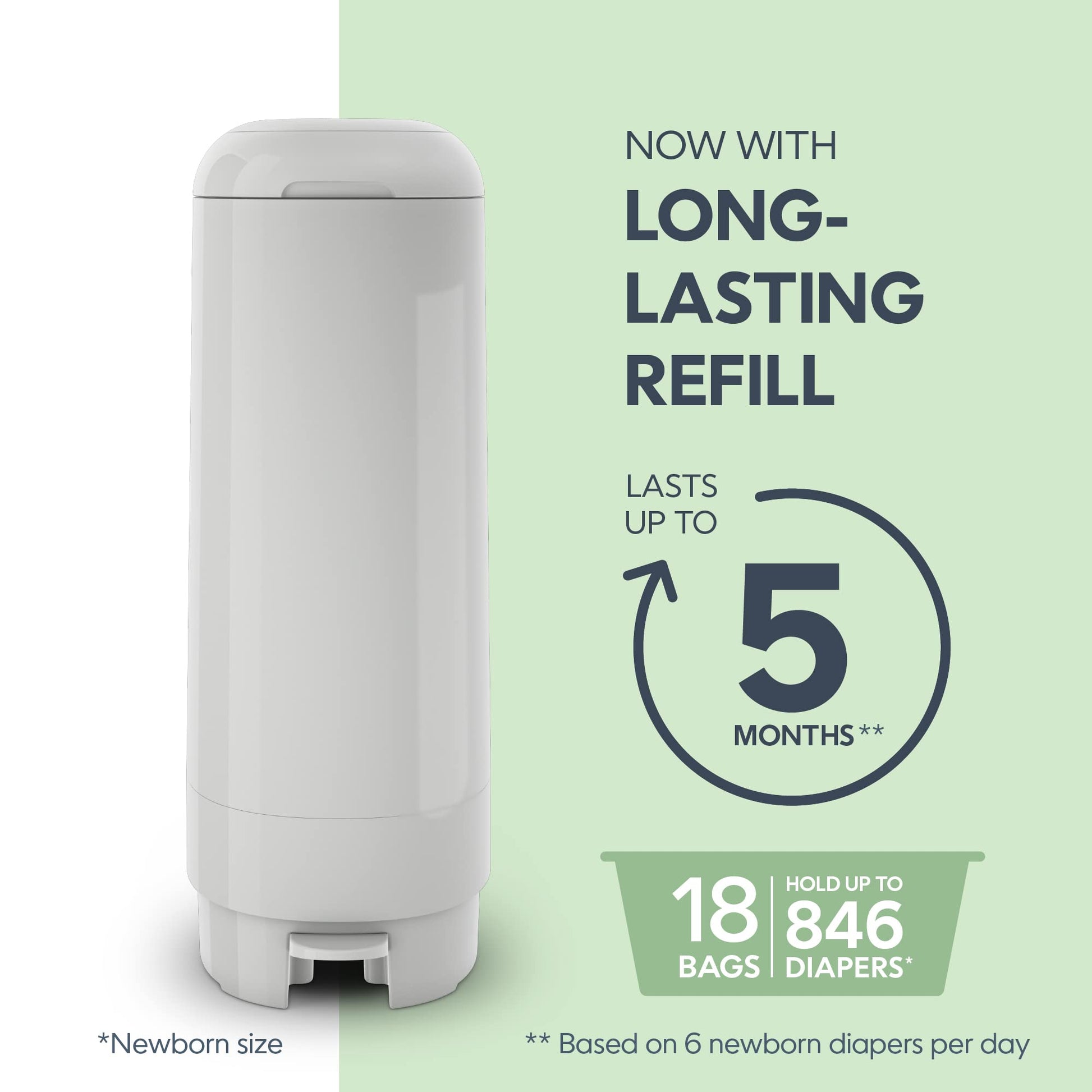 - LONG LASTING REFILL: The pail comes with an Easy Roll refill that holds up to 846 newborn-sized diapers which estimates to last up to 5 months.