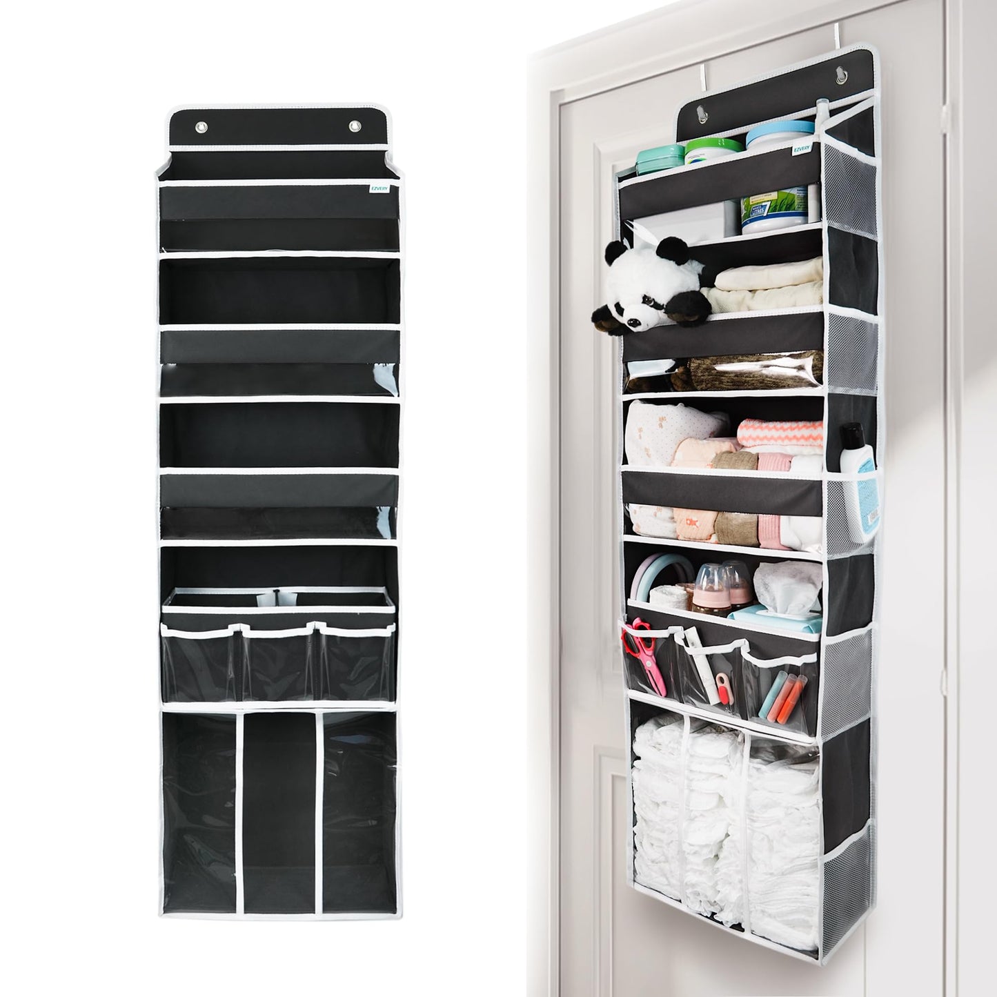 - CREATIVE PATENT DESIGN: This is not only a door hanging storage organizer, but also with an additional movable baby diaper storage caddy . The storage caddy has built-in partitions that can be divided into areas for storing daily necessities,such as bath care, clothing, diapers, baby moisturizers, wet wipes, breast pumps, and accessories. There are three PVC pockets on the outside of the nursery storage caddy for storing small items such as nail clippers, pacifiers, small toys, etc. The storage caddy can be easily removed from the hanging organizer and placed next to the bed for convenient use during late night feeding.