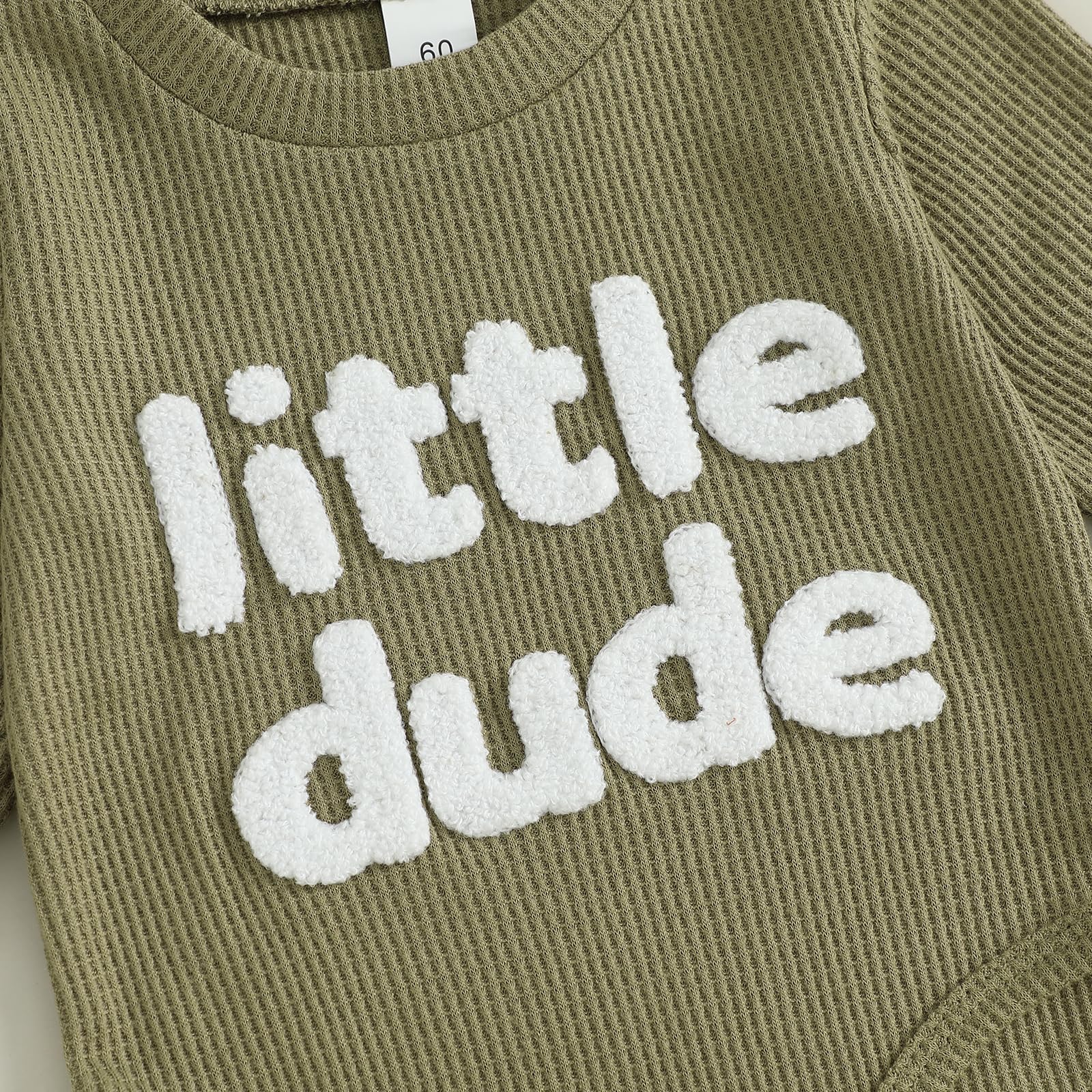 Baby Boy Fall Outfits Mamma's Boy Little Dude Letter Embroidered Long Sleeve Romper Solid Elastic Waist Pants 2 Piece Set
