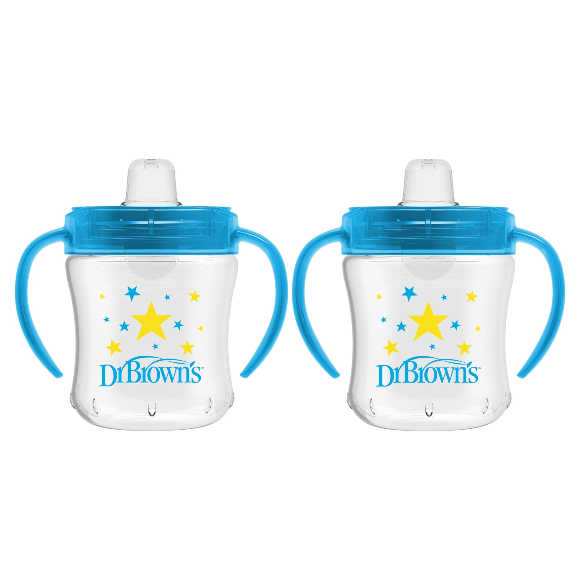 A soft approach leads to big leaps in the bottle to cup transition with the Dr. Brown's Soft Spout Transition Cup! Help baby get a hold on sippy skills with the soft, one-piece silicone spout for spill-proof learning. With sturdy handles and a contoured shape, baby will get a good grip on this easy-to-handle cup. An updated lid folds all the way back to stay out of baby's way when they drink and keeps the spout clean when not in use. Bright blue and pink colors with cute rainbow and star patterns keep baby coming back for more. This easy-clean cup features a one-piece valve for quick assembly and simple cleaning. Dishwasher safe (top rack) and BPA free. 6 oz/180 ml. 6m+.