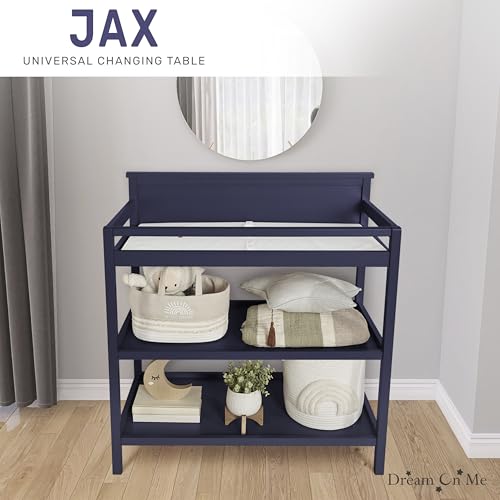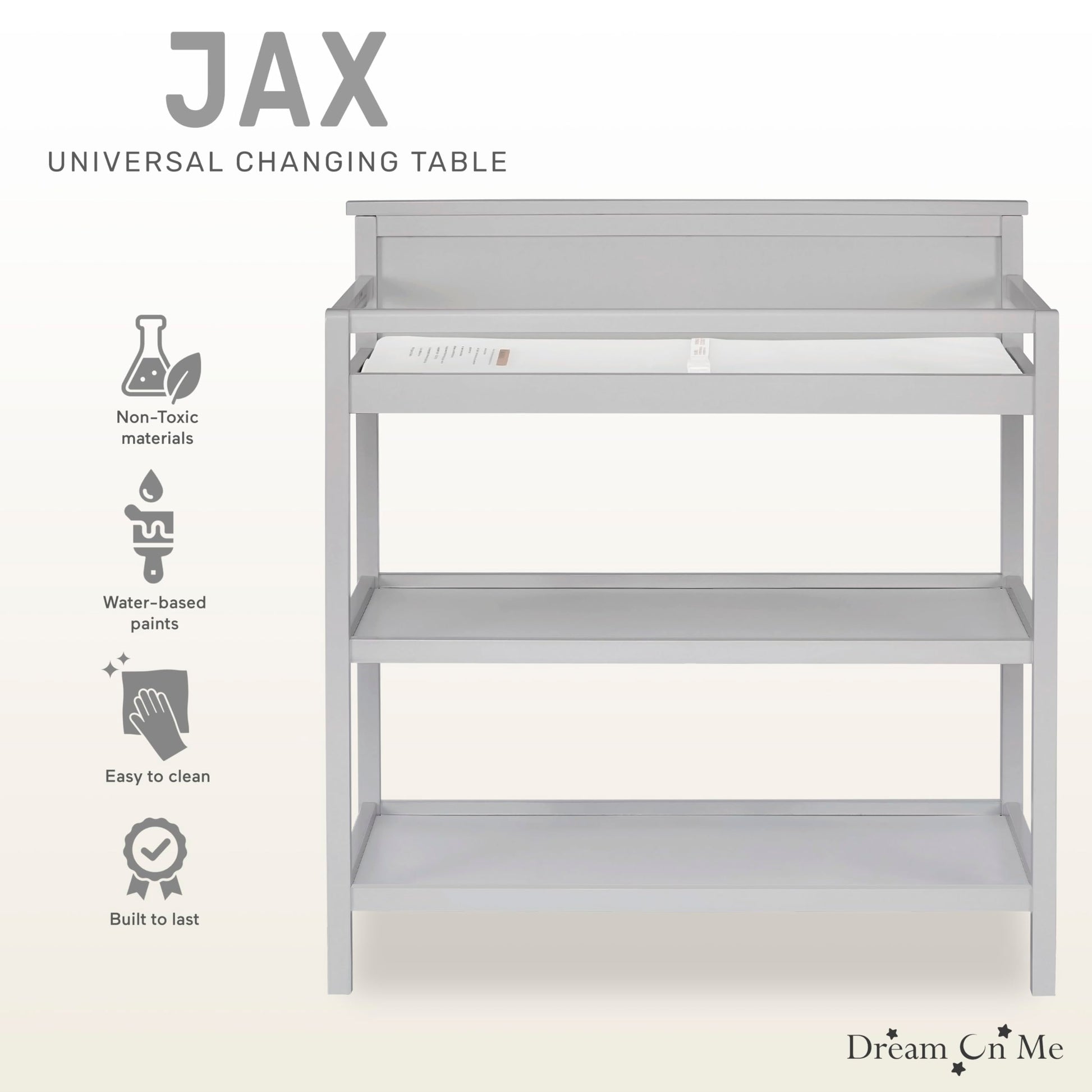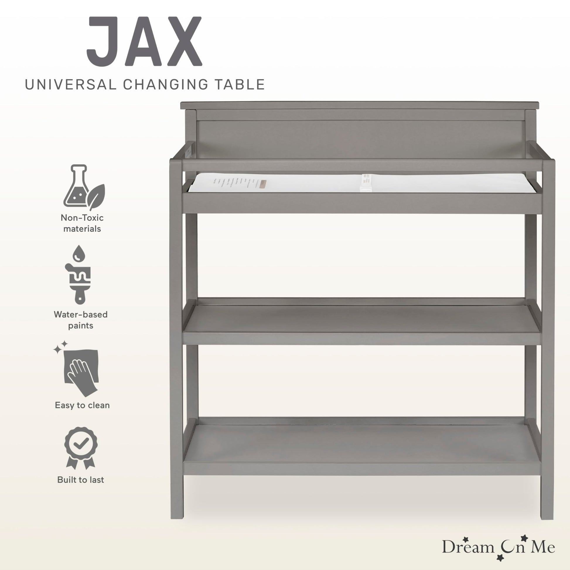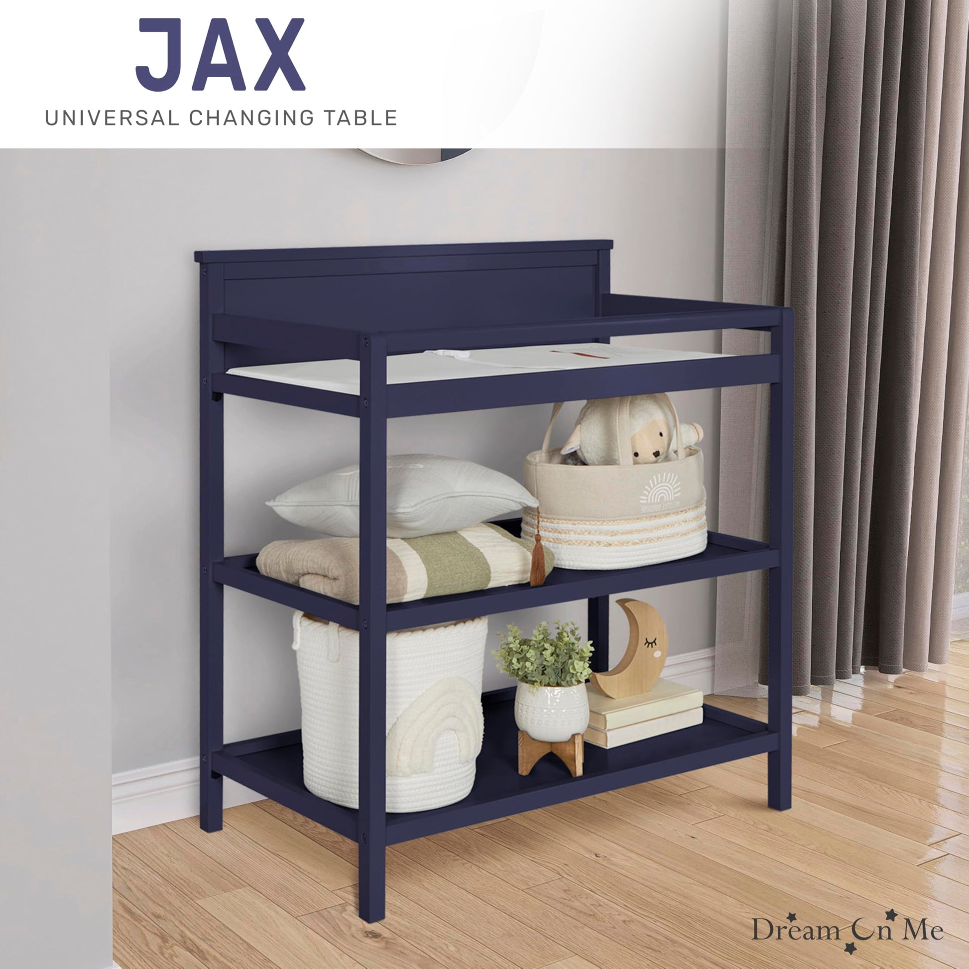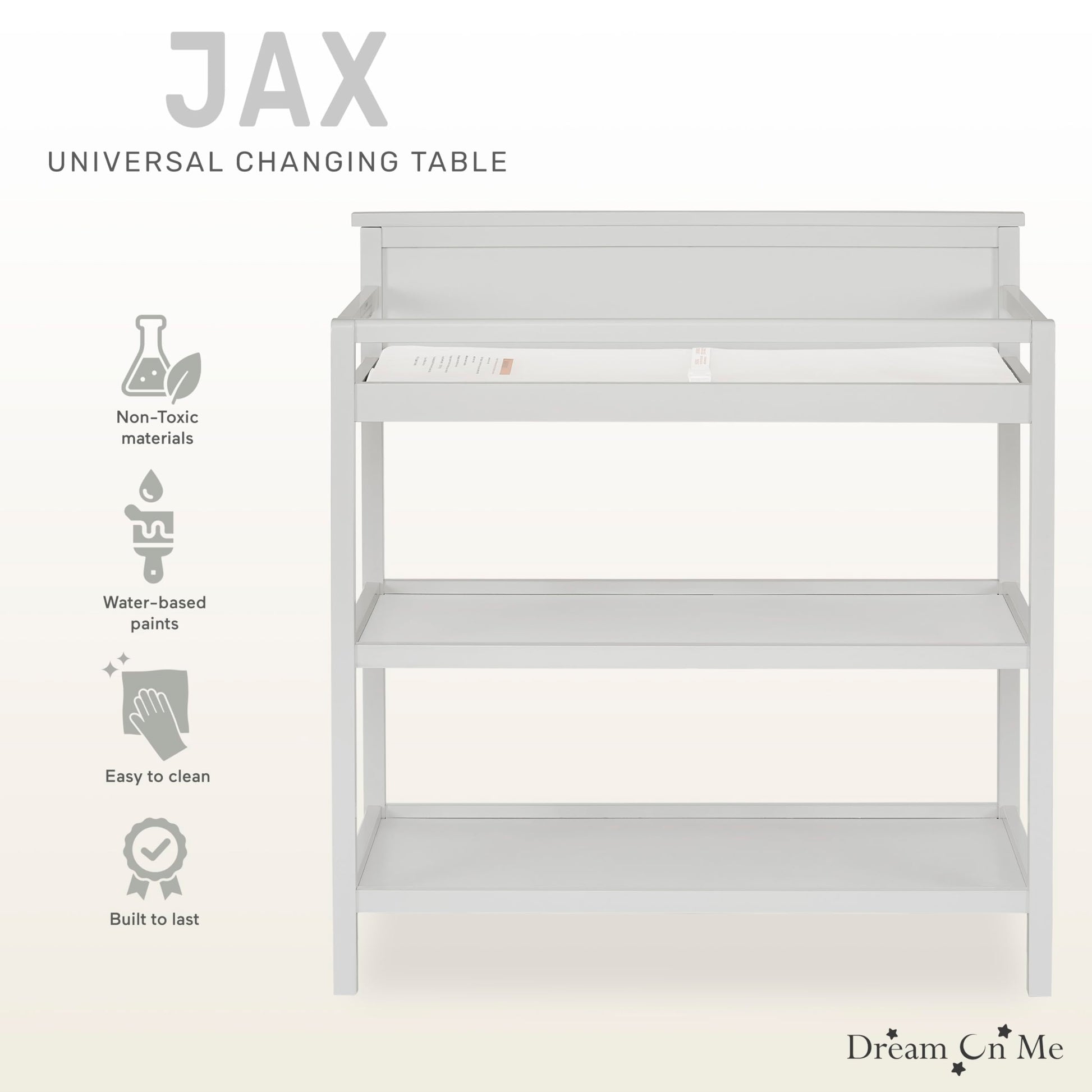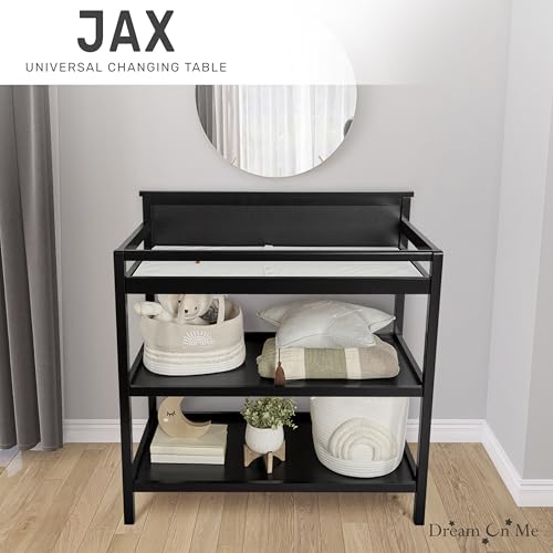 Dream On Me Jax Universal Changing Table is perfect for any nursery. This changing table has a clean modern line design, with a water resistant mattress pad for changing including a safety strap with a fully enclosed dressing area for extra security. Dream On Me Jax changing table has 2 fixed shelves for open storage which is ideal for diapers, wipes and other essentials. This changing table can transition into a night stand as your baby gets older. Dream On Me Jax changing table coordinates with All Dream On Me Crib. All Dream On Me products meets or exceeds government and ASTM safety Standard.