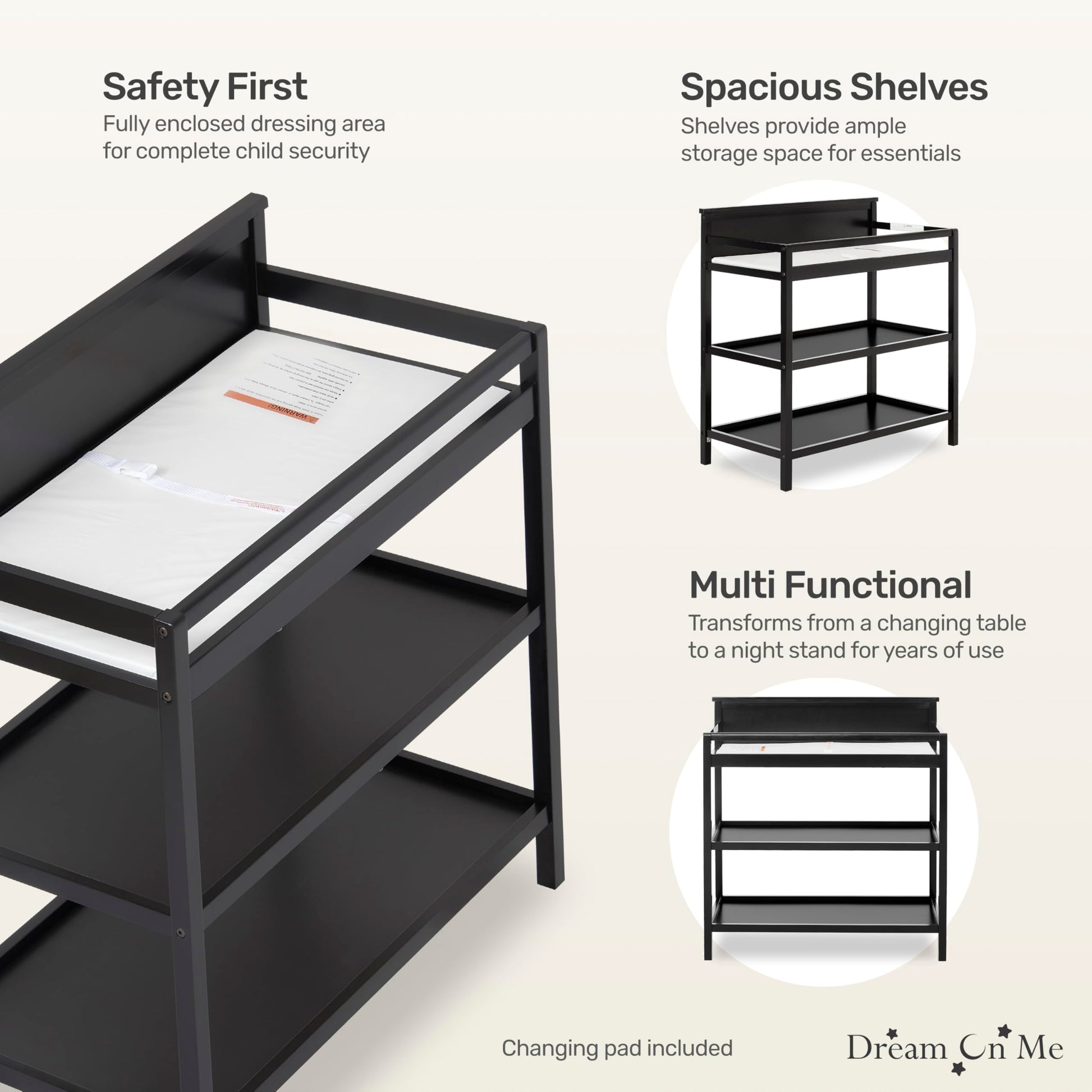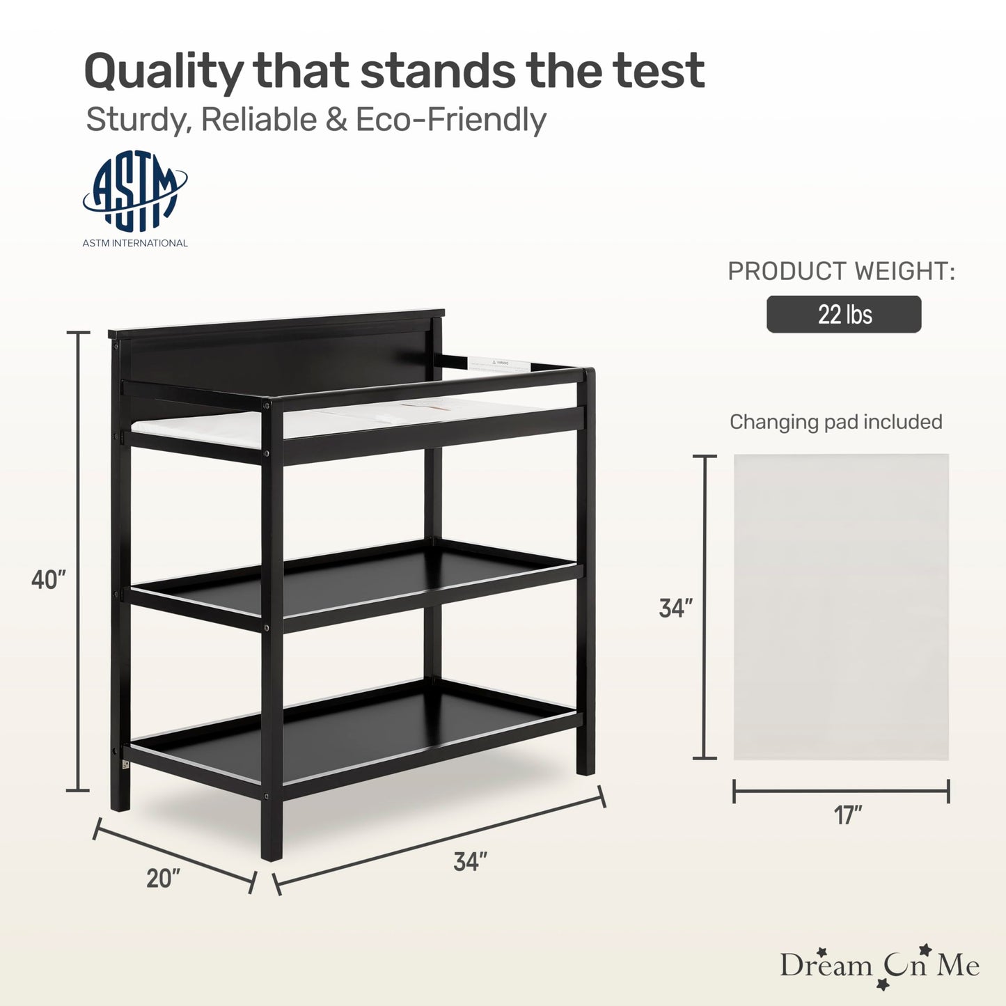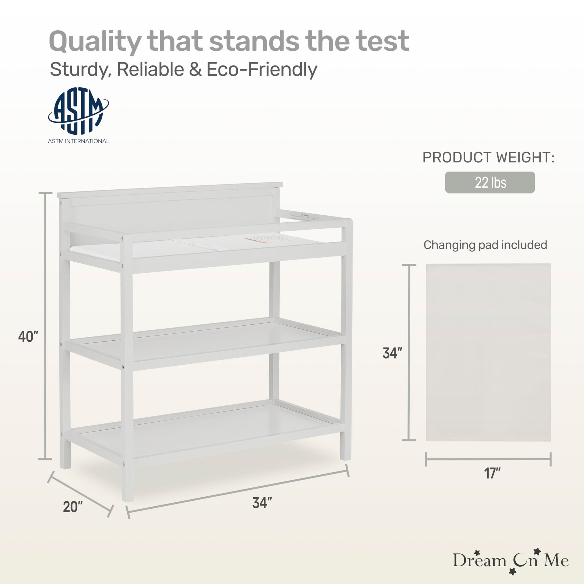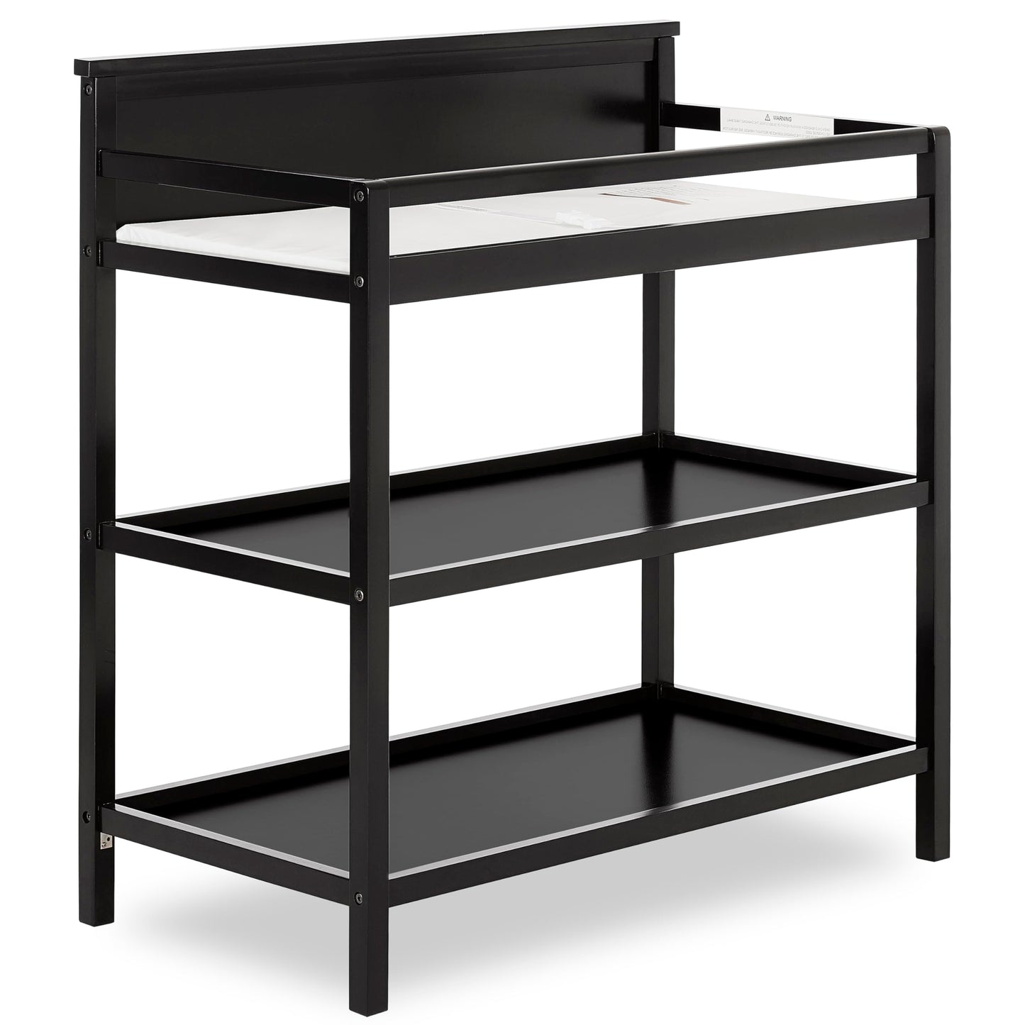 Dream On Me Jax Universal Changing Table is perfect for any nursery. This changing table has a clean modern line design, with a water resistant mattress pad for changing including a safety strap with a fully enclosed dressing area for extra security. Dream On Me Jax changing table has 2 fixed shelves for open storage which is ideal for diapers, wipes and other essentials. This changing table can transition into a night stand as your baby gets older. Dream On Me Jax changing table coordinates with All Dream On Me Crib. All Dream On Me products meets or exceeds government and ASTM safety Standard.