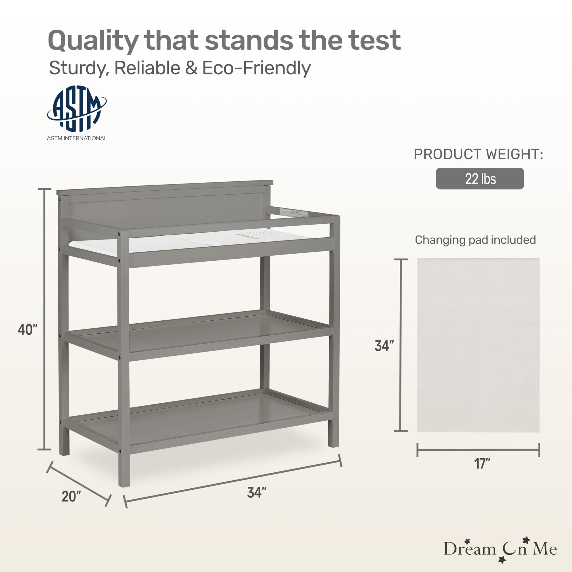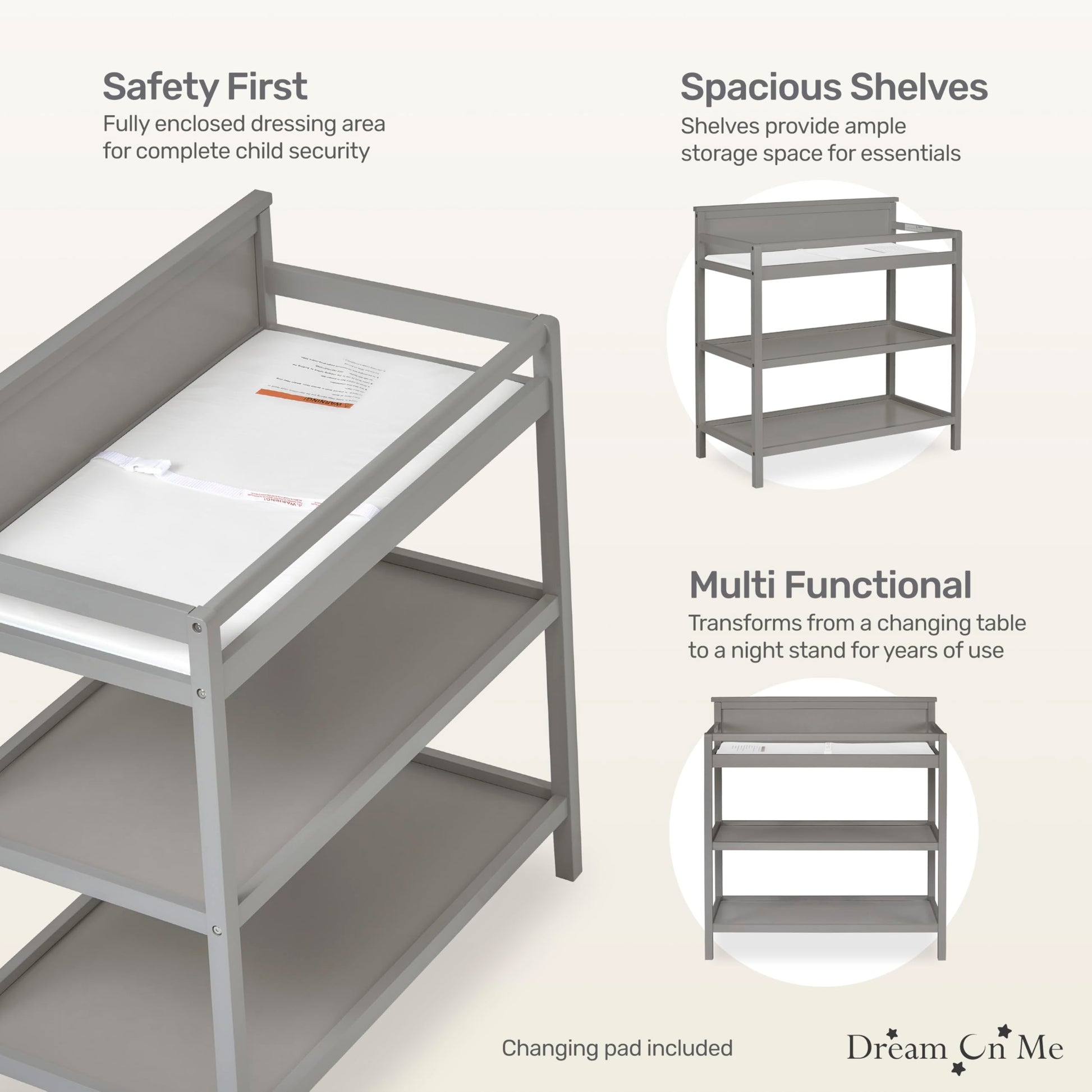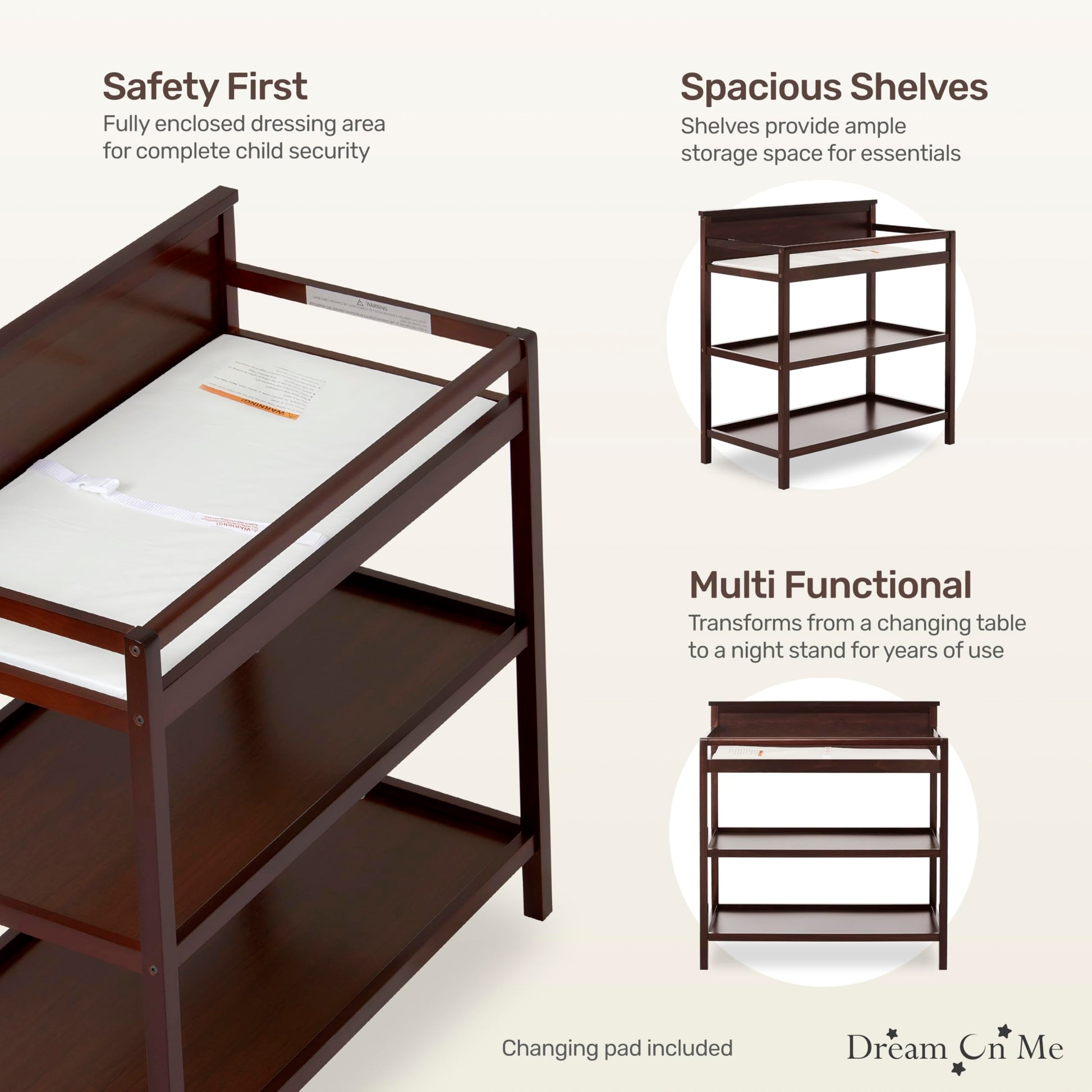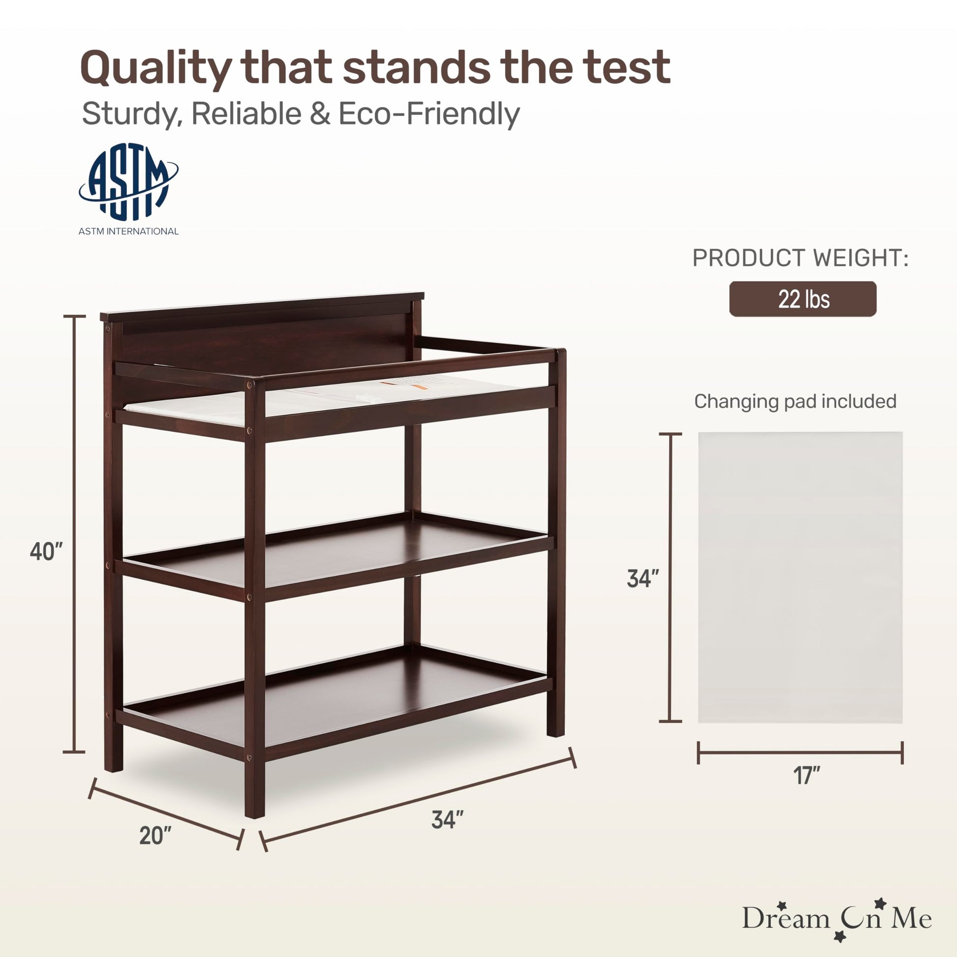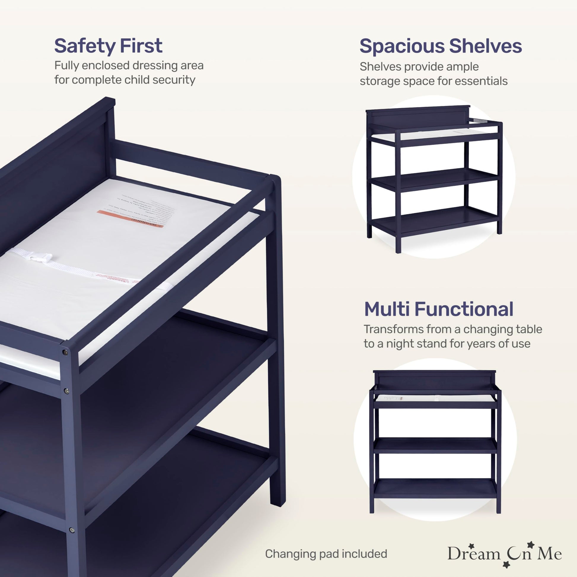 Dream On Me Jax Universal Changing Table is perfect for any nursery. This changing table has a clean modern line design, with a water resistant mattress pad for changing including a safety strap with a fully enclosed dressing area for extra security. Dream On Me Jax changing table has 2 fixed shelves for open storage which is ideal for diapers, wipes and other essentials. This changing table can transition into a night stand as your baby gets older. Dream On Me Jax changing table coordinates with All Dream On Me Crib. All Dream On Me products meets or exceeds government and ASTM safety Standard.