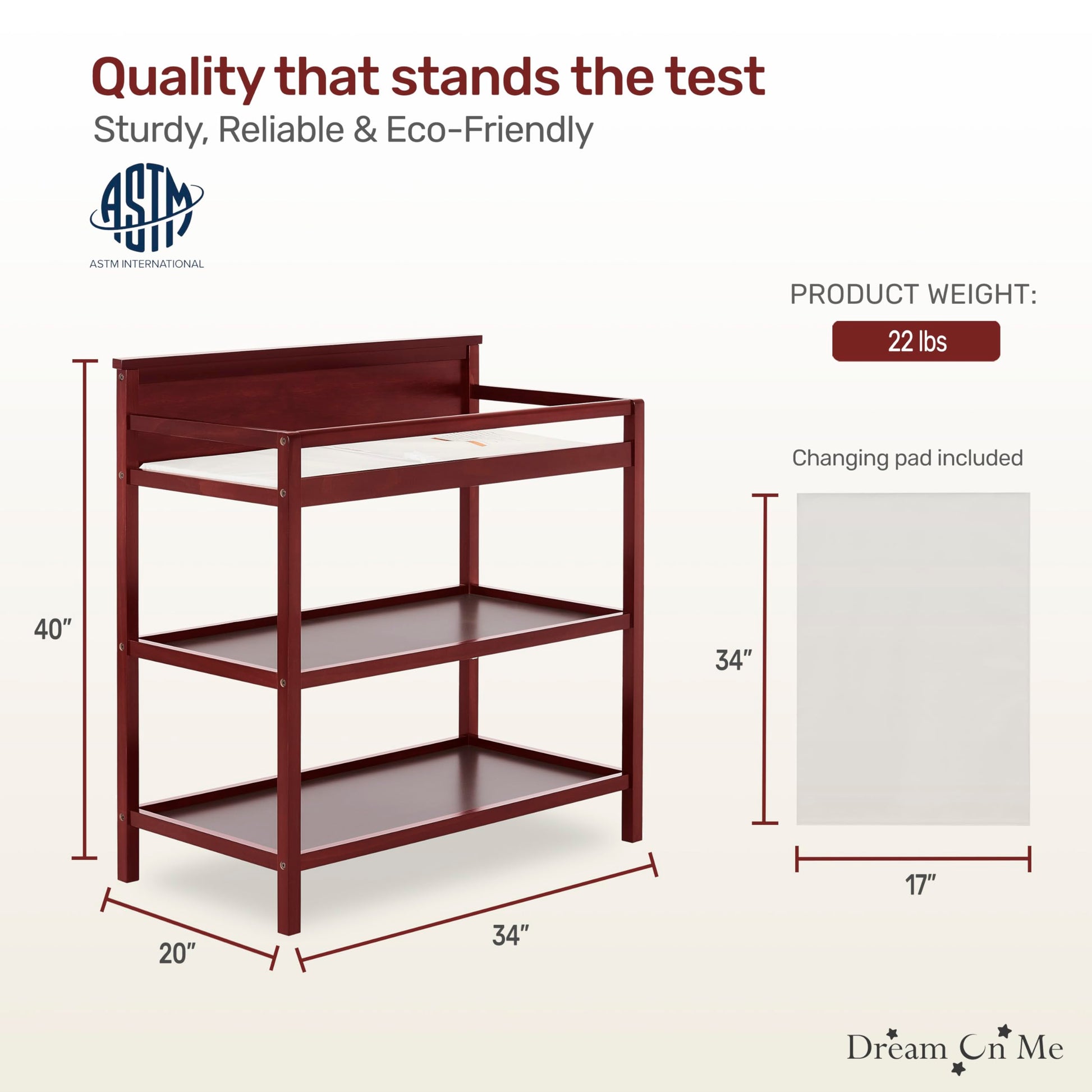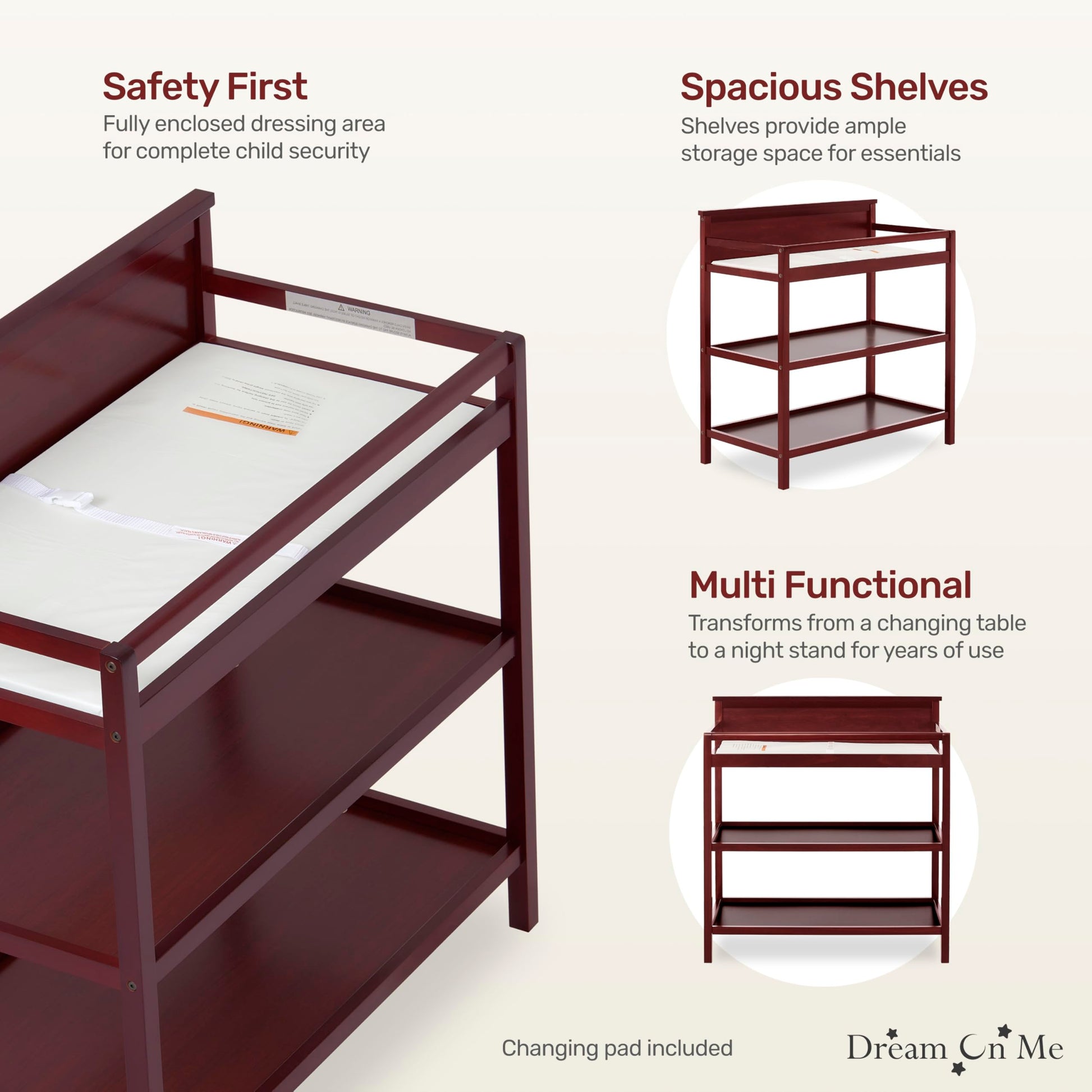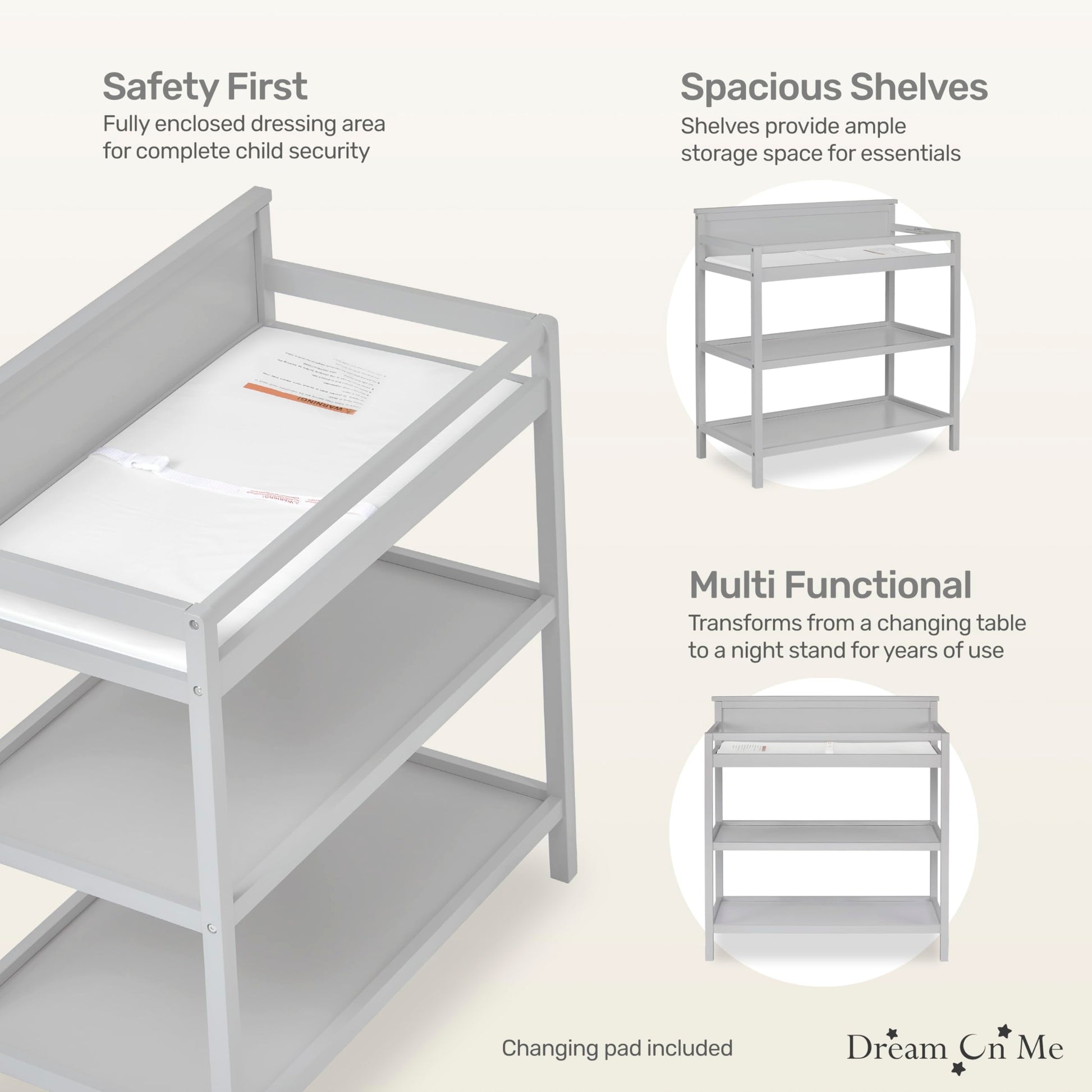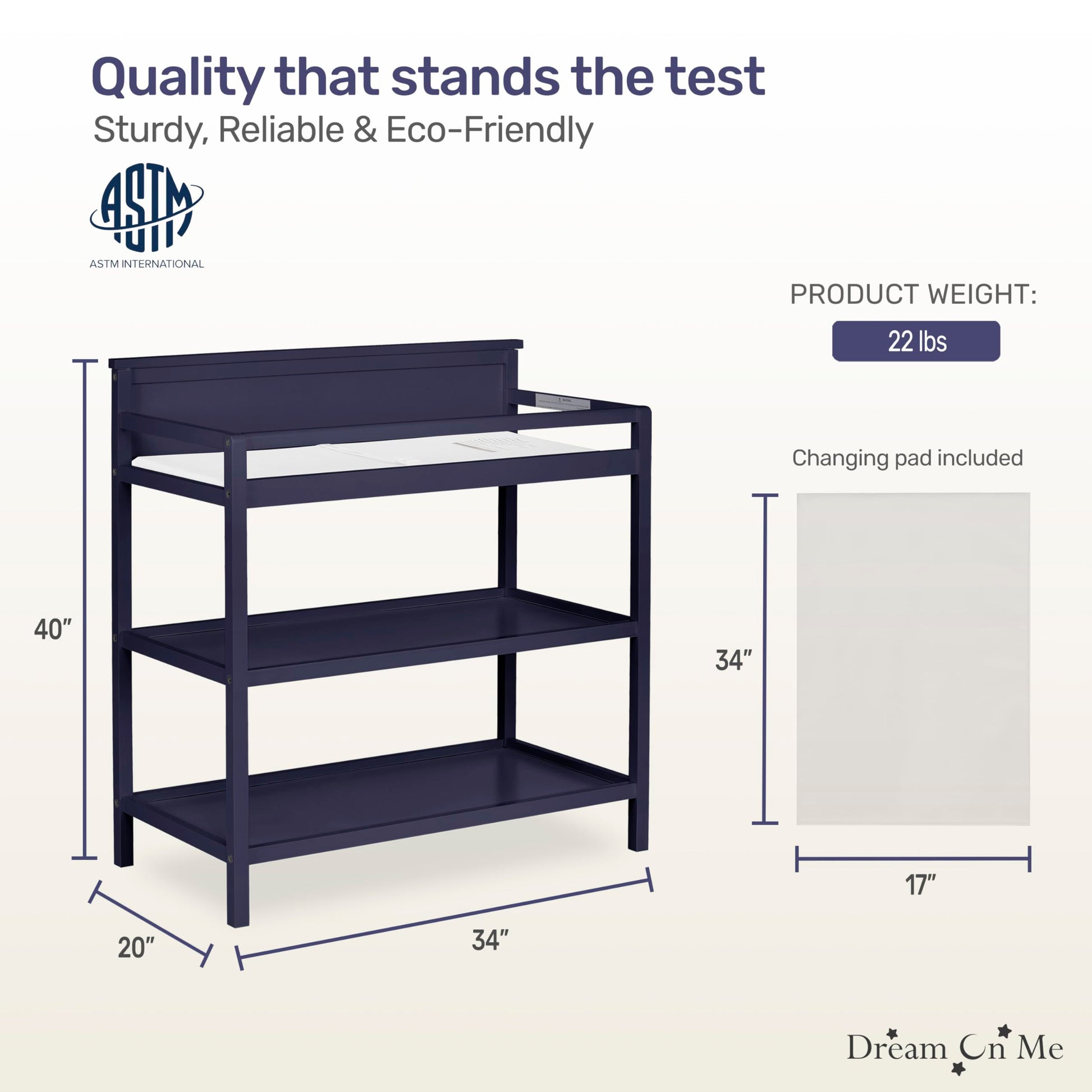Dream On Me Jax Universal Changing Table is perfect for any nursery. This changing table has a clean modern line design, with a water resistant mattress pad for changing including a safety strap with a fully enclosed dressing area for extra security. Dream On Me Jax changing table has 2 fixed shelves for open storage which is ideal for diapers, wipes and other essentials. This changing table can transition into a night stand as your baby gets older. Dream On Me Jax changing table coordinates with All Dream On Me Crib. All Dream On Me products meets or exceeds government and ASTM safety Standard.