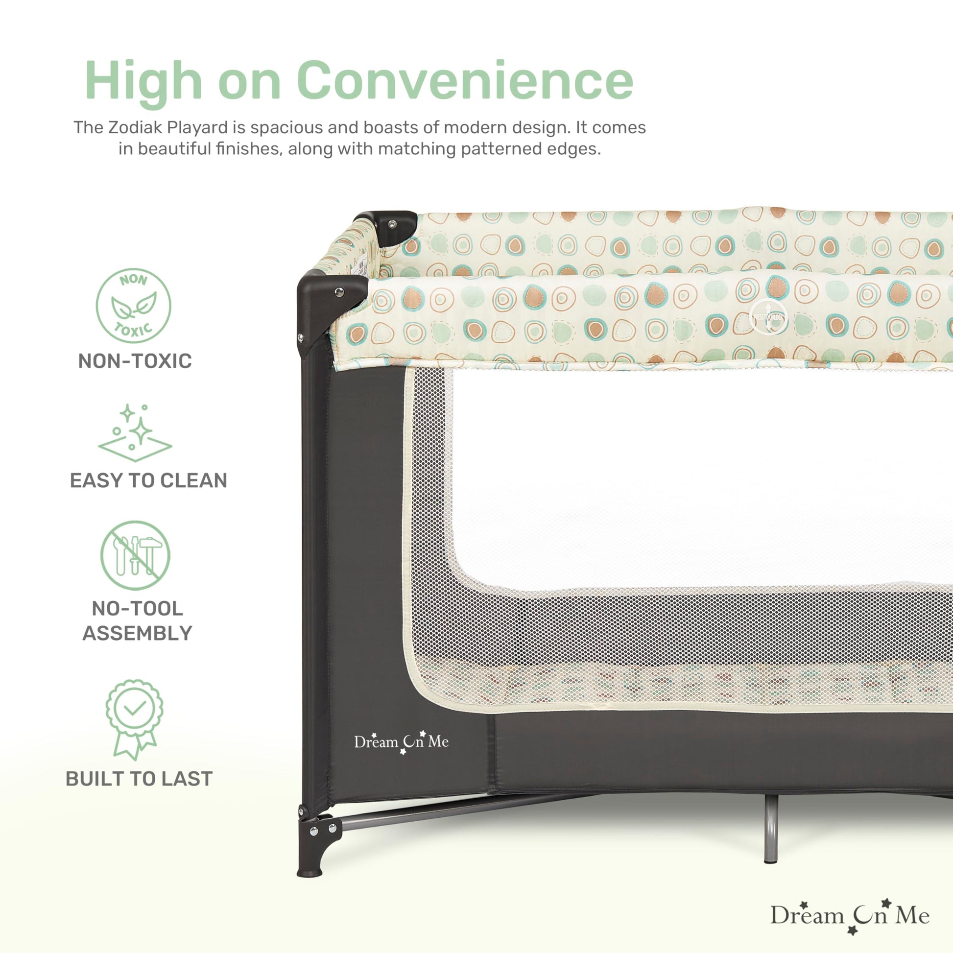 - STYLISH DESIGN: The Zodiak Playard is spacious and boasts of modern design. It comes in seven beautiful finishes, along with matching patterned edges, which allow it to blend into any decor. To clean, simply wipe with a damp cloth and allow to air dry.