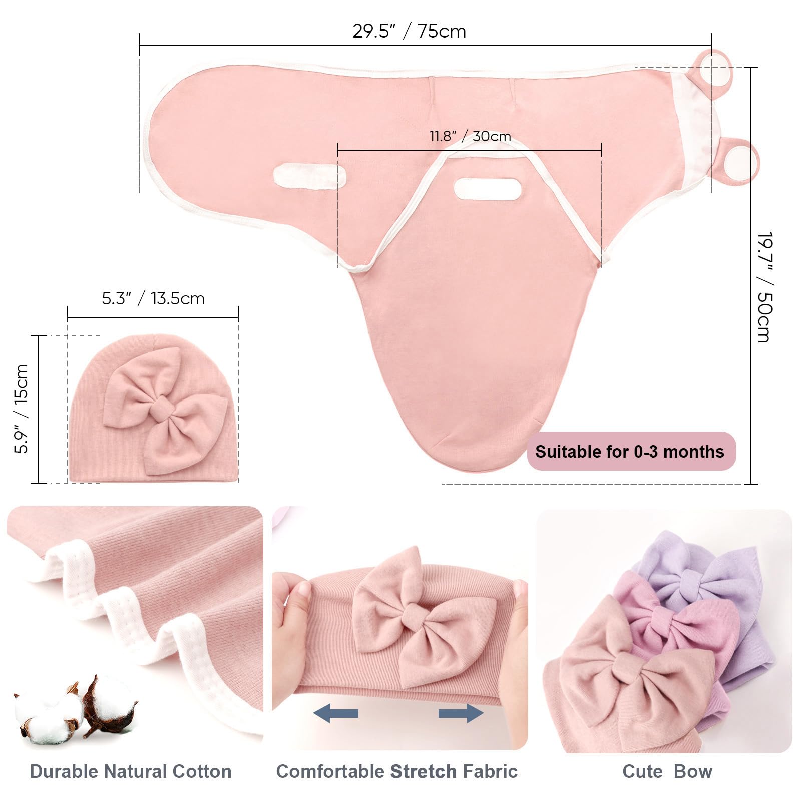 DRESHOW BQUBO 3 Pack Baby Swaddle Sleep Sacks Baby Swaddling Blanket Wrap Newborn Swaddle Sack with Big Bow Hat for Boys Girls 6-12 Lbs Newborns & 0-3 Months Girls Boys