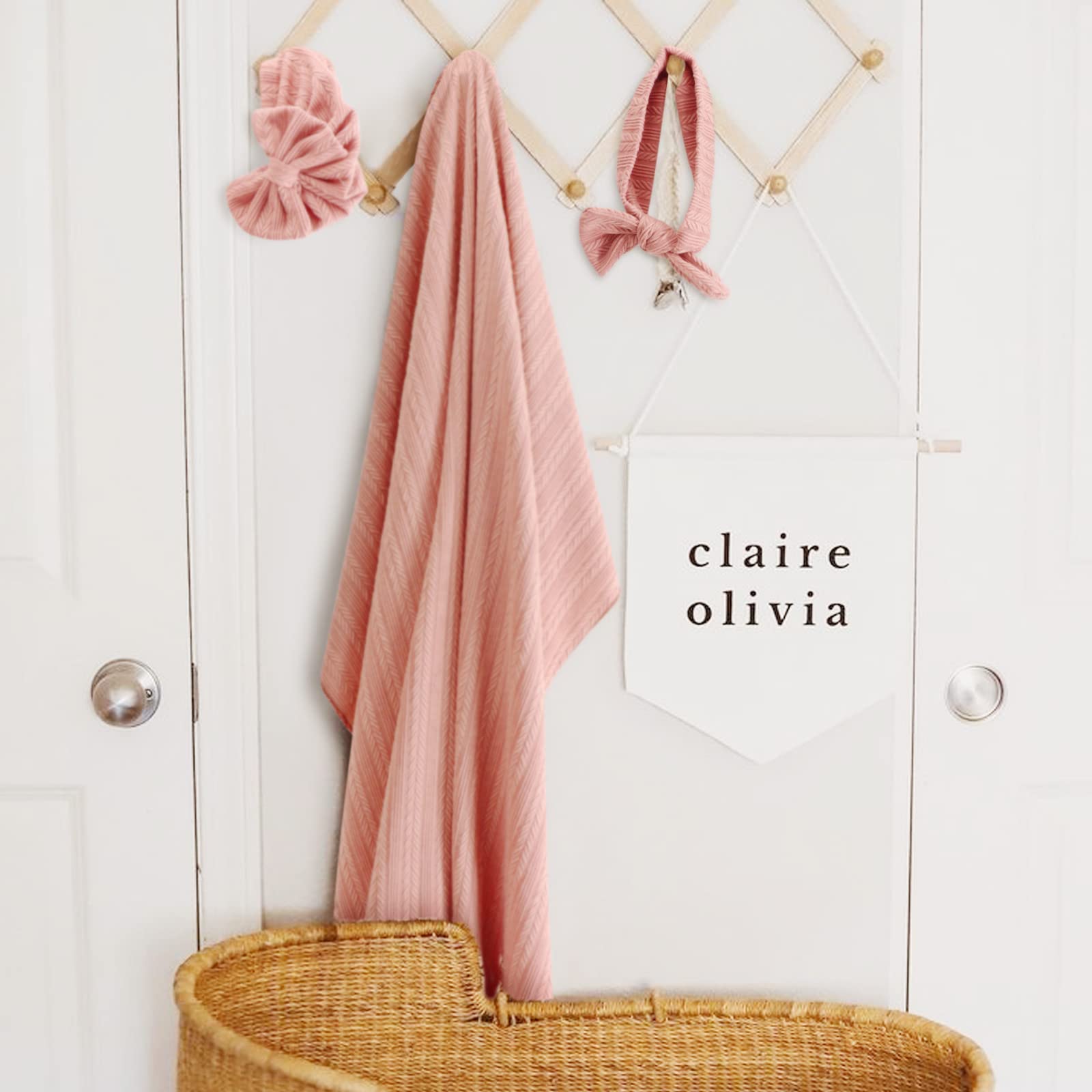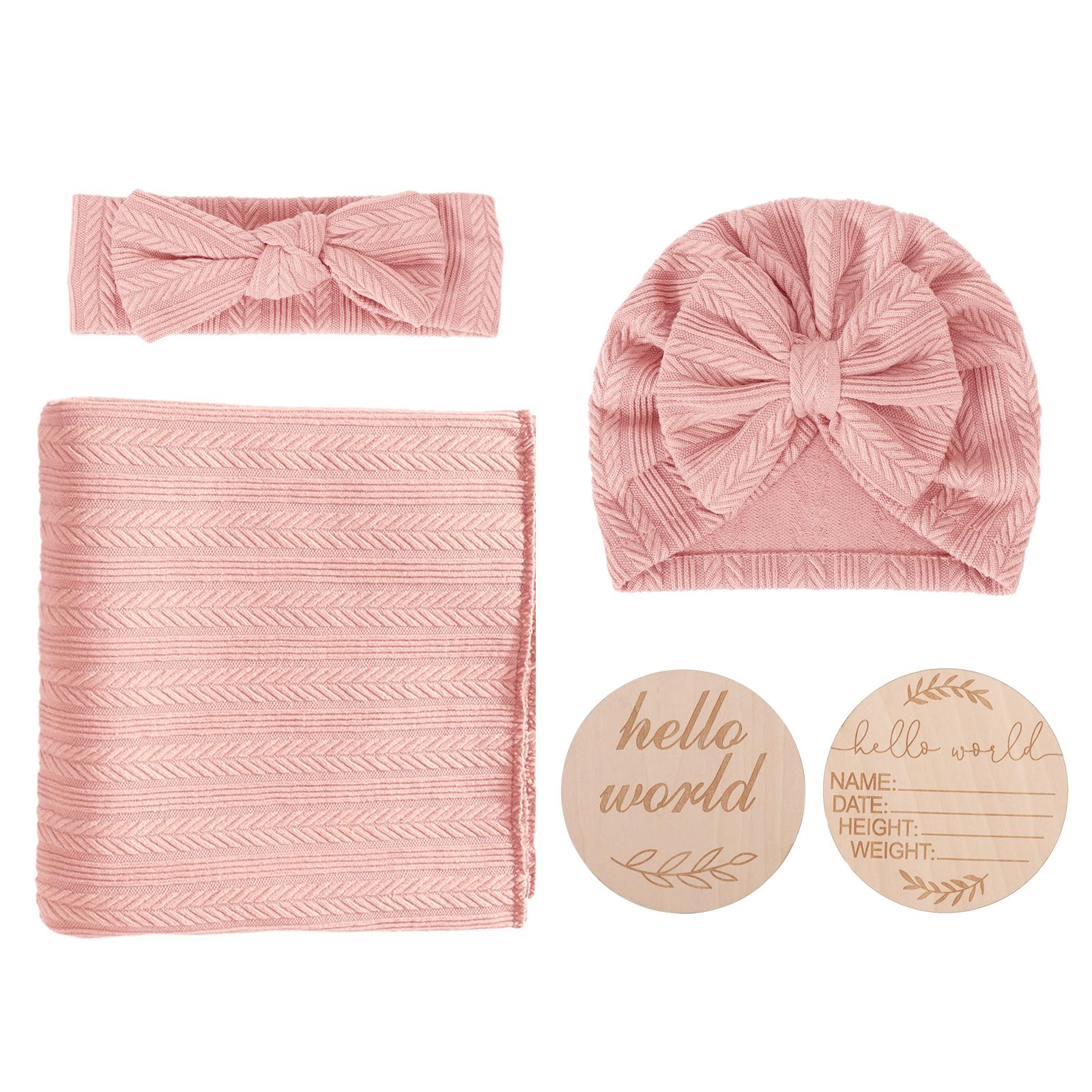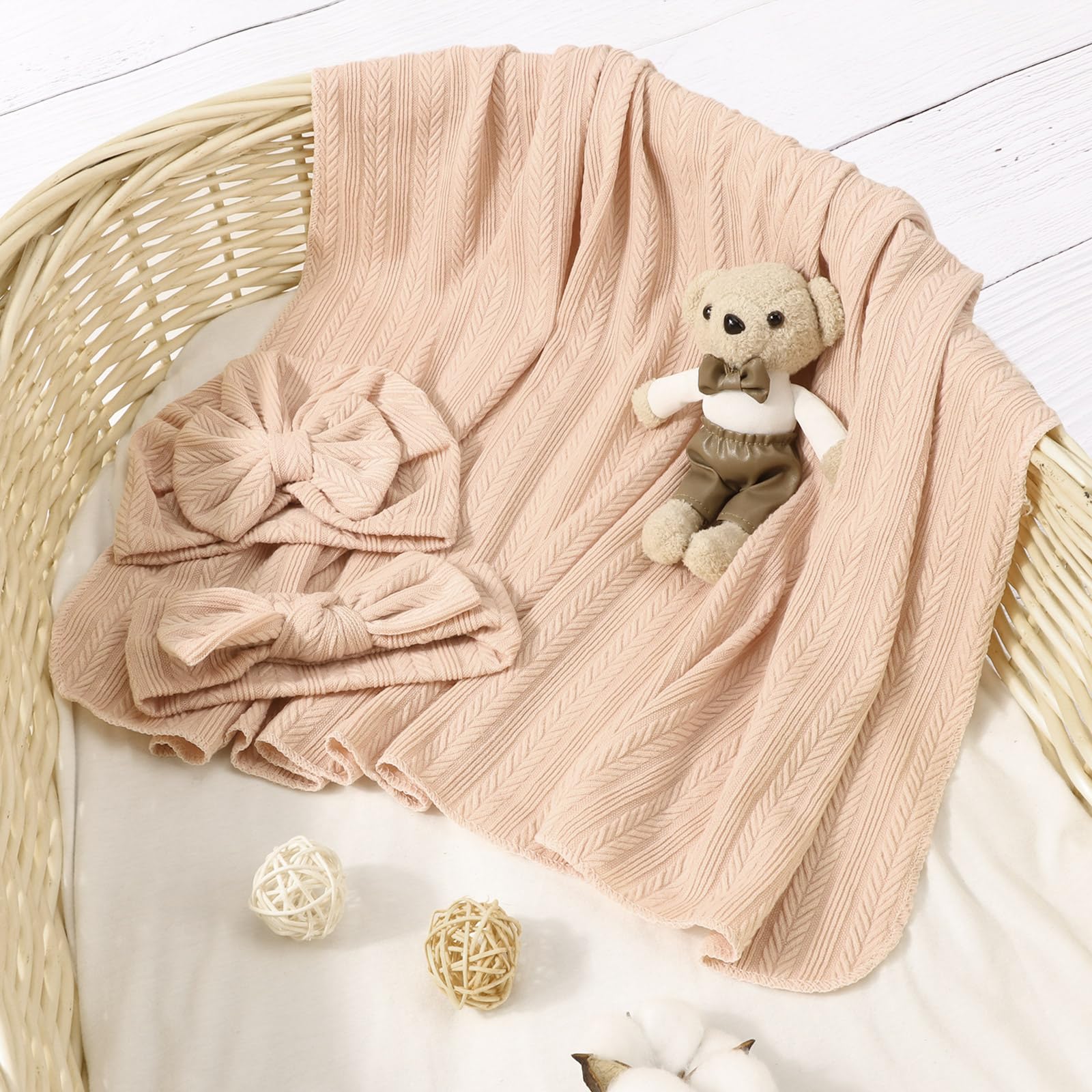 DRESHOW BQUBO Baby Swaddle Blankets for Girls, 4PCS Newborn Accessories Set with Matching Hat and Bow Headband with Card