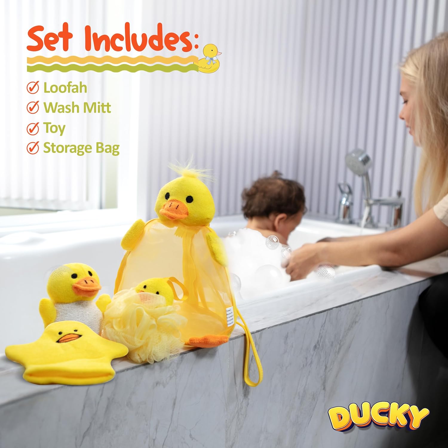 Ducky Scrub 'N Soak Baby Loofah for Bathing Set for Kids Body Scrubber Cute Cartoon Kids Loofah Bath Scrubber for Children Shower Washing Exfoliating, Baby Bath Sponge Yellow Duck Included