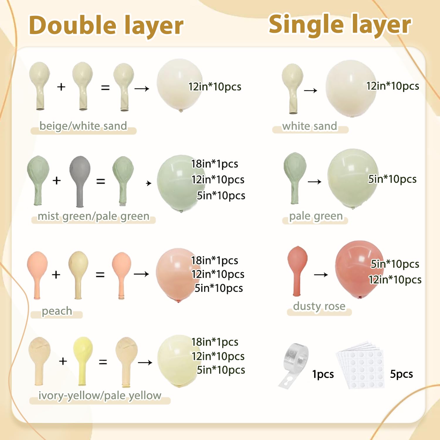 - Sage Green Balloon Arch Kit: The spring balloons double stuffed have 88 pieces included(dusty green balloons + tan balloons+ blush balloons + sand white balloons )、singe layer balloons have 31 pieces included (sage green balloons +sand white balloons+light pink balloons).balloon tape, balloon glue and white ribbon; Different sizes and colors help your sage green brown balloon garland arch kit look fuller.The pastel balloon arch are pre-grouped and packed in proportion to ensure a natural transition of the arches and a high-end Morandi color effect without the need to adjust the color