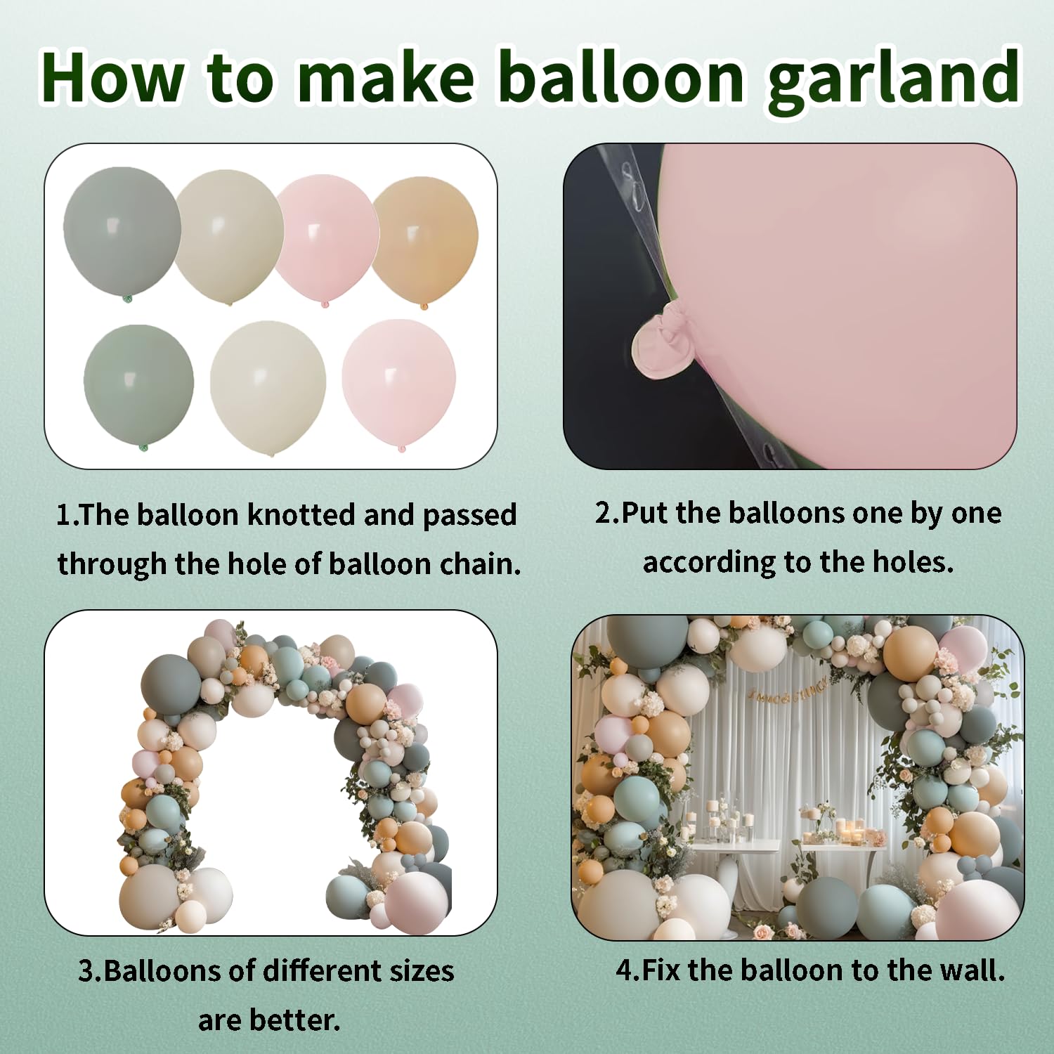 - Dusty Green Nude Pink Balloons Arch Kit: The dusty pink green arch balloon is a combination of sage green balloons, dark green balloons, blush balloons , nude balloons,sand white balloons,tan balloons, presenting a low-saturation Morandi color effect. It is pastel balloons arch kit. It is perfectly suitable for weddings, forest parties, art exhibitions and other scenes, and can easily create a high-end decorative atmosphere.