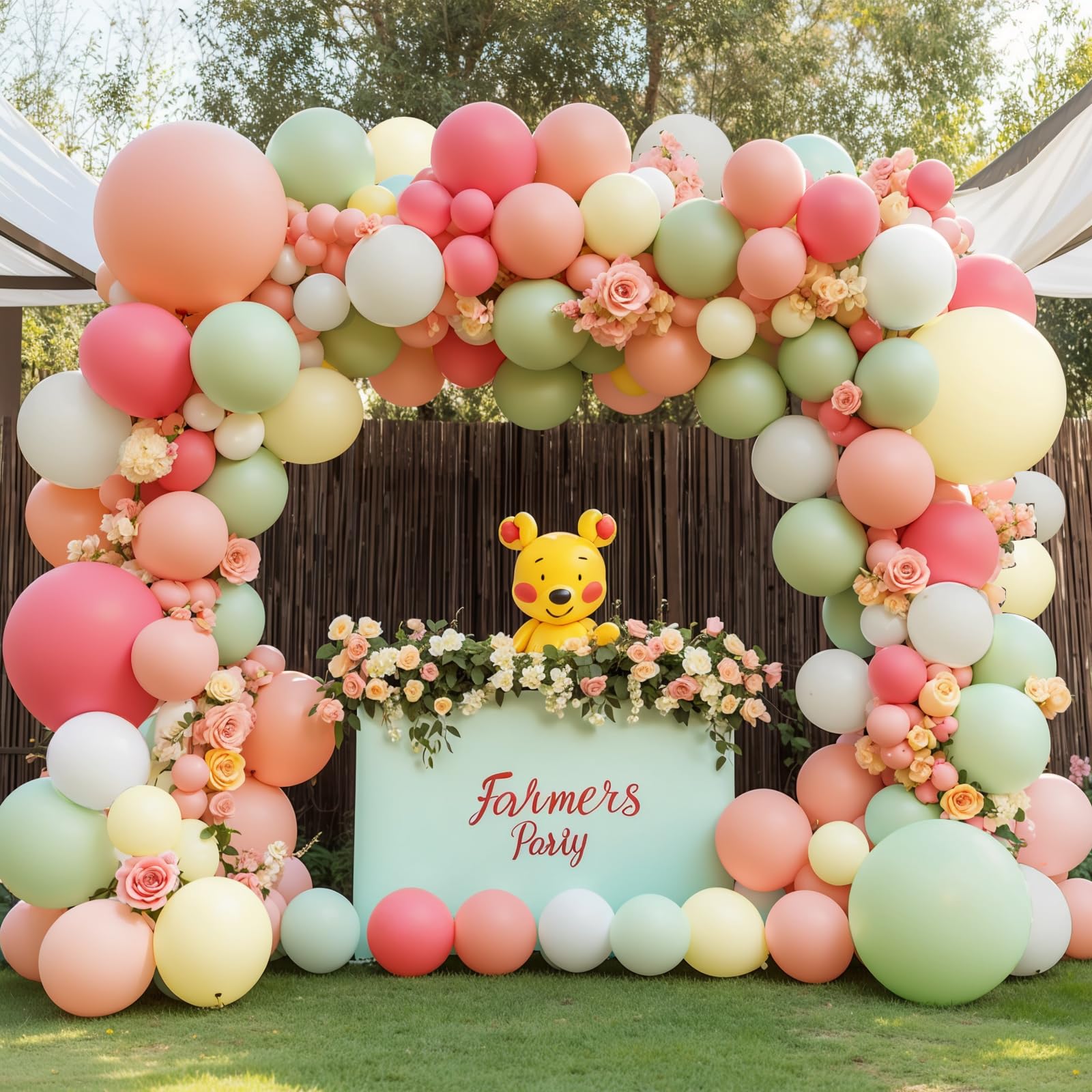 - Pink and Green Arch Balloons: This spring balloons arch includes 3 sizes of balloons (5 inches、12inches、18 inches), which can be freely matched with gradient transitions or contrasting color effects, supporting indoor and outdoor scenes. The pink and green balloon arch kit can be used for wedding reception areas, baby showers, birthday parties, woodland and coffee shop theme decorations. This woodland balloon arch can help your party convey a warm, romantic or light luxury brand tone.