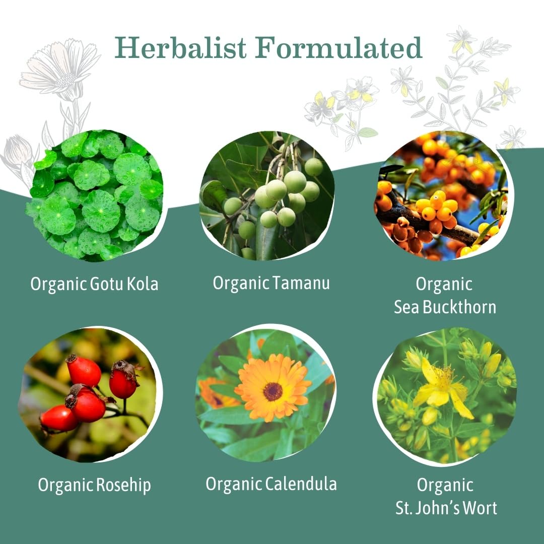 Dermatologist tested for irritation, this salve is a well-researched blend of organic herbs and oils, including organic tamanu oil, sea buckthorn seed oil, calendula, and gotu kola.