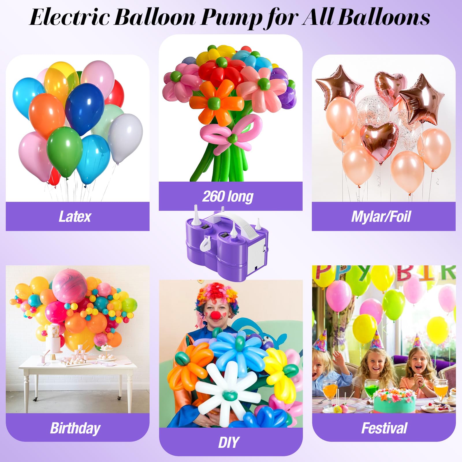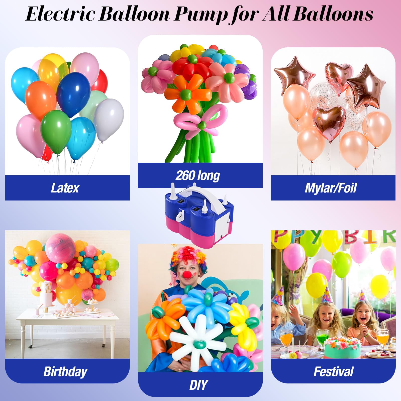 - Air Pump for All Balloons: Our balloon pump (not a helium pump) features two independent powerful motors that provide two different pressure and airflow options through two separate inflation ports. This allows you to inflate latex balloons, foil balloons, and 260q long balloons with one device. One port is designed for standard latex balloons, while the other is suitable for 260q, double-layer balloons, foil balloons, and small-sized balloons.