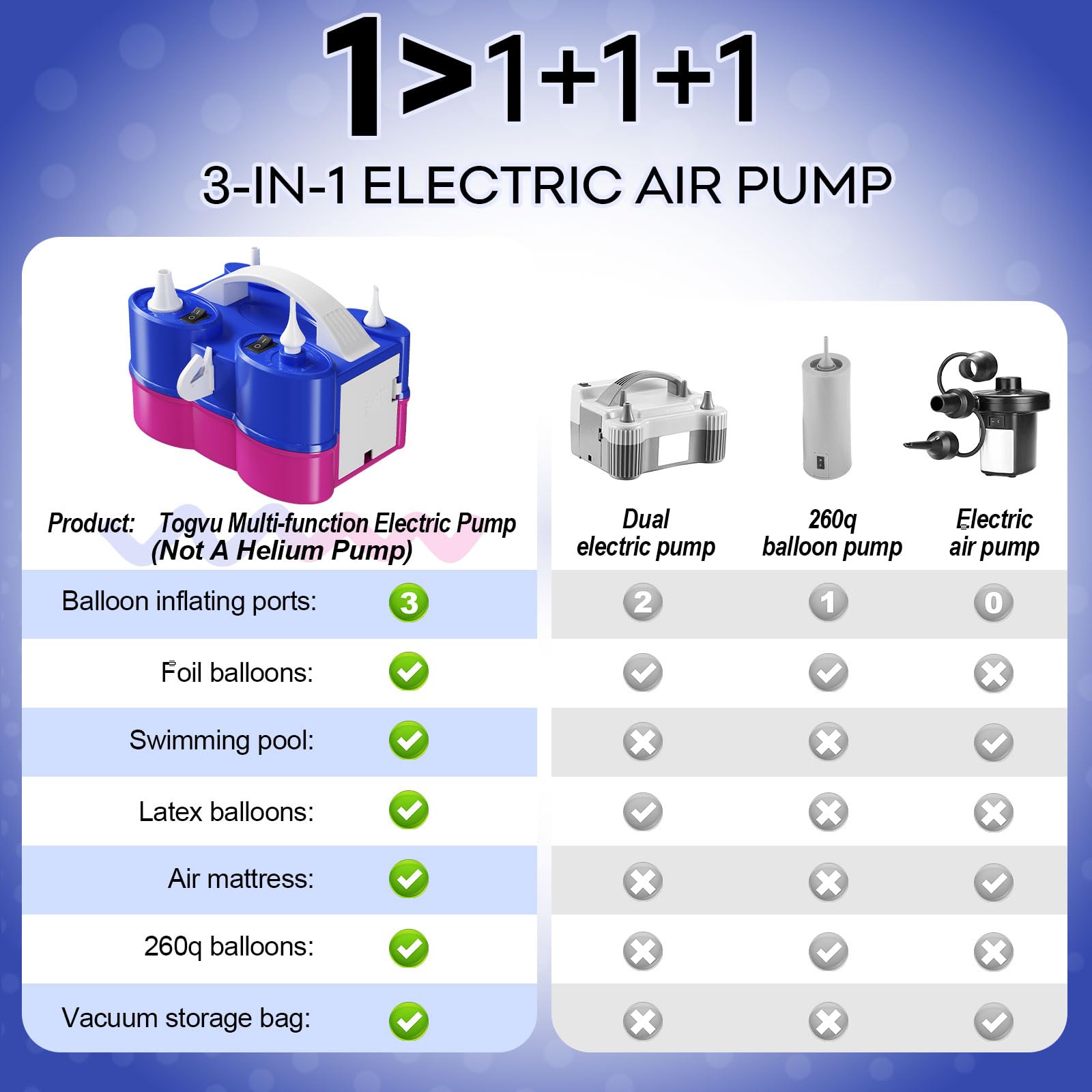 - 3-IN-1 Electric Air Pump: The Togvu electric air pump is a powerful multi-functional device that combines balloon inflation, general inflation, and deflation, and can also be used for vacuum storage bags. Easy to operate and versatile, it is an essential tool for every household. Note: THIS PRODUCT IS ONLY AN AIR PUMP, NOT HELIUM!