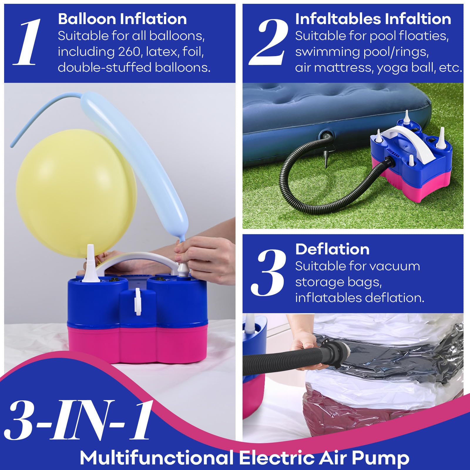 Electric Balloon Pump, 3-in-1 Portable Air Pump for Inflatables and Balloons, Dual Nozzle Balloon Blower Machine for Latex 260q Foil Balloons 110V Inflator Deflator for Pool Floats Air Mattress