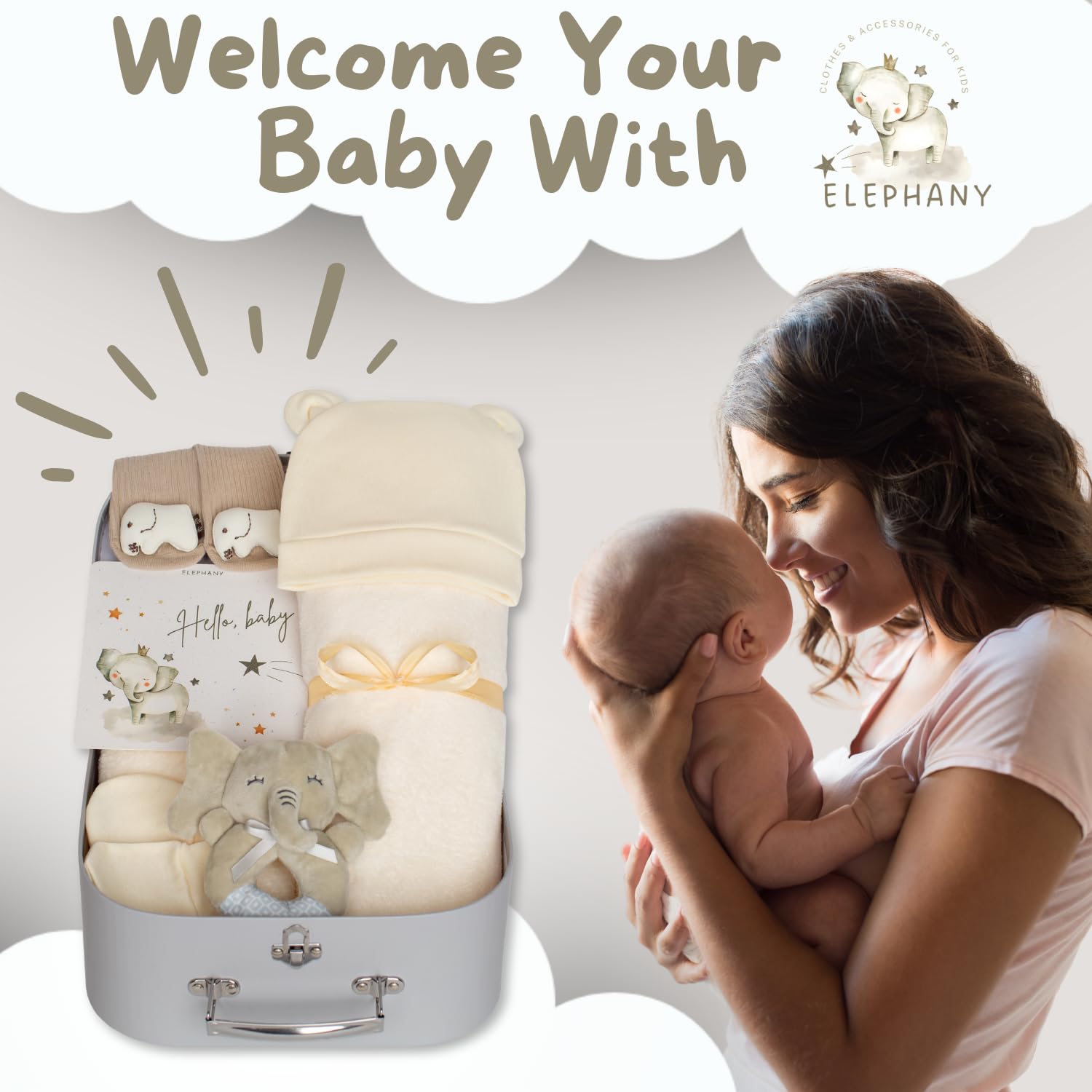 Elephany Baby Shower Gifts – Gender-Neutral Baby Gift Basket for Newborn Girls and Boys – Newborn Baby Essentials Gift Basket with Blanket, Towel, Rattle Toy, Socks – Cute Newborn Baby Gifts