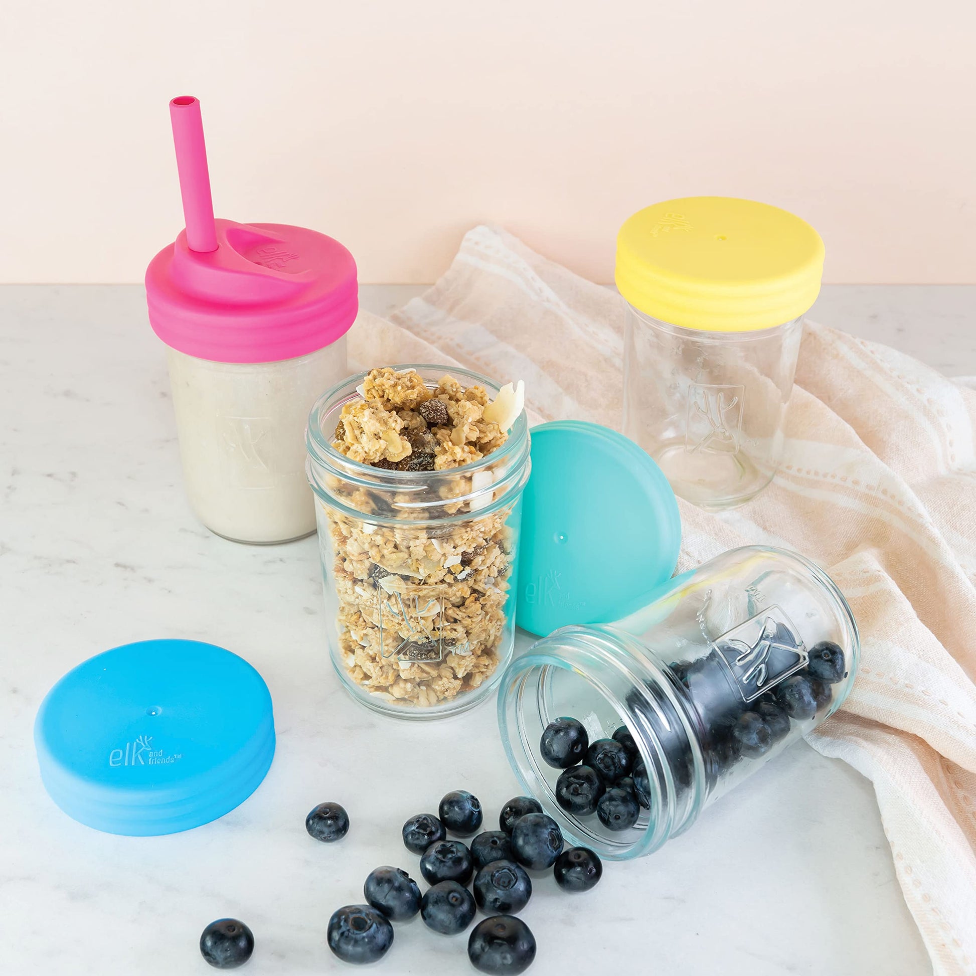 Elk and Friends Kids & Toddler Cups | The Original Glass Mason jars 8 oz with Silicone Sleeves & Silicone Straws with Stoppers | Smoothie Cups | Spill Proof Sippy Cups for Toddlers