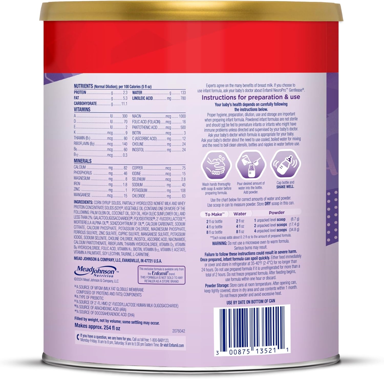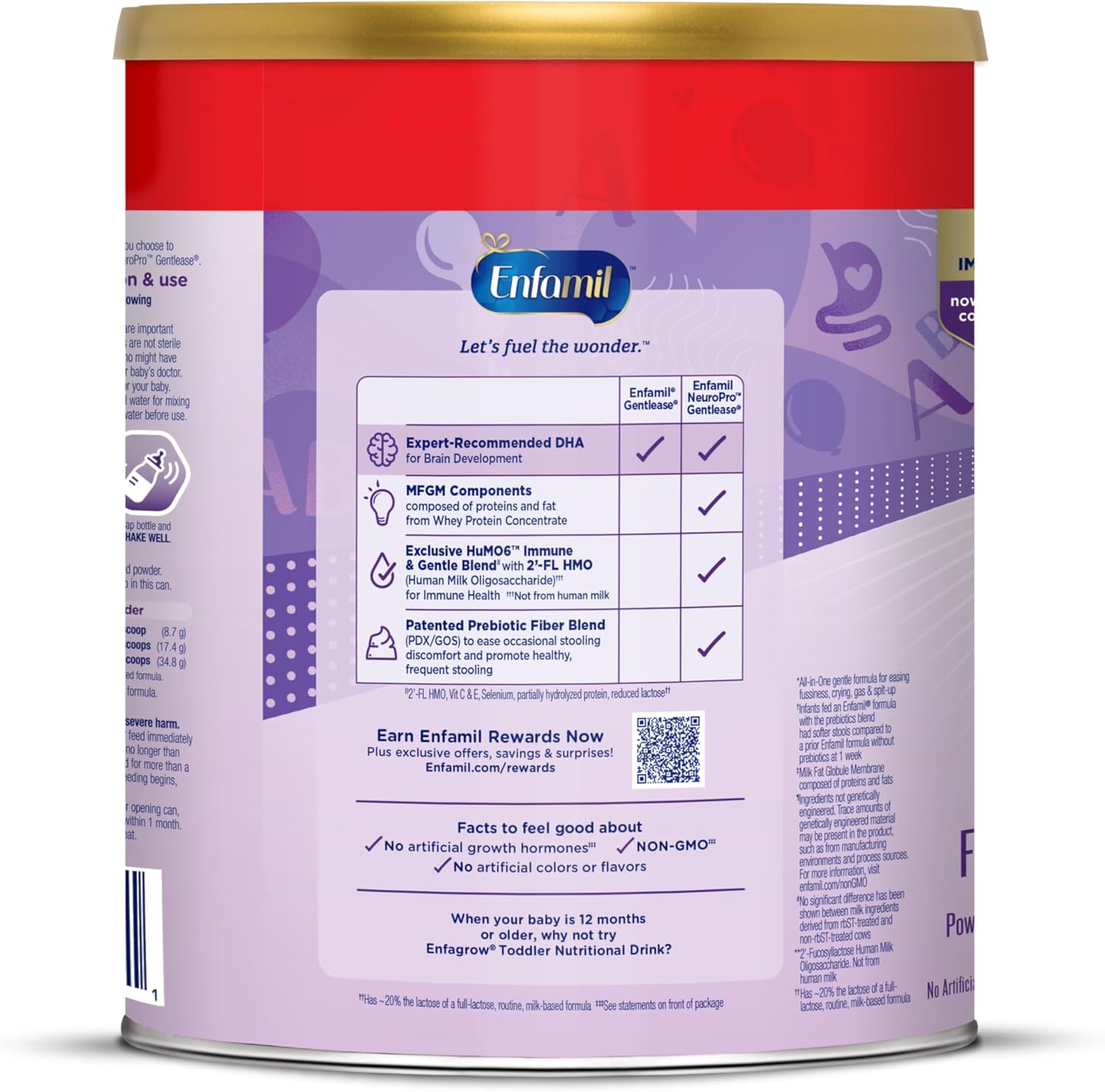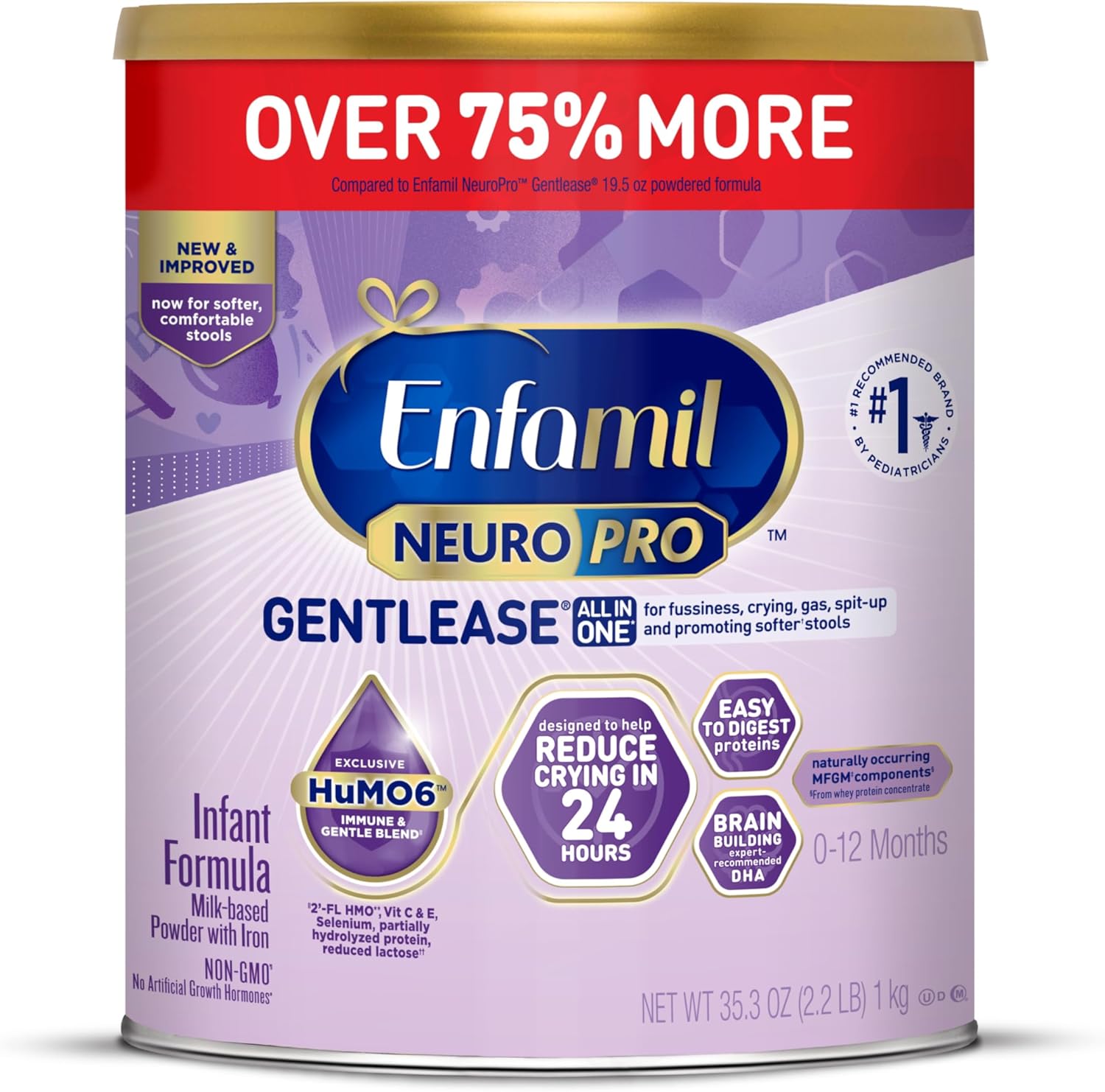 Introducing new and improved Enfamil NeuroPro Gentlease, now with a patented prebiotic fiber blend to help ease stooling discomfort and promote frequent stooling. Our trusted Gentlease baby formula is designed to help ease fussiness, crying, gas, & spit-up within 24 hours. NeuroPro Gentlease has naturally occurring MFGM components from whey protein concentrate. MFGM, short for milk fat globule membrane, is a natural component that is also found in every drop of breast milk. MFGM components in baby formula consumed during the first 12 months have been clinically shown to support brain development from now to age 5. This is an important time for your baby's brain development as their little minds create a million new neural connections. We also have expert-recommended omega-3 DHA, known to support your baby’s eye development and their growing brain. You can get nutrition for brain support inspired by breast milk from the baby formula brand that’s the #1 trusted infant formula brand by pediatricians & parents and the #1 trusted brand for brain-building & immune support.