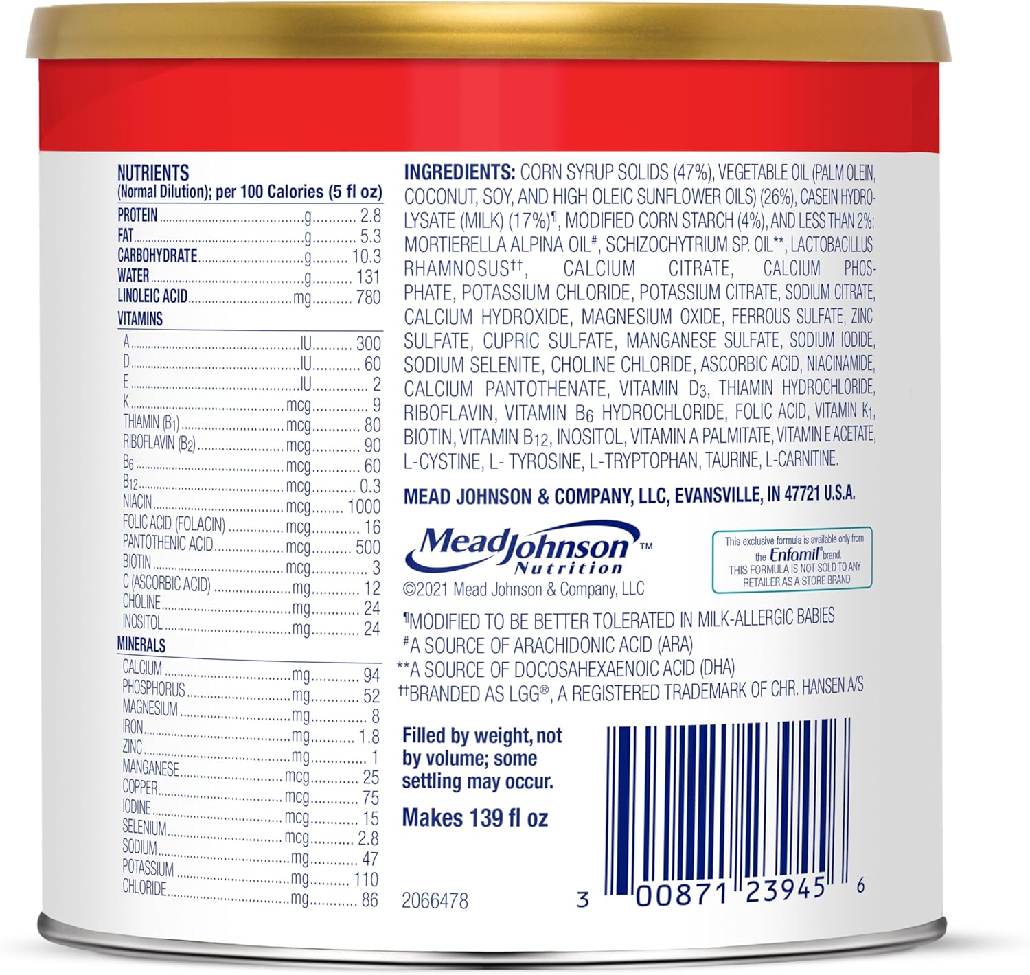 Enfamil Nutramigen Colic Baby Formula with Enflora LGG probiotics is a hypoallergenic formula proven to manage colic fast, often within 48 hours. If your baby has an allergy to the cow's milk protein in infant formula, Nutramigen contains both extensively hydrolyzed protein to provide colic relief and Enflora LGG probiotics to provide immune support to prevent allergies in the future. These two ingredients offer a more comprehensive approach working together to help babies feel better faster. The benefits of these two ingredients include: Hypoallergenic, easy to digest proteins and probiotics, proven to promote skin health in infants through 18 months of age, proven to promote digestive system health within 1 week of use, effectively manages colic in 48 hours, and promotes immune support. Nutramigen with Enflora LGG probiotics is also nutritionally balanced, lactose free, and has no added sucrose. Studied before the addition of DHA, ARA and LGG. Asthma, eczema, rhino-conjunctivitis, and urticaria at three years; in comparison to Nutramigen without LGG. ProVoice Survey fielded from January 1, 2018 to December 31, 2018 and recording recommendations for Extensively Hydrolyzed Infant Formula for cmA Patients. Ingredients: CORN SYRUP SOLIDS (48%), VEGETABLE OIL (PALM OLEIN, COCONUT, SOY, AND HIGH OLEIC SUNFLOWER OILS) (26%), CASEIN HYDROLYSATE (MILK) (17%), MODIFIED CORN STARCH (4%), AND LESS THAN 2%: MORTIERELLA ALPINA OIL, CRYPTHECODINIUM COHNII OIL‡, LACTOBACILLUS RHAMNOSUS GG, CALCIUM CITRATE, CALCIUM PHOSPHATE, POTASSIUM CHLORIDE, POTASSIUM CITRATE, SODIUM CITRATE, CALCIUM HYDROXIDE, MAGNESIUM OXIDE, FERROUS SULFATE, ZINC SULFATE, CUPRIC SULFATE, MANGANESE SULFATE, SODIUM IODIDE, SODIUM SELENITE, CHOLINE CHLORIDE, ASCORBIC ACID, NIACINAMIDE, CALCIUM PANTOTHENATE, VITAMIN D3, THIAMIN HYDROCHLORIDE, RIBOFLAVIN, VITAMIN B6 HYDROCHLORIDE, FOLIC ACID, VITAMIN K1, BIOTIN, VITAMIN B12, INOSITOL, VITAMIN A PALMITATE, VITAMIN E ACETATE, L-CYSTINE, L-TYROSINE, L-TRYPTOPHAN, TAURINE, L-CARNITINE. MODIFIED TO BE BETTER TOLERATED IN MILK-ALLERGIC BABIES. A SOURCE OF ARACHIDONIC ACID (ARA). A SOURCE OF DOCOSAHEXAENOIC ACID (DHA) - Please refer to your product packaging for the most accurate information.