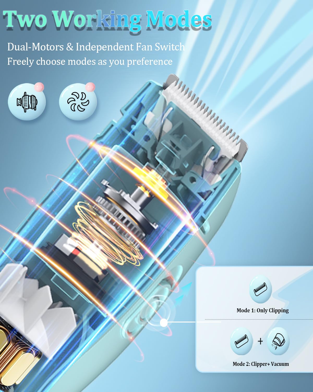 - 【 Two Operating Modes with Dual-Motor】Kid Hair clippers with two dual motor design, which have two modes, one is only clipper, another is clipper + vaccum work at the same time. This flexibility lets you adapt the trimmer to different scenarios, ensuring convenience whether you're in a hurry or prefer a more thorough cleaning process.