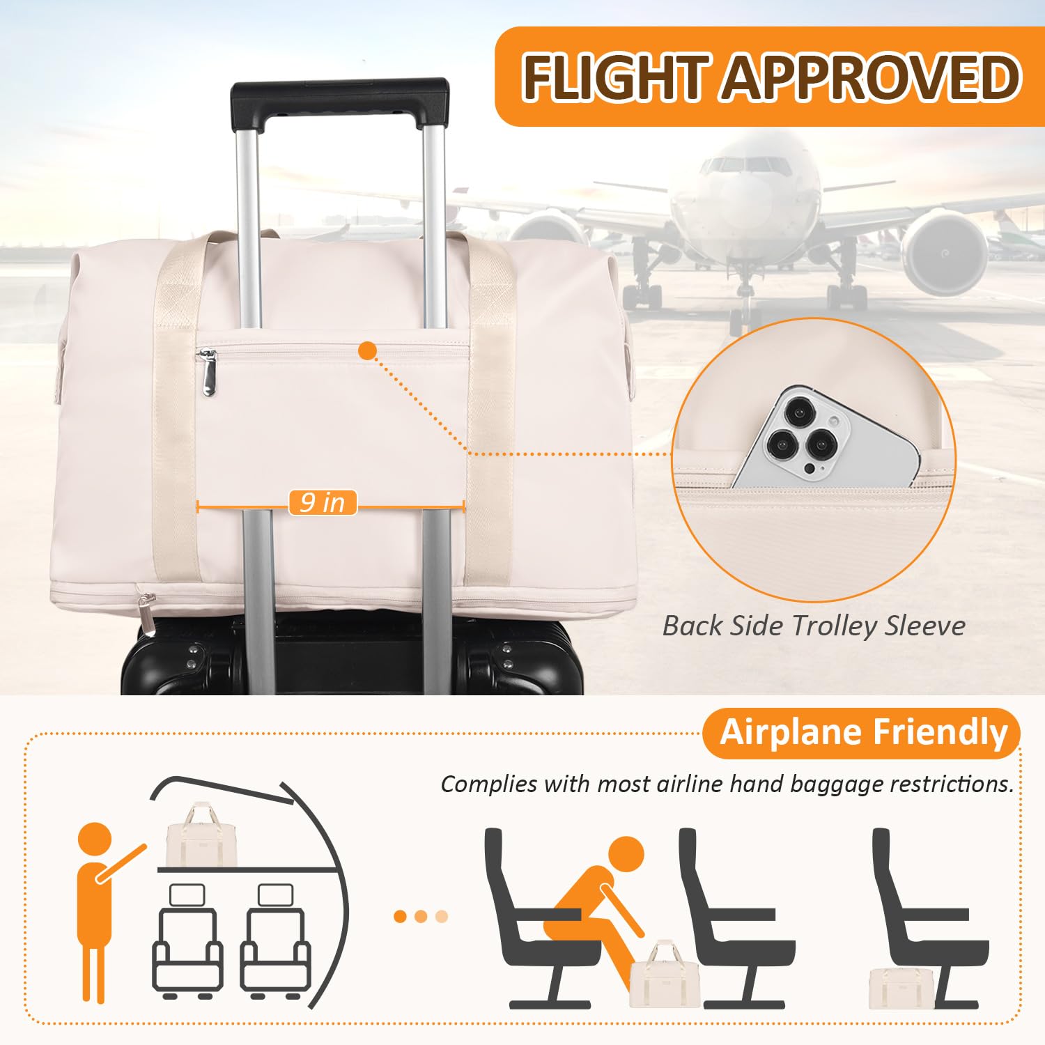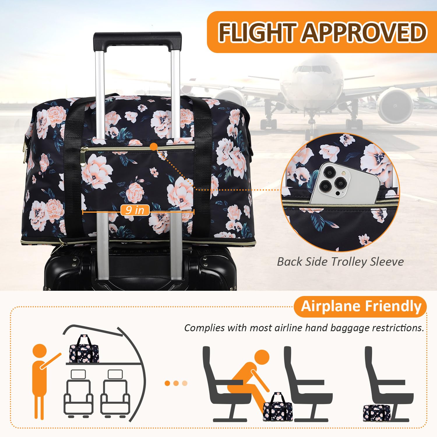- Airplane Friendly Travel Bag: Capolo lightweight duffle bag only 1.6 lbs, size 20.5 x 7.25 x 16.3 or 12.2 inches (extension height is 4.20 inches) meets most airline personal items carry on limits. The back side luggage sleeve zipper pocket not only helps you with hands-free but also easy access to your smartphone, Passport, plane tickets, ID card, etc. Your trip can be much easier and simpler with it.