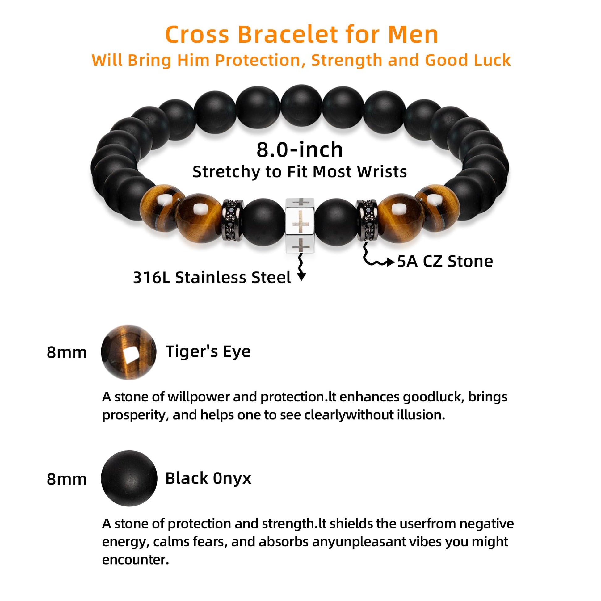 Express your faith and style with this exquisite Men's Tiger Eye Bracelet. Handcrafted from genuine natural stones, this bracelet combines tiger eye and matte black beads with a classic charm, creating a meaningful accessory that complements any outfit.Designed to be more than just cross bracelet, it’s a constant reminder of God’s love and guidance. Its strong elastic cord ensures a perfect fit, making it easy and comfortable to wear daily.This bracelet is an ideal Christian gift for men on special occasions like Easter, Father’s Day, graduations, or Christmas. Whether it’s a token of love or a symbol of faith, this bracelet brings joy, inspiration, and cherished memories for years to come