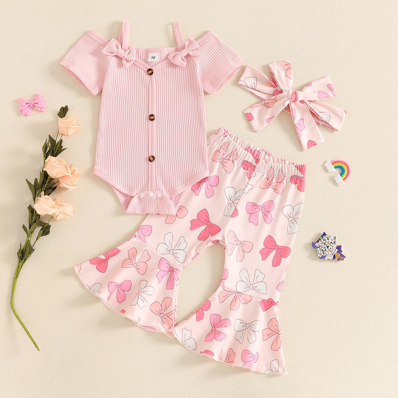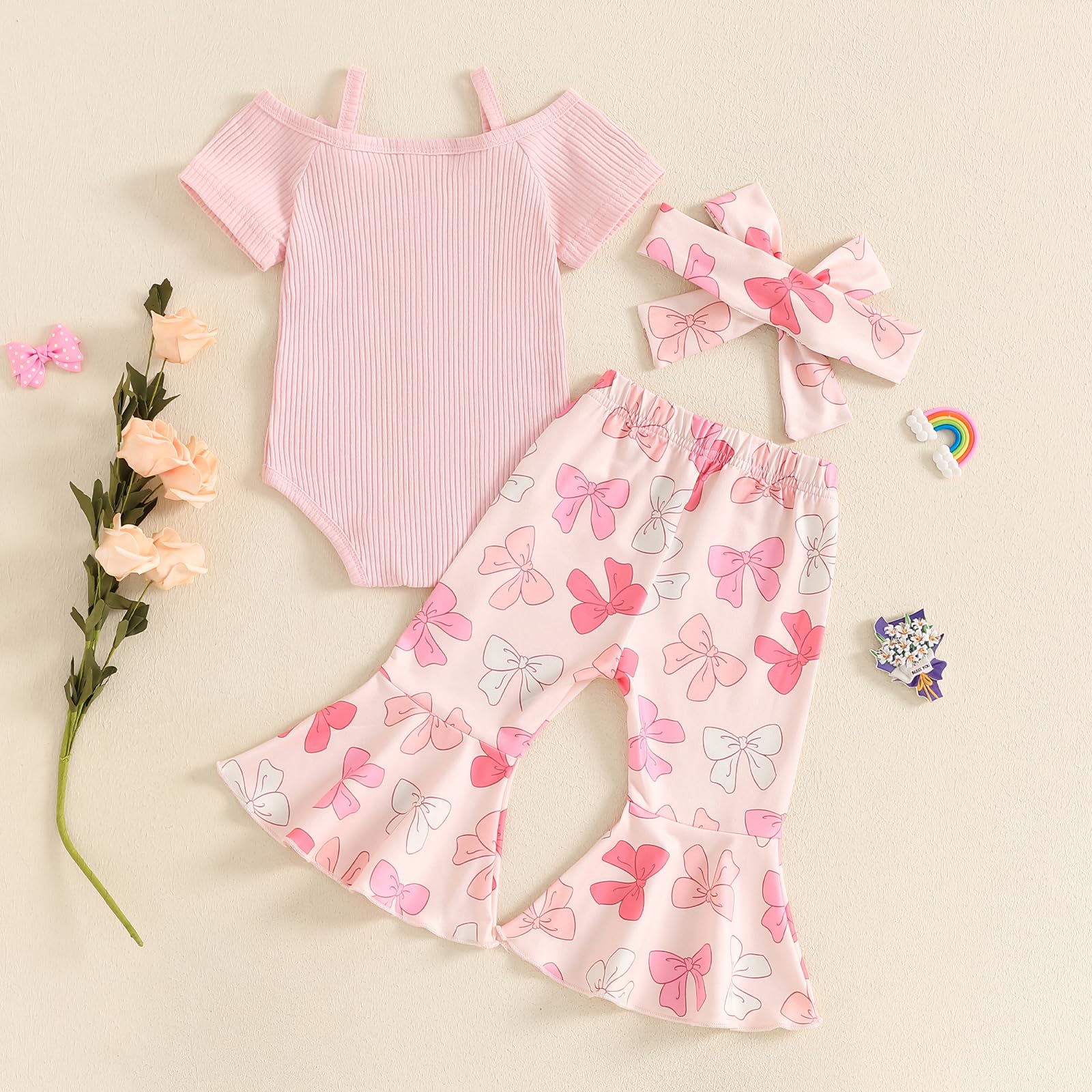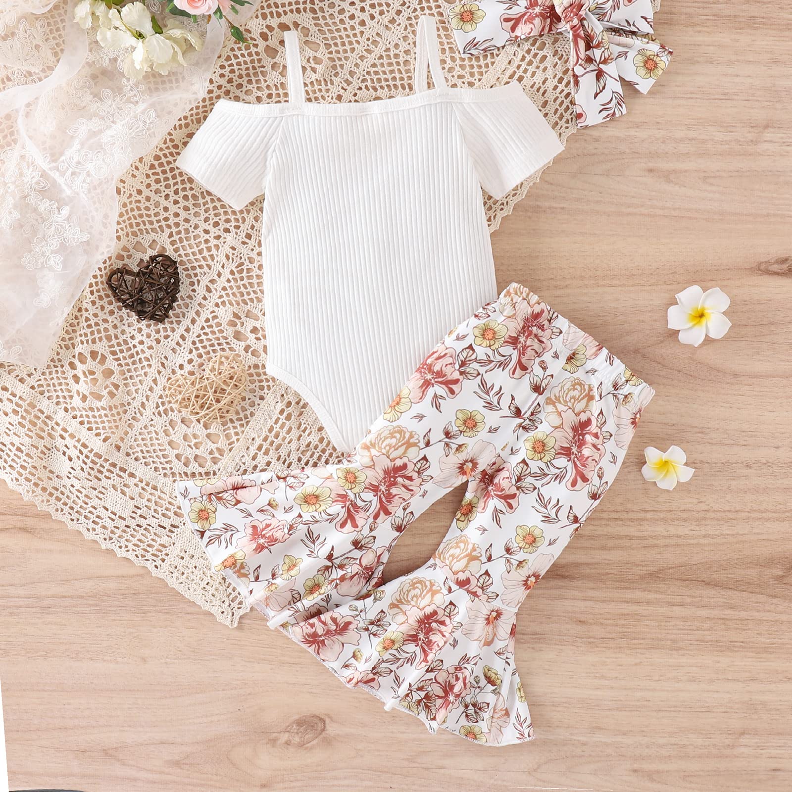- Package included:1Pc Romper+1Pc Flare pants+ headband. 3Pcs Baby Girl summer clothing sets.Machine washable, hang dry, do not bleach.