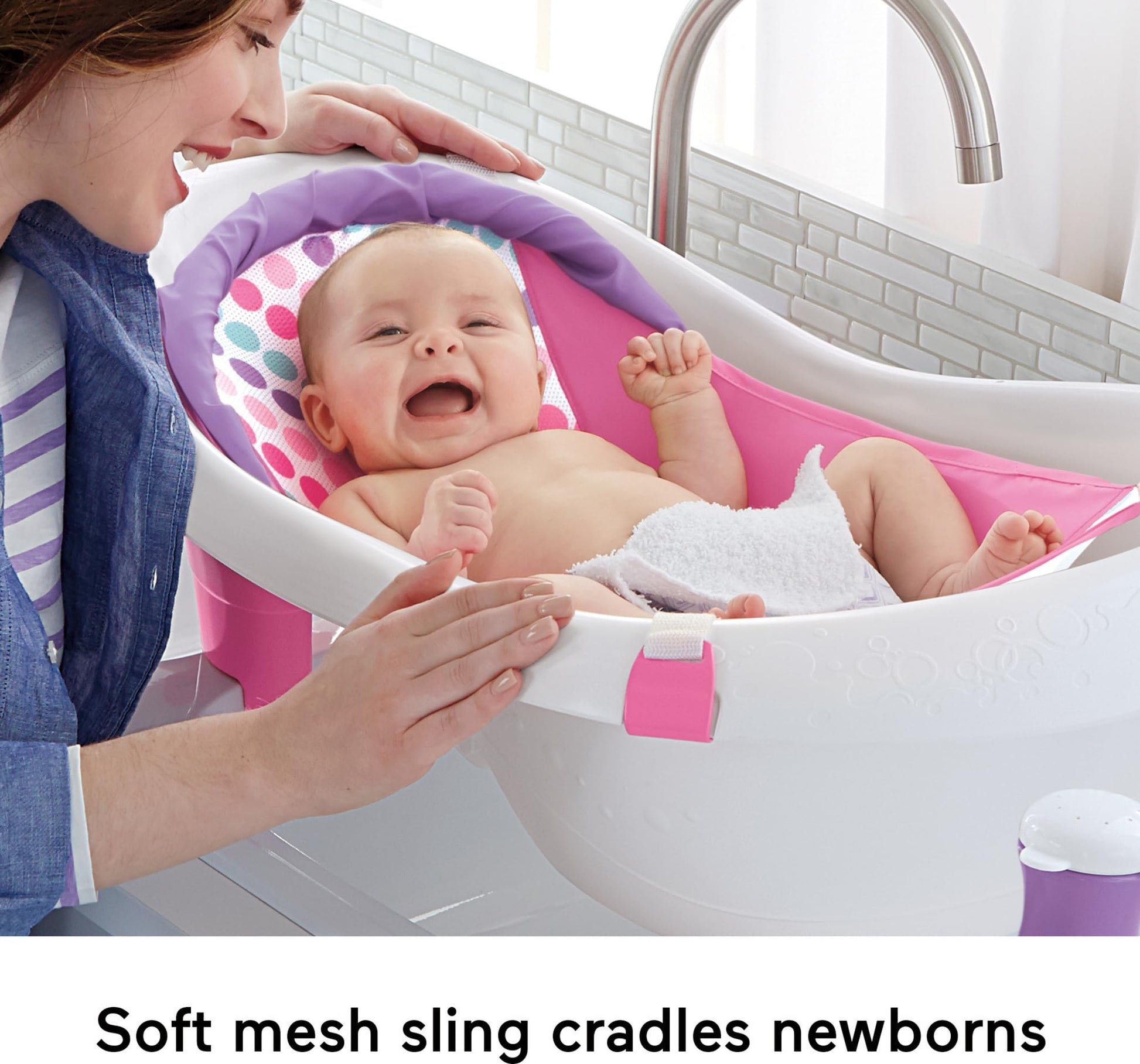 As your infant becomes a toddler, bath time goes from a sudsy soak, to a trip to the bubble-beard barber shop. Luckily, the Fisher-Price 4-in-1 Sling 'n Seat Tub can do it all: from the soft mesh sling built for baby's first bath, to a supportive seat for wobbly sitters, and a spacious toddler tub with a scoop and rinse bottle (for trimming that bubble 'do). This baby bath has four stages that adapt from newborn to toddler and all the splashes in between.