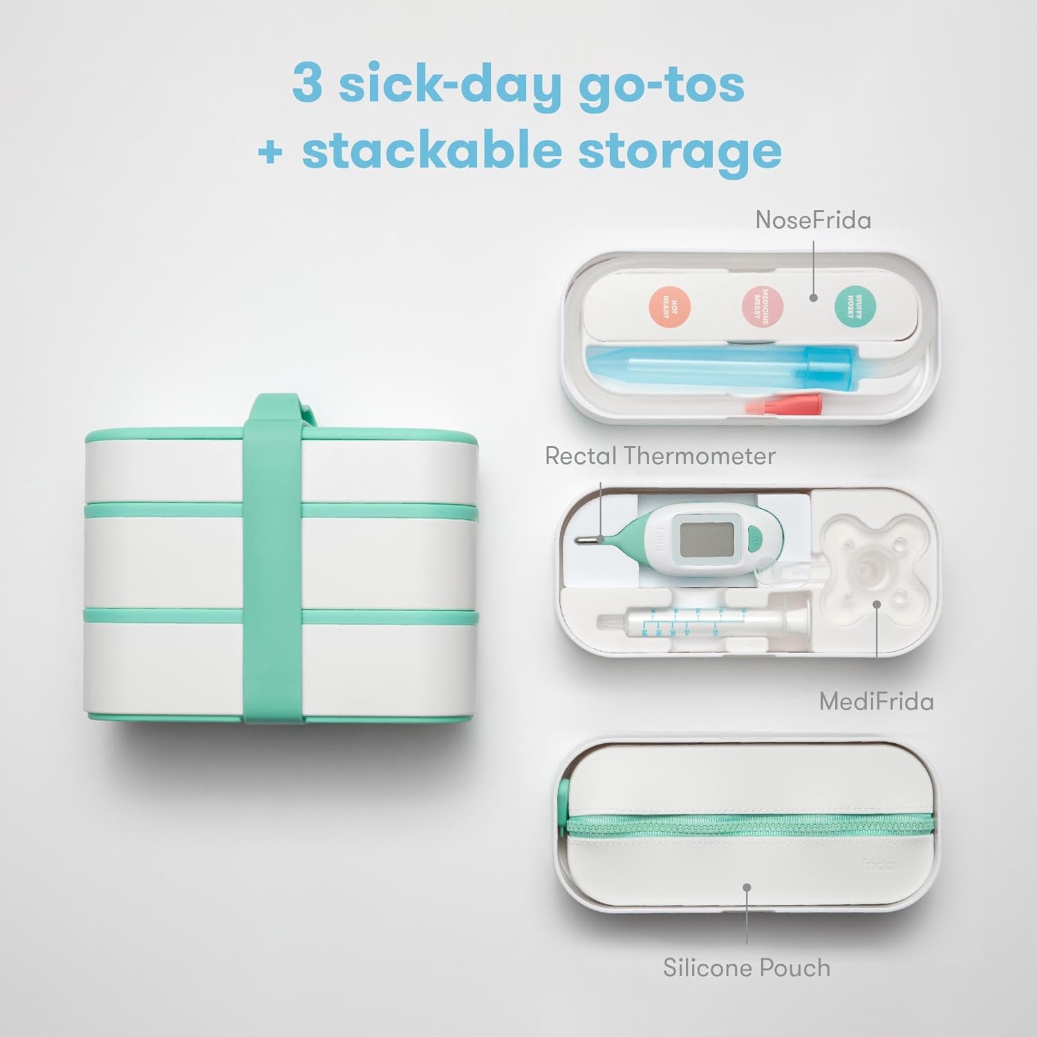 - LOADED: Stocked with NoseFrida nasal aspirator plus hygiene filters, MediFrida pacifier for medicine, Rectal Thermometer for accurate temperature taking and a pouch.