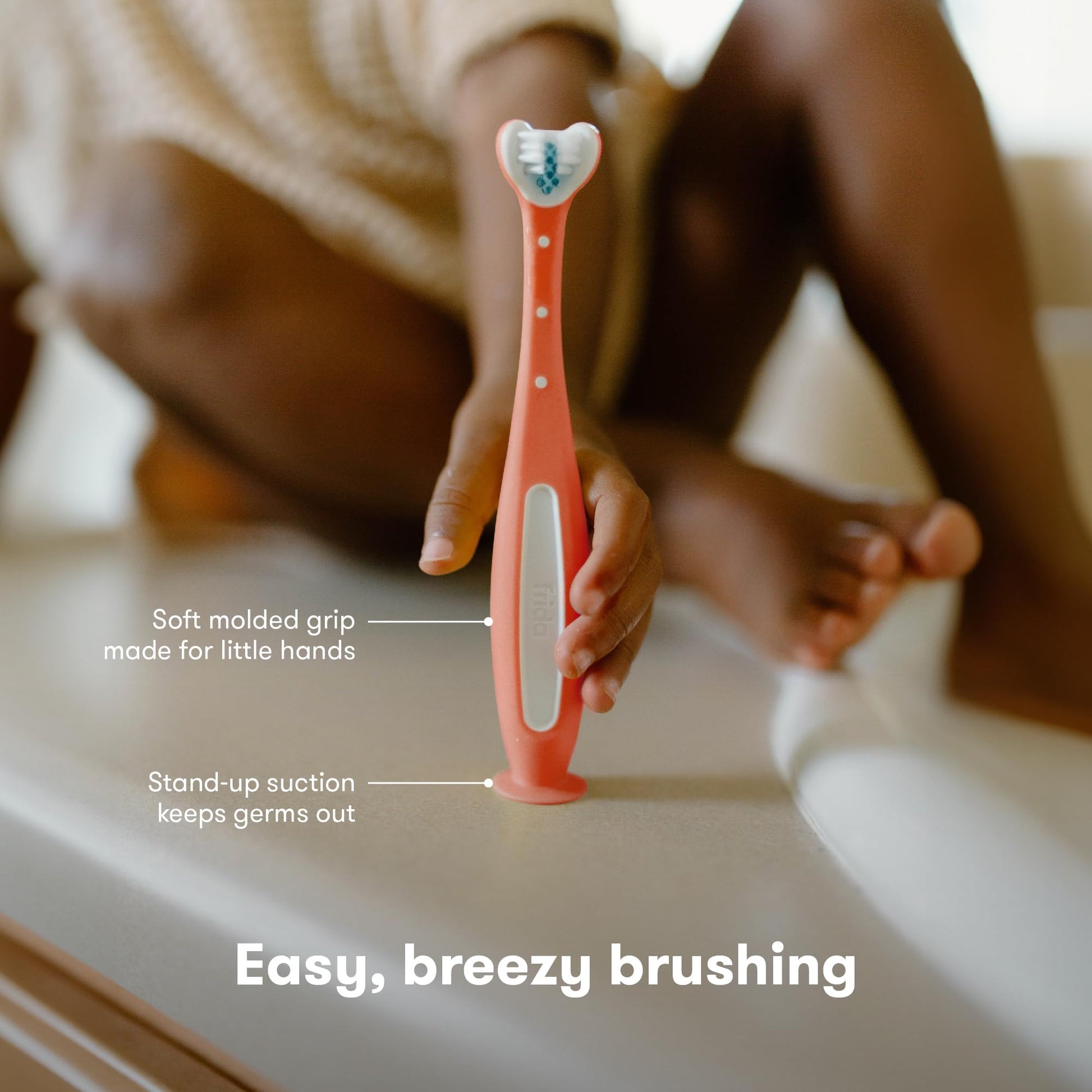 Brushing a toddler’s teeth can feel like a battle. The Triple-Angle Toothhugger makes quick work of cleaning small teeth, thanks to its 3-sided brush head which brushes all sides of the teeth in one go. With super-soft, gentle bristles that change color to let you know when it’s time to replace, the Toothhugger helps kids learn and practice good oral hygiene at an early age.