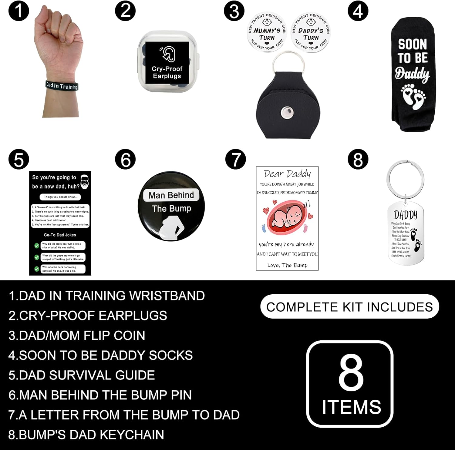 - What's Inside – 8 must-have items for new dads: "Dad in Training" wristband, "Man Behind the Bump" pin, cry-proof earplugs, soon-to-be daddy socks, dad survival guide, decision flip coin, heartfelt letter from baby, and a dad keychain.