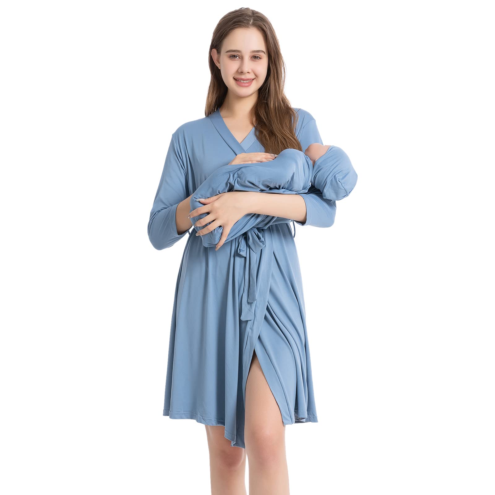 Galabloomer Maternity Robe and Baby Receiving Blanket, Matching Mommy Labor Delivery Robe and Swaddle Set Denim blue