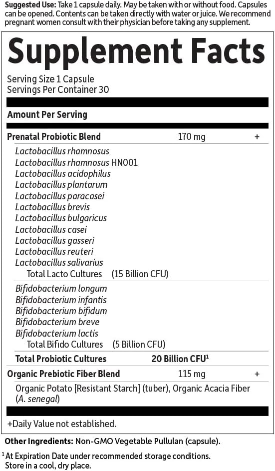 - DOCTOR FORMULATED PROBIOTICS FOR DAILY DIGESTIVE AND IMMUNE SUPPORT: Once Daily Prenatal Probiotic provides 20 Billion CFU and 16 Probiotic Strains plus Prebiotic Fiber, for probiotic and prebiotic support during pregnancy and lactation