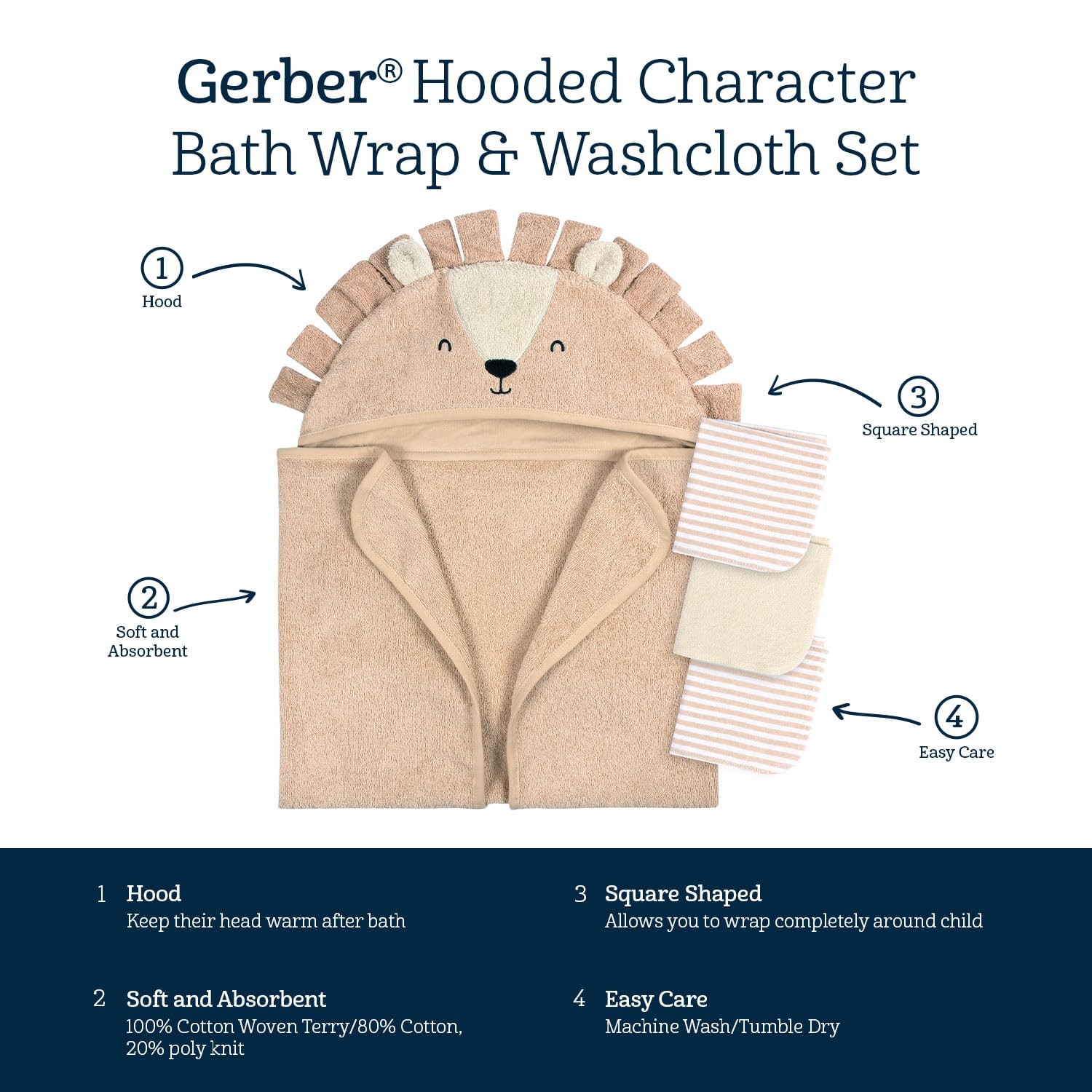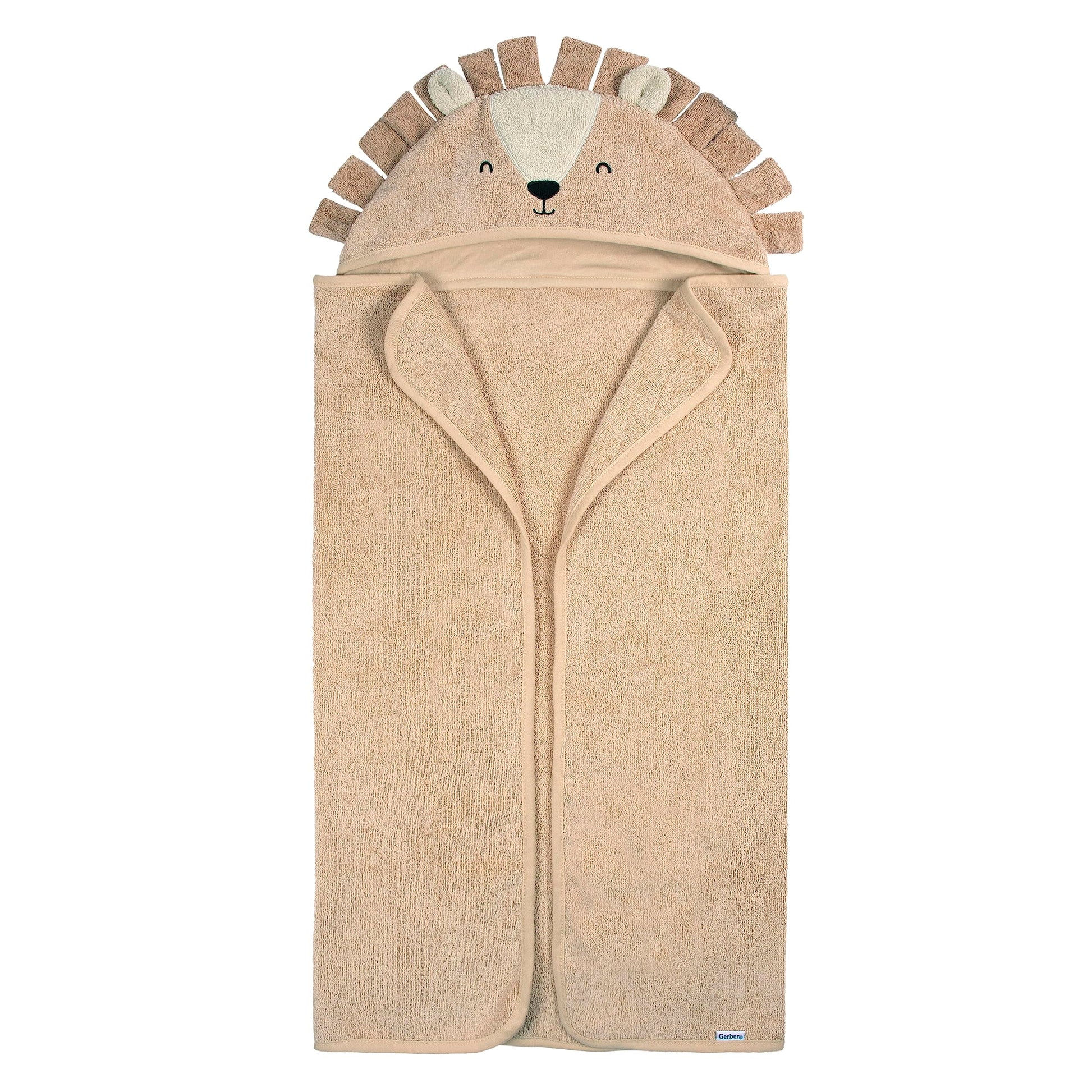 Gerber Baby 4 Piece Animal Character Hooded Towel and Washcloth Set, Brown Lion, One Size