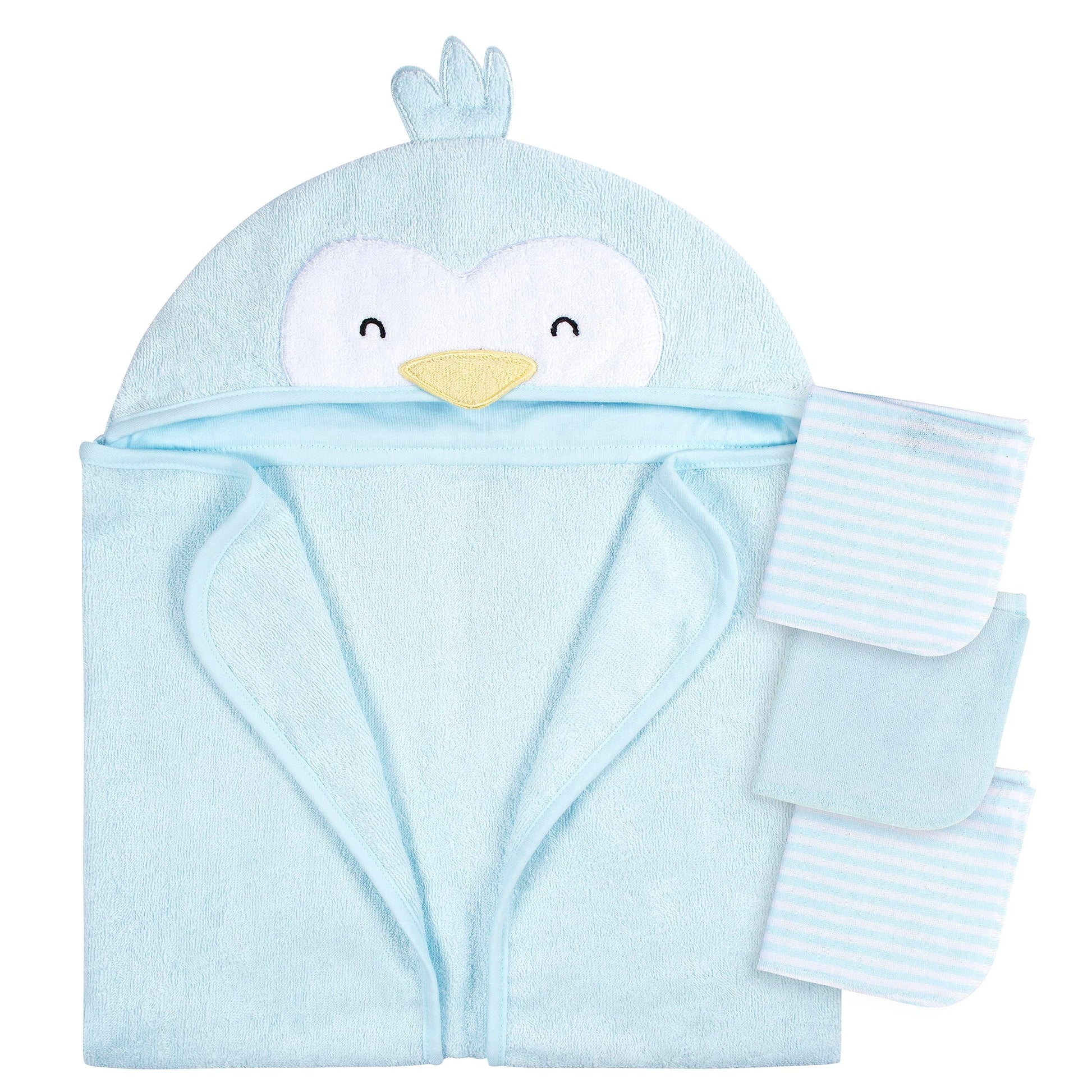 - Includes one adorable animal character hooded towel and three matching washcloths